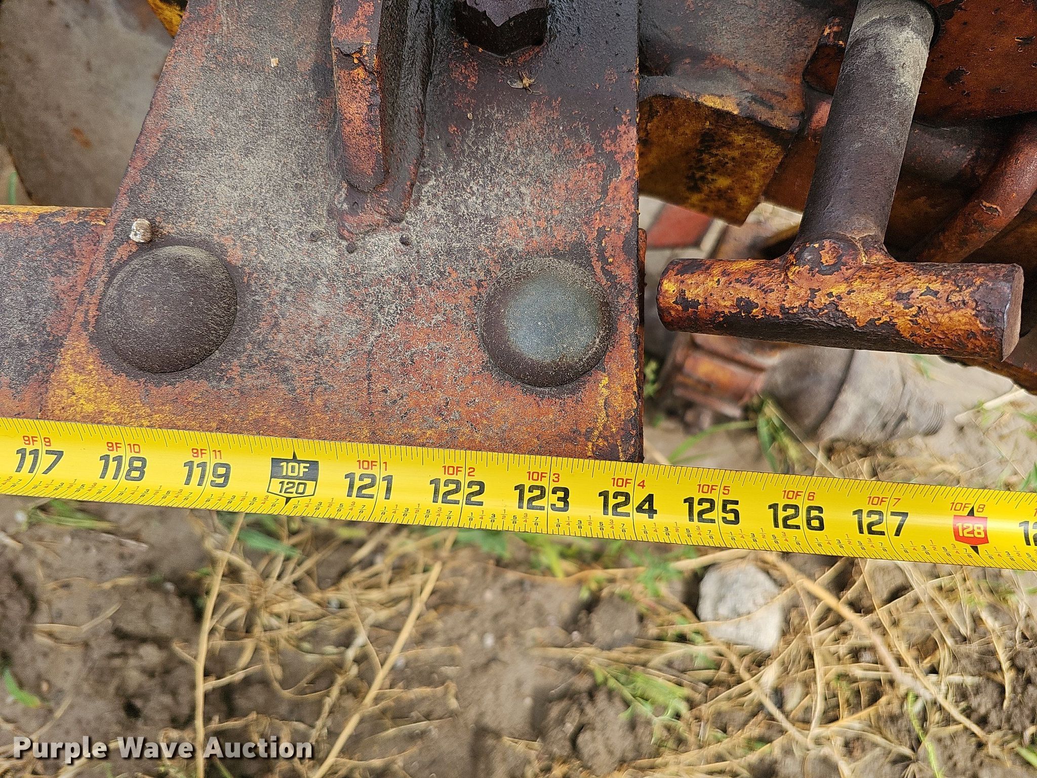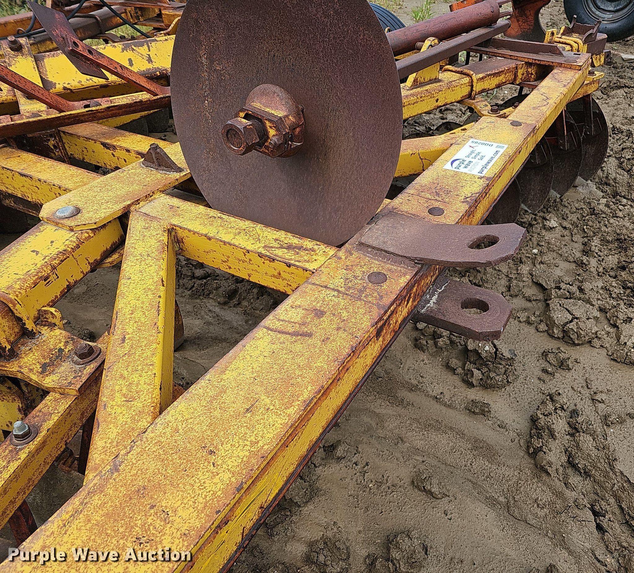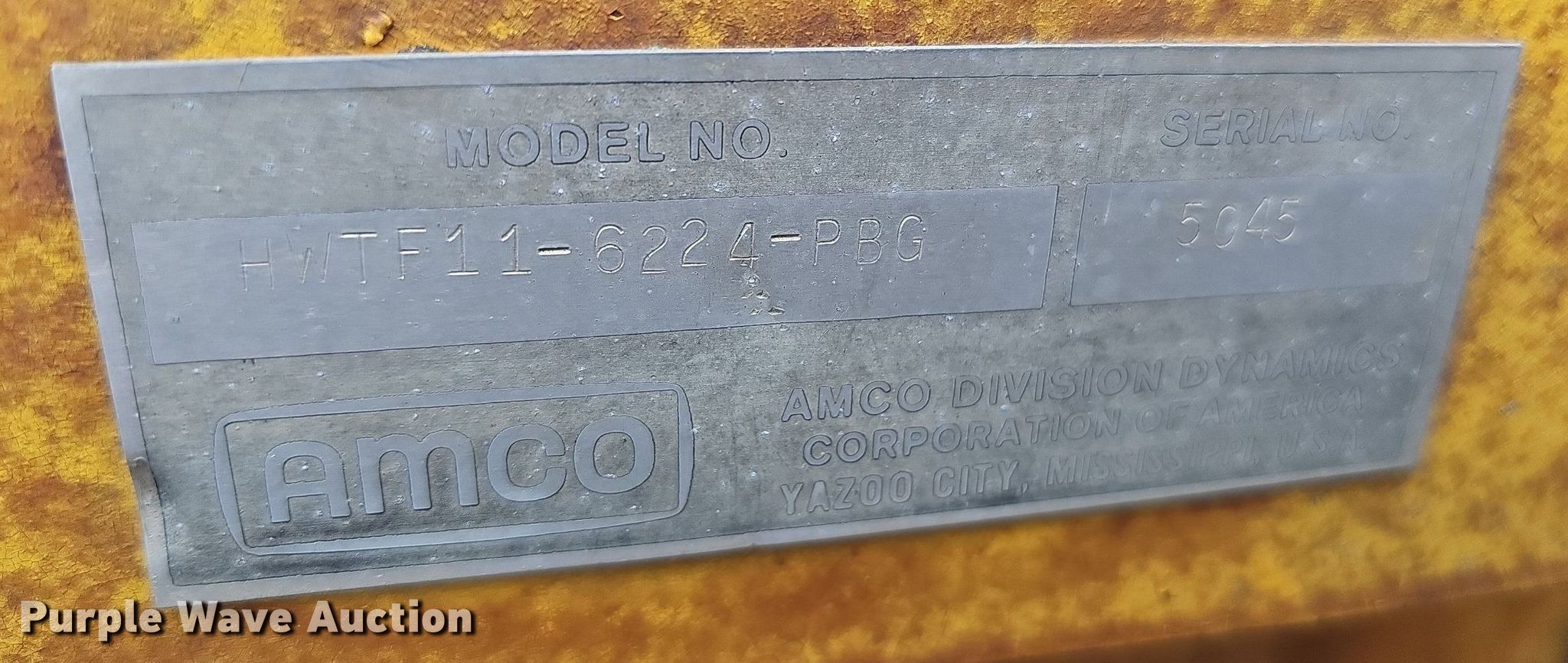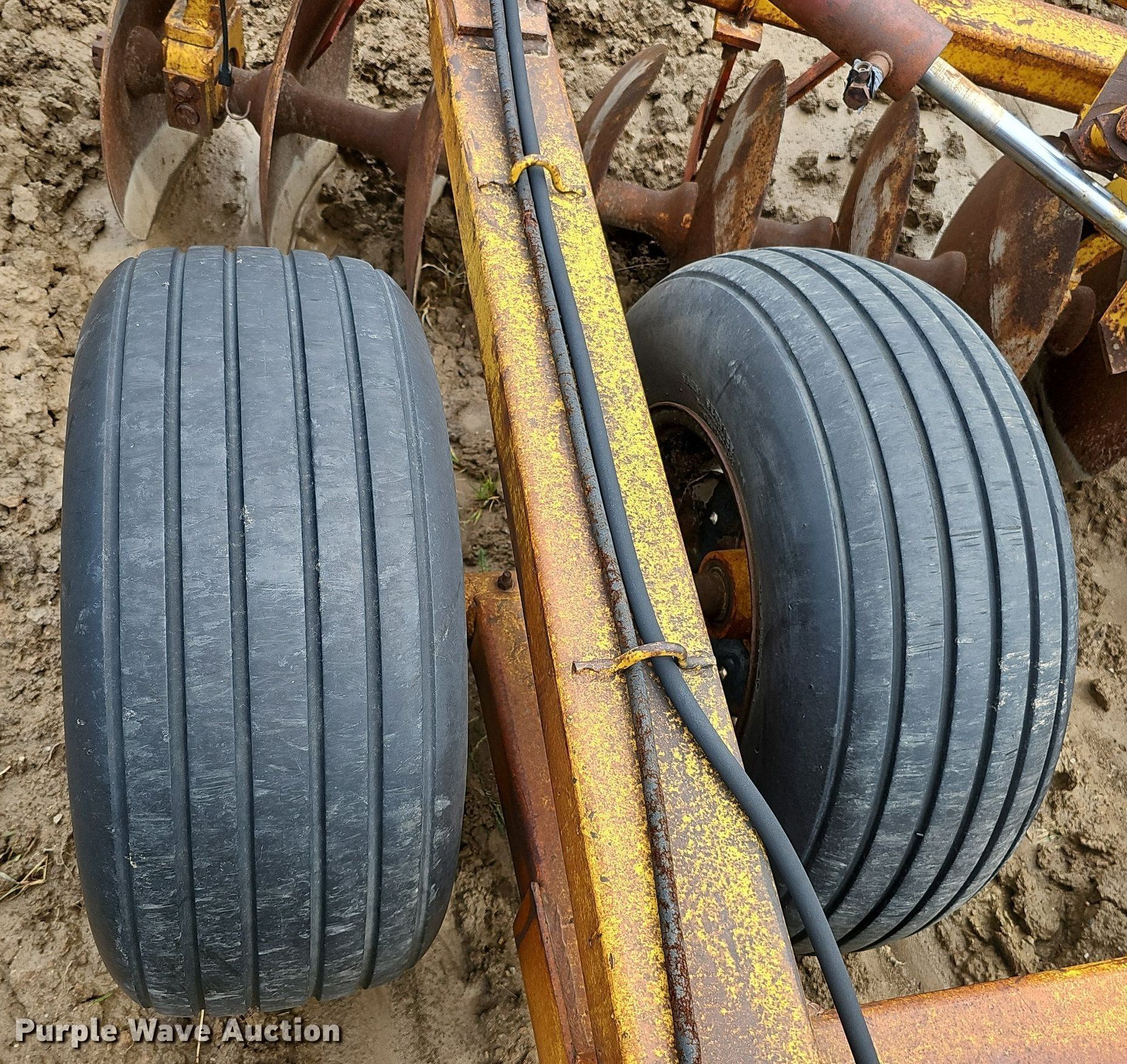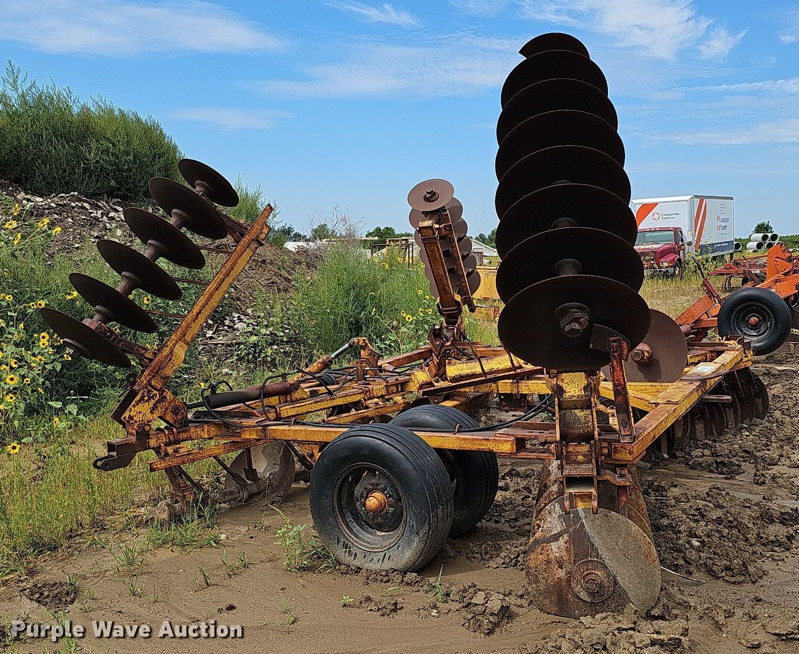 Amco HWTF11-6224-PBG double off-set disk. Overall width: 20', Serial: 5045. Features Front blades Diameter: 21", Spacing: 9", Rear blades Diameter: 21", Spacing: 9", Disk scrapers, Operation Hydraulic fold, Leveler: Manual, Attachments Rear hitch. Tires Tire size: 11L-15. Notes One section broke off. VanKirk Bros. Contracting. 31940 Road Y. Sutton, NE 68979