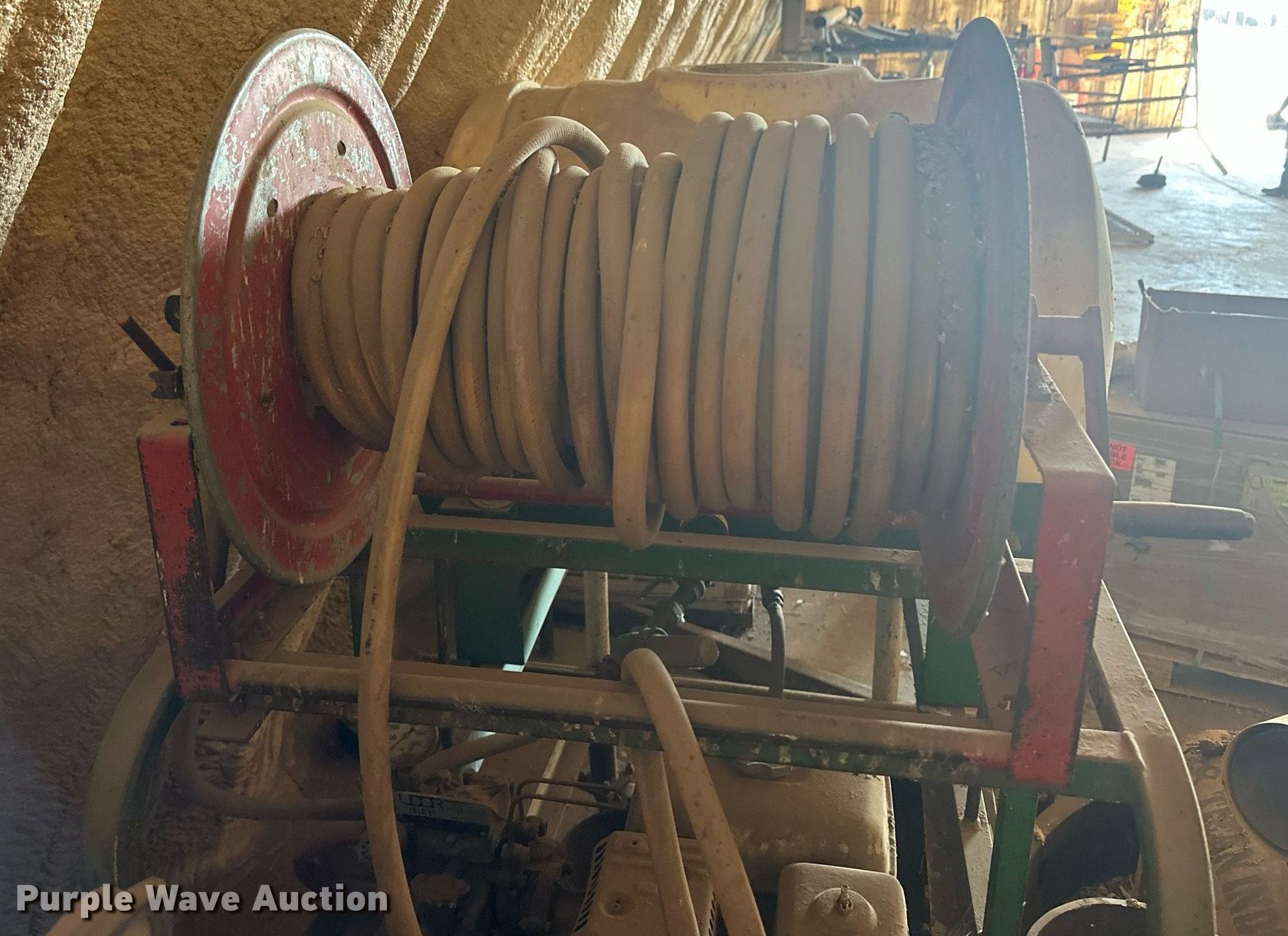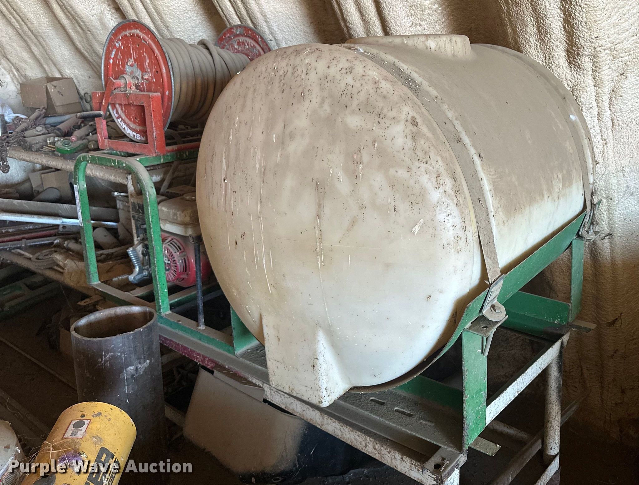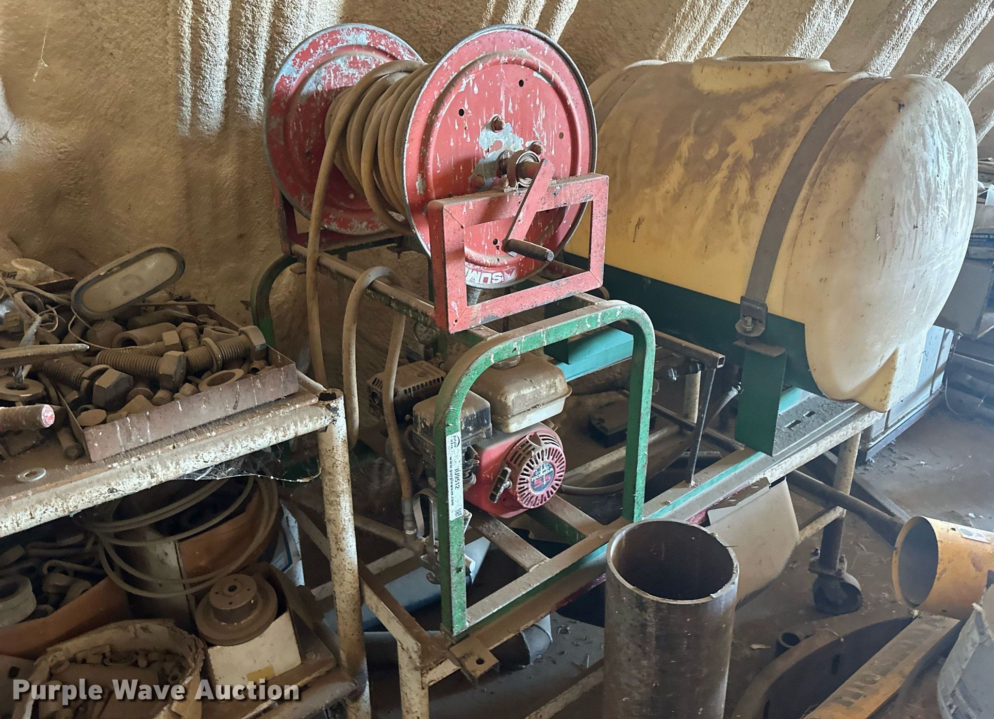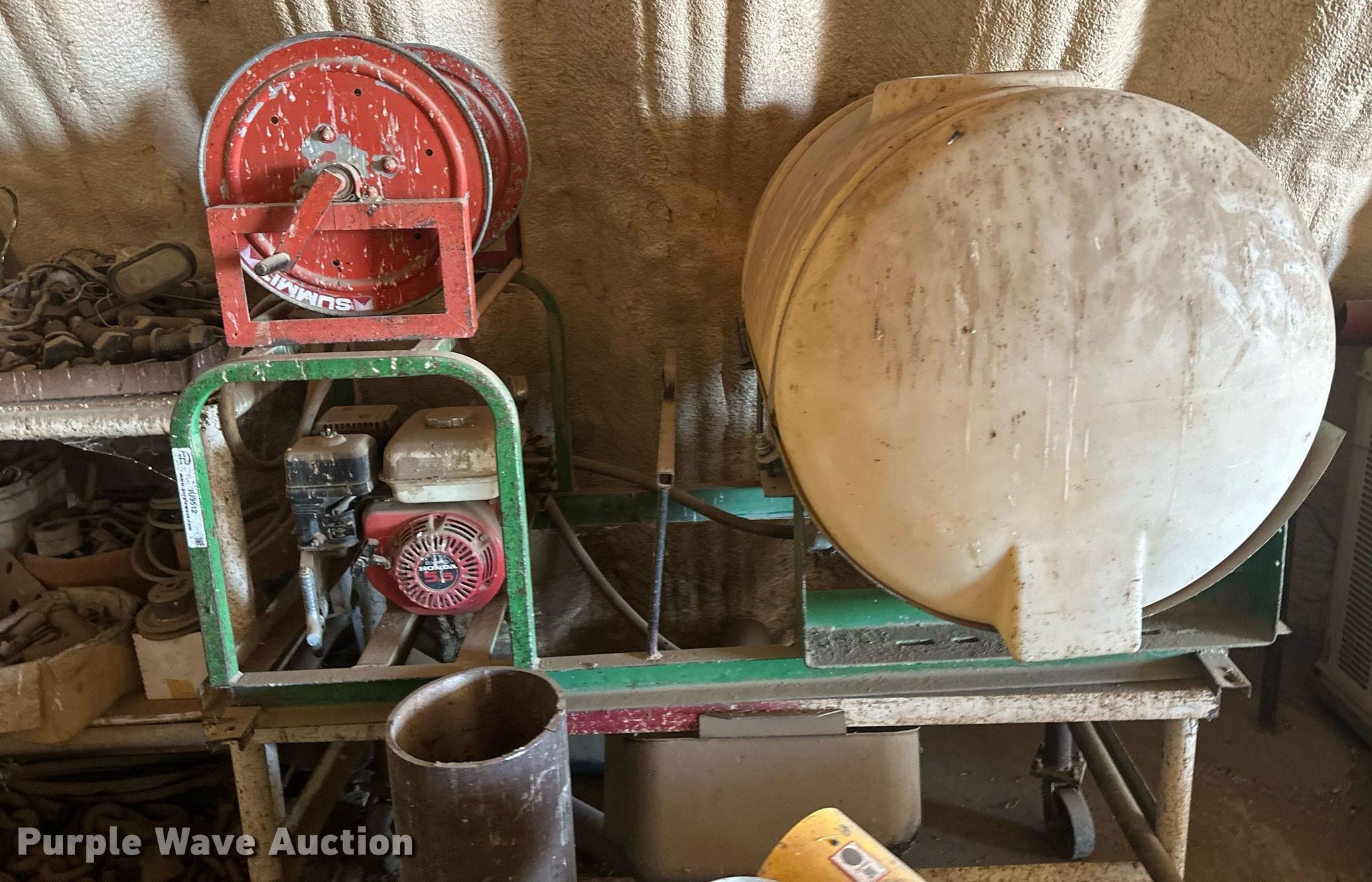 Sprayer. 64"L x 28"W, 110 gallon poly tank, Honda 5.5 HP gas engine, Hose reel, Spray wand, Cart not included. Cobalt Cattle Company. 19016 Rd I. Kismet, KS 67859