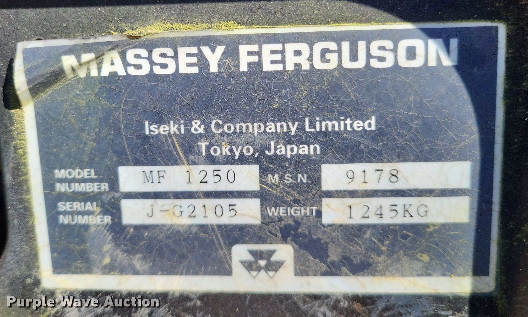 2000 Massey Ferguson 1250 MFWD tractor. Hours: 2,065 on meter, Serial: JG2105. Engine Iseki TK532, Displacement: 1.5L, Cylinders: 4, Fuel type: Diesel, HP: 34. Transmission Synchro, 16F - 16R, Left-hand reverser, Differential lock. Features PTO: 540, Three point, Loader Massey Ferguson MF-1246, Controls: Joystick, Bucket Width: 60".. Tires Front: 10-16.5, Rear: 14.9-24. Notes Dead battery. Walker Products, Inc.. Bourbon, MO 65441