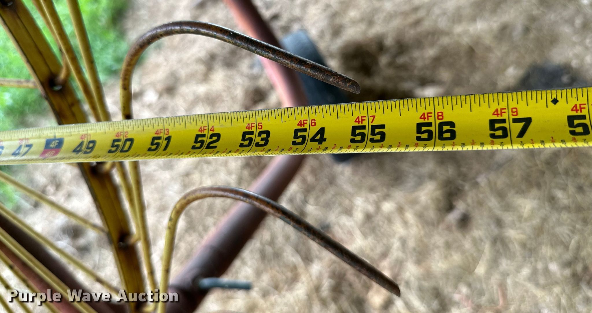 National RCS 3 hay rake. Serial: 8699. Features Wheels: 8 Diameter: 55", Hydraulic fold, Ground driven. Tires Size: P175/65R14. Jay, OK 74346