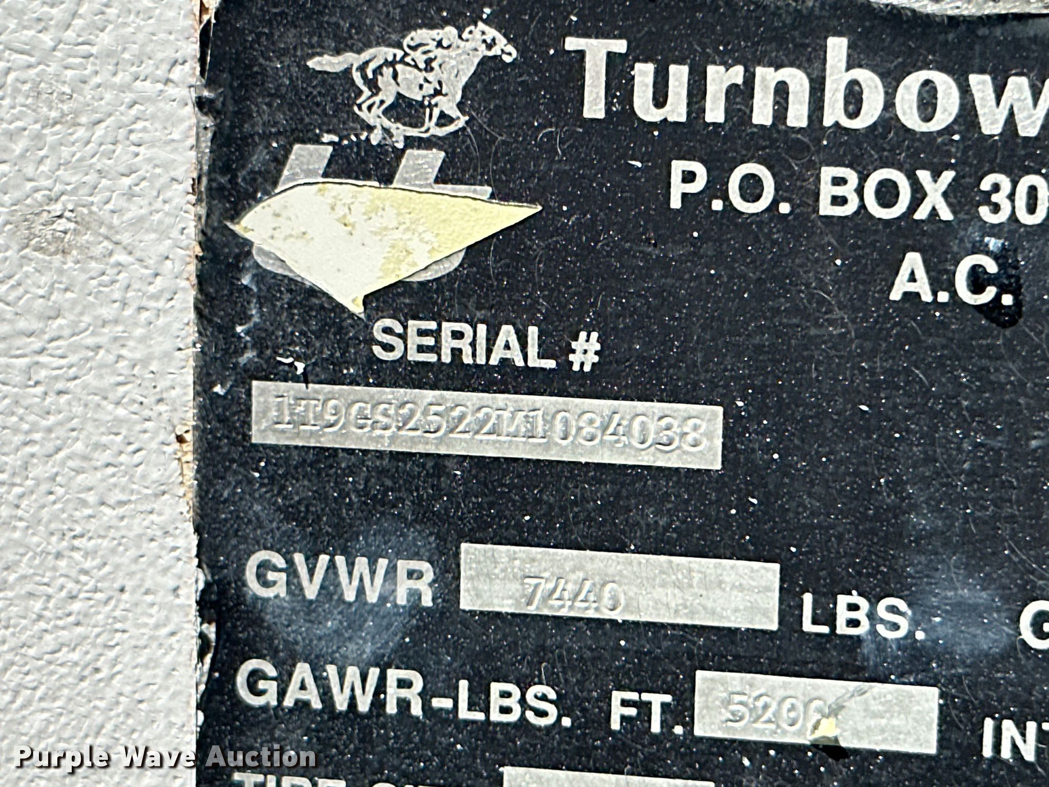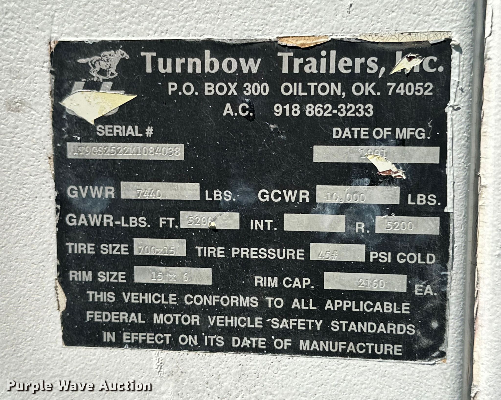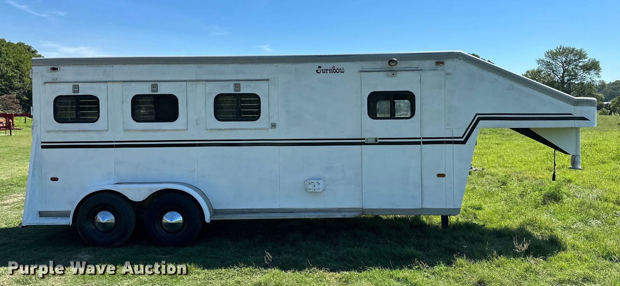 1991 Turnbow Trailers horse trailer. VIN: 1T9GS2522M1084038. Dimensions Overall: 26' L x 7' 8" W, Body: 19' 6" L x 6' W, Side height: 7'. Features Horse capacity: 3, Center gates: 2, Rubber floor mat. Chassis Hitch: Gooseneck, Landing gear: Single, Suspension: Spring, Brakes: Electric, Axles: Tandem, GVWR: 7,440 lbs, GAWR: 5,200 lbs. Tires Size: 7.00R15. Transfer of ownership documentation will be a bill of sale. Miami, OK 74354
