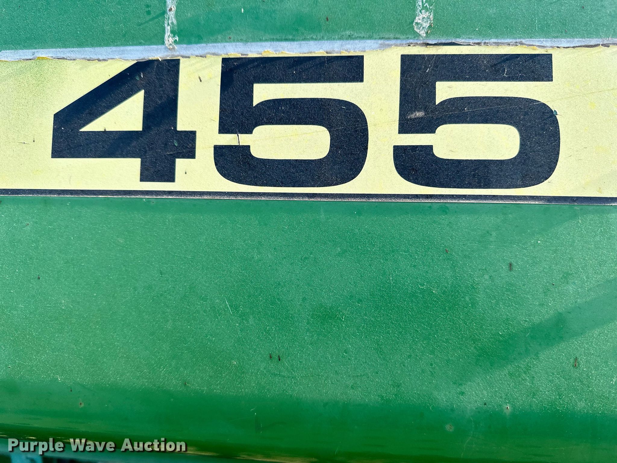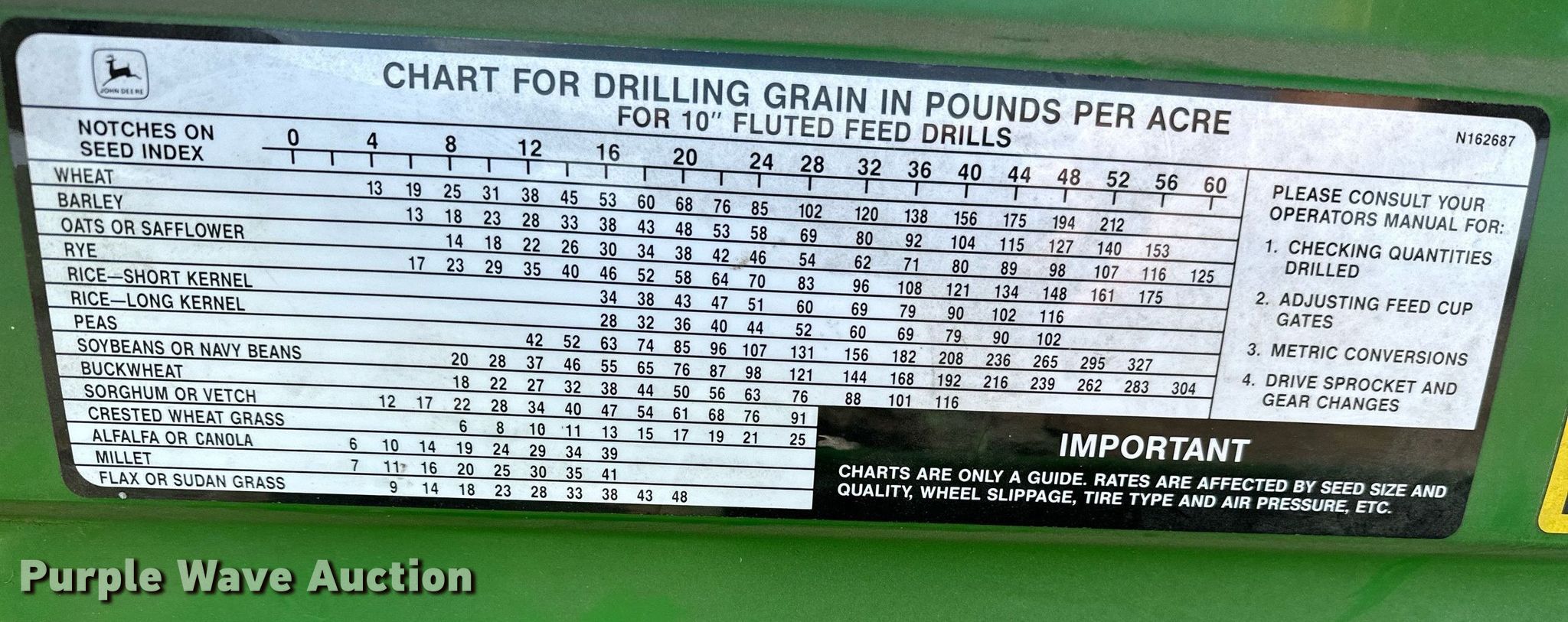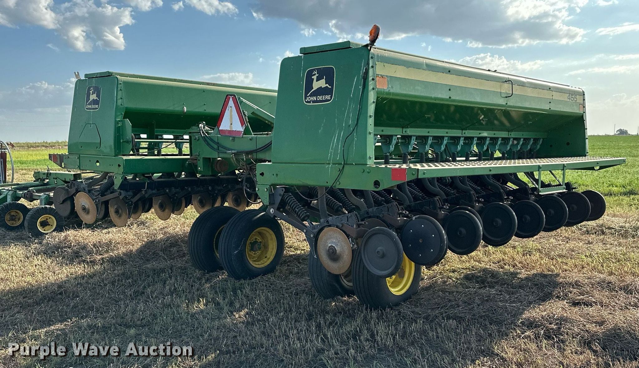Purple Wave is selling a used Grain Drill or Seeder in Kansas. This item is a John Deere 455 grain drill with the following: Width: 25', Row units: 30, Row spacing: 10", Serial: N00455H001493