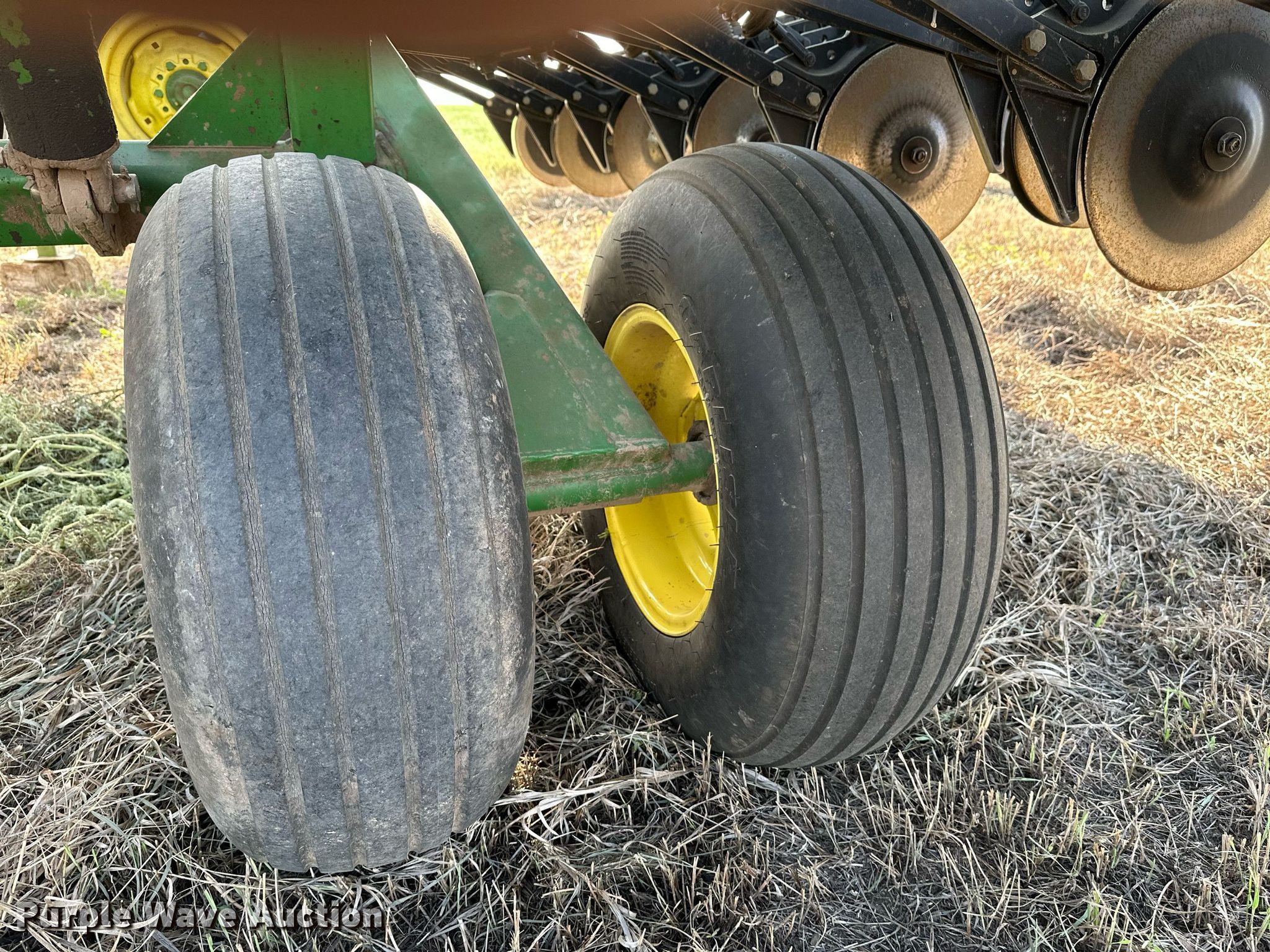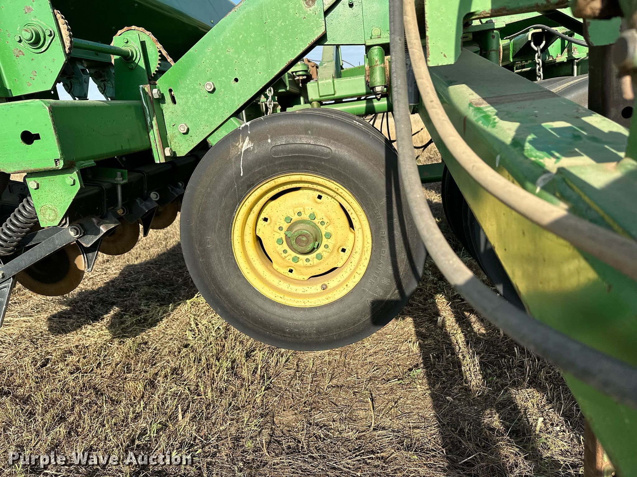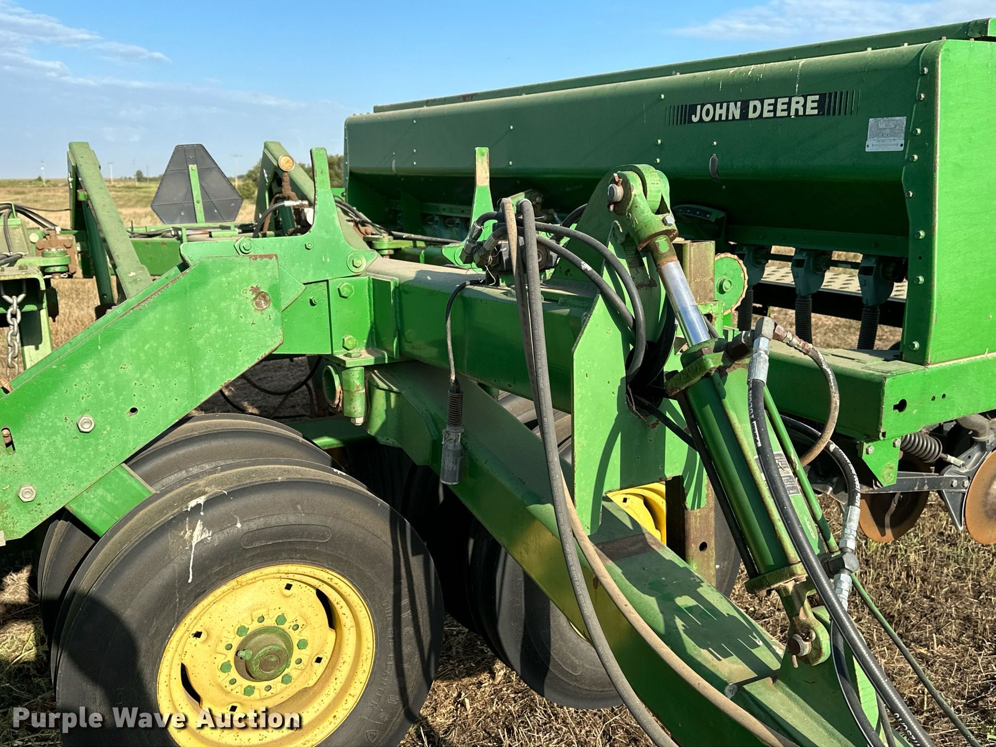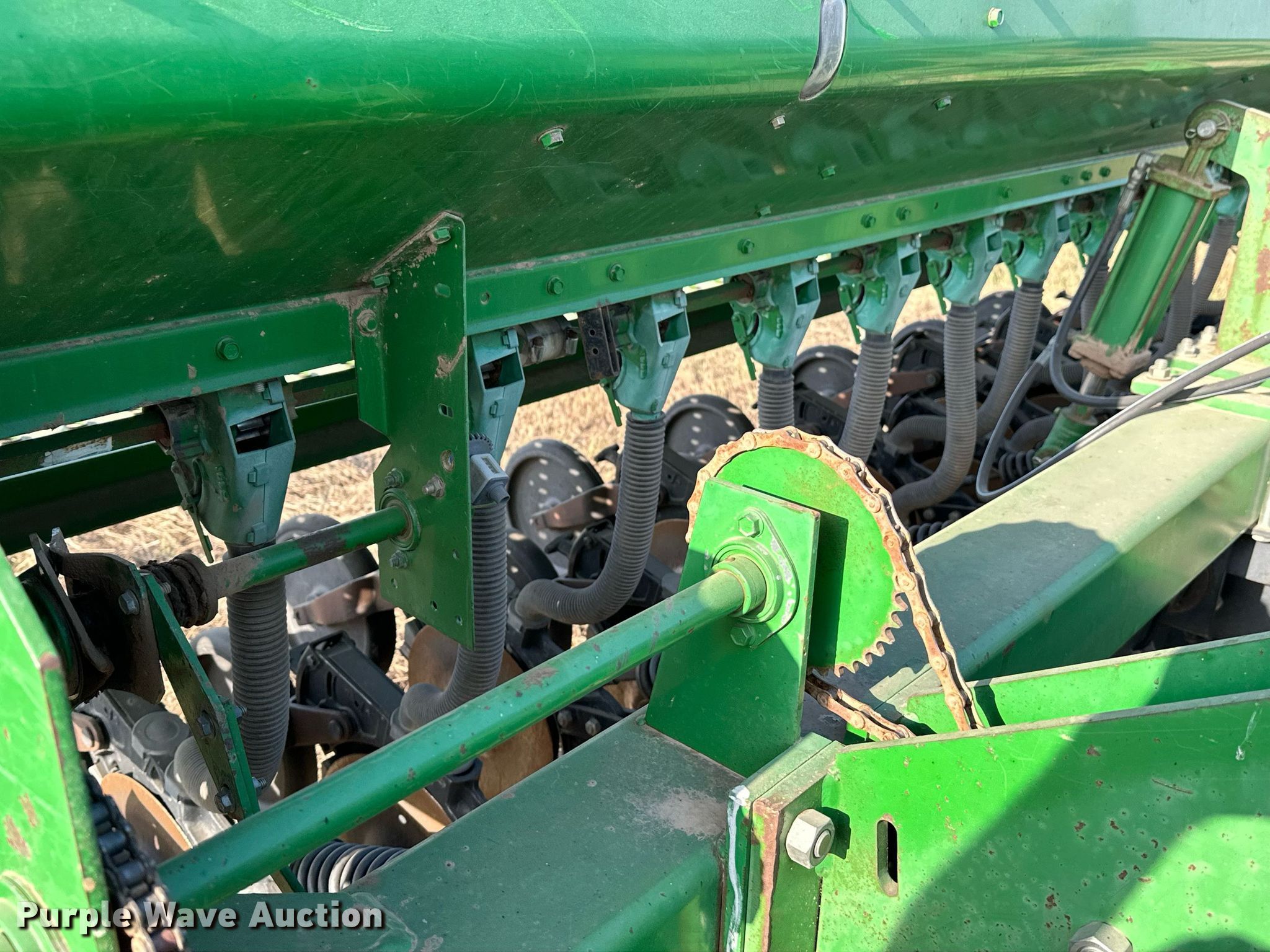 John Deere 455 grain drill. Width: 25', Row units: 30, Row spacing: 10", Serial: N00455H001493. Features Frame Front fold, Seed delivery Bulk fill system, Row units Meter drive: Ground, Down pressure: Spring, Disk openers: Double, Closing system: Single Type: Rubber.. Tires Transport tire size: 11L-15 Quantity: 4, Drive/ outside tire size: 7.60-15 Quantity: 4. Geneseo, KS 67444