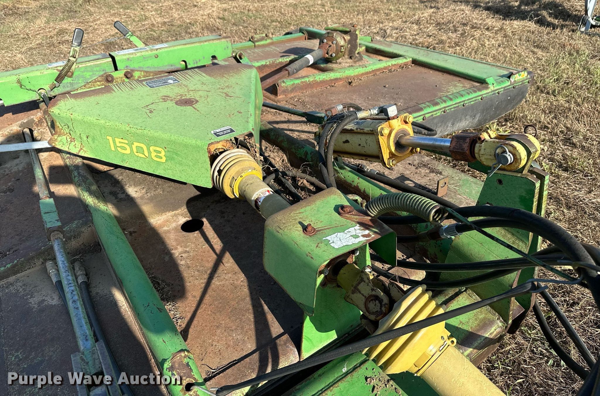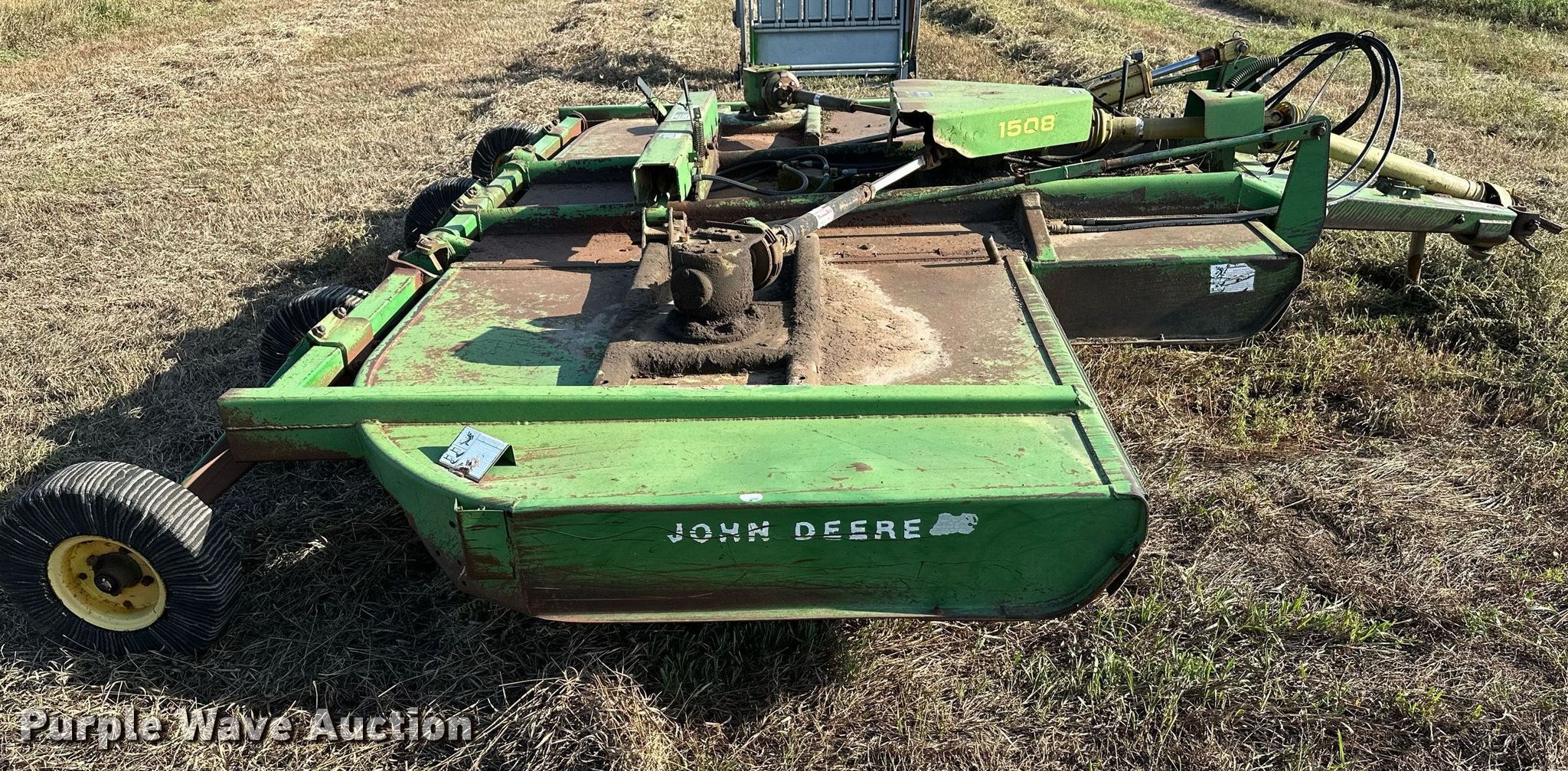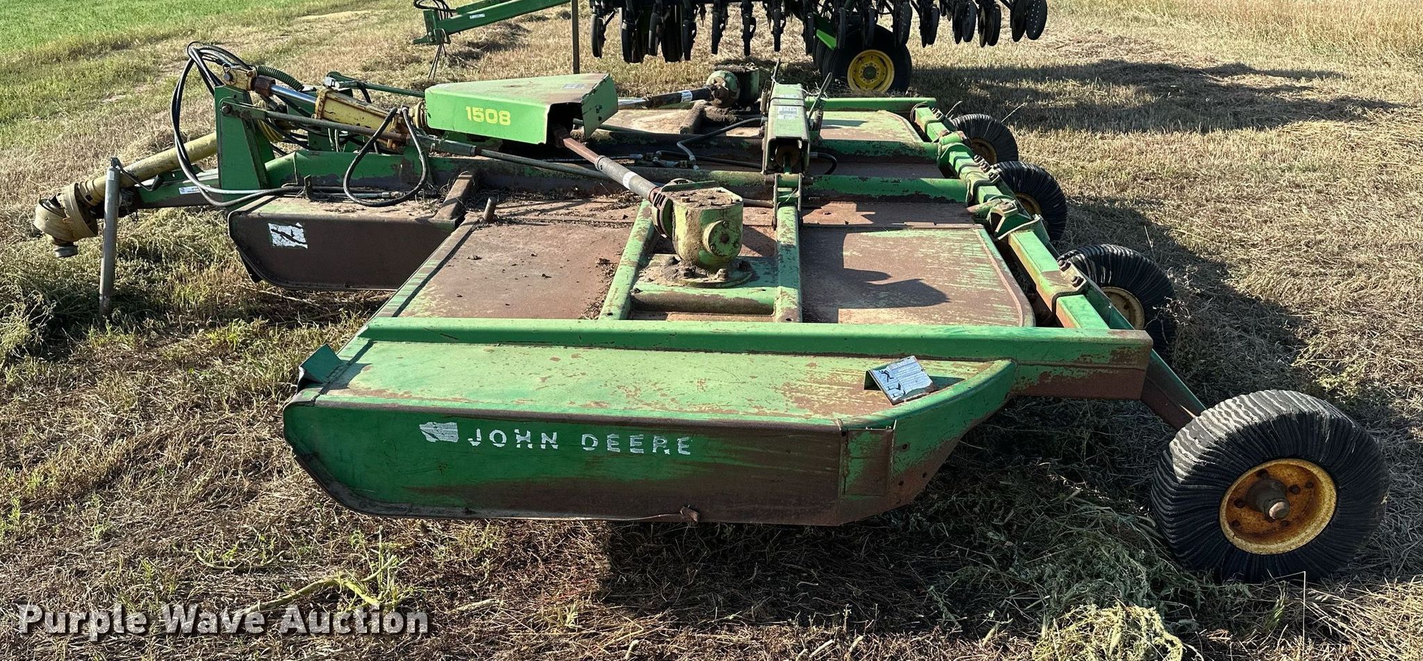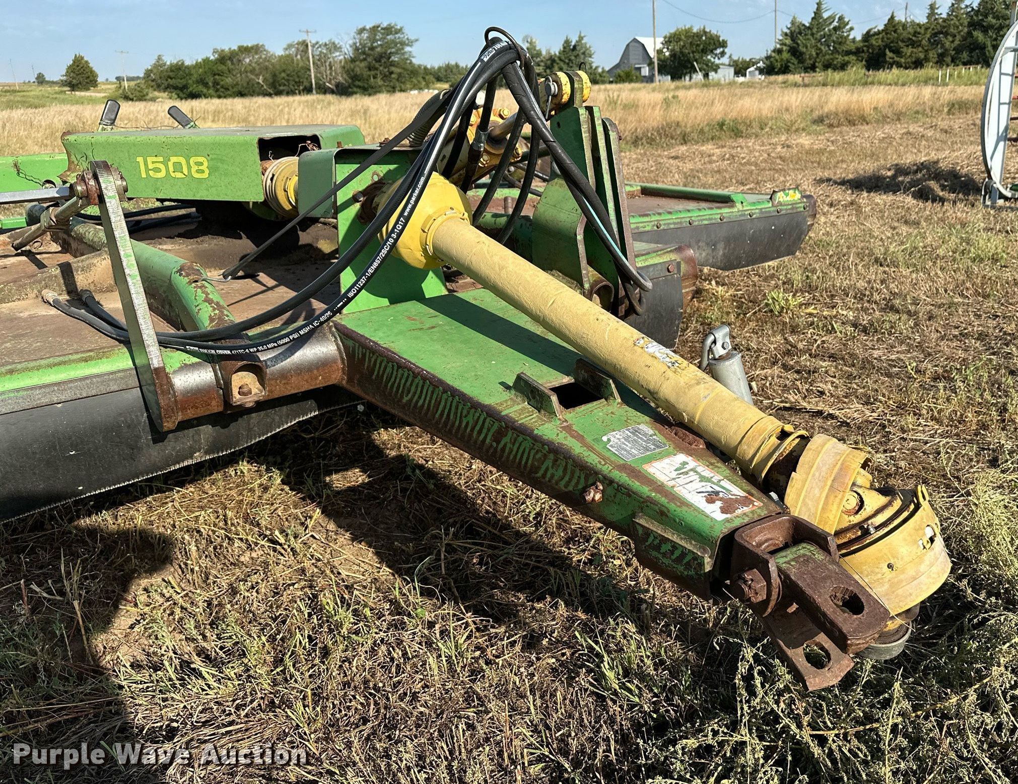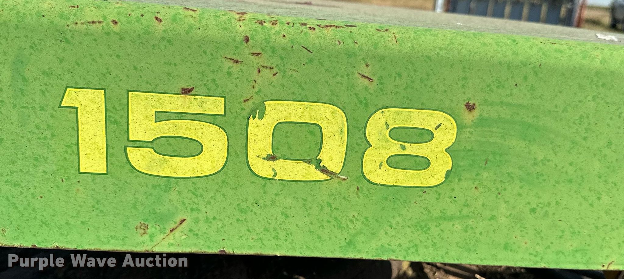 John Deere 1508 rotary mower. Serial: W01508F027486. Features Width: 15', Hydraulic lift, Hydraulic fold, PTO: 1000. Tires Solid. Geneseo, KS 67444