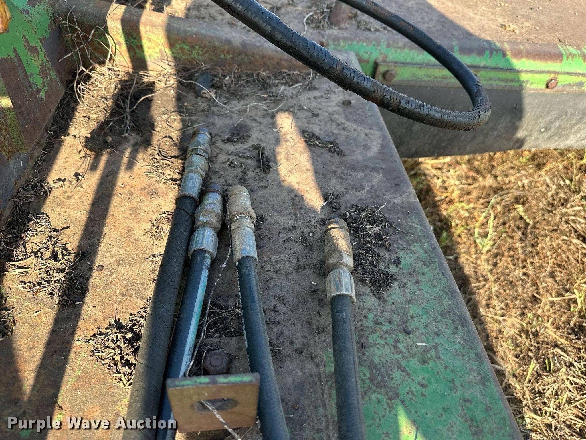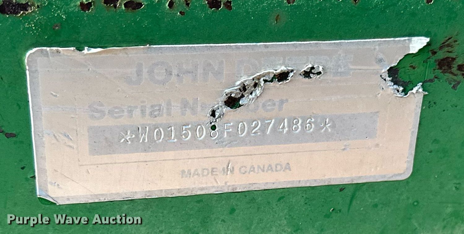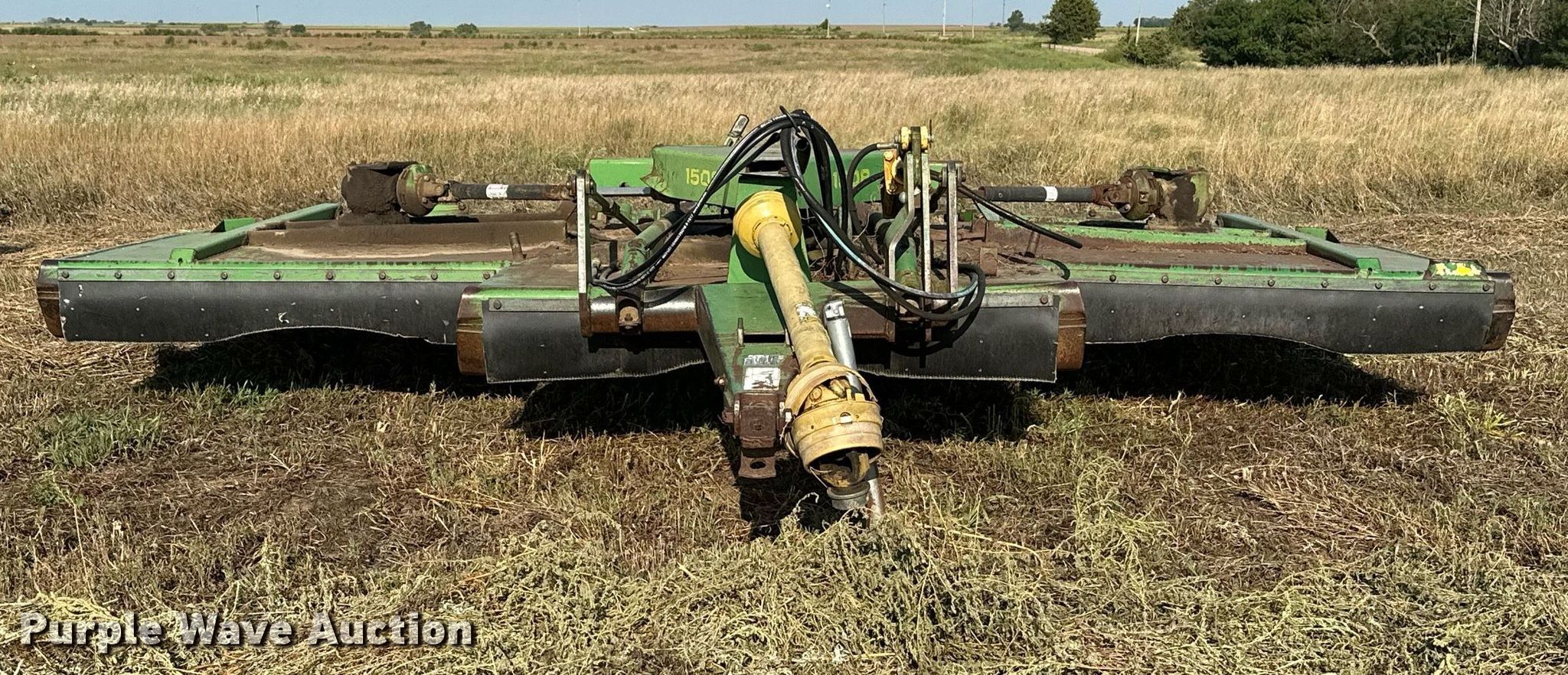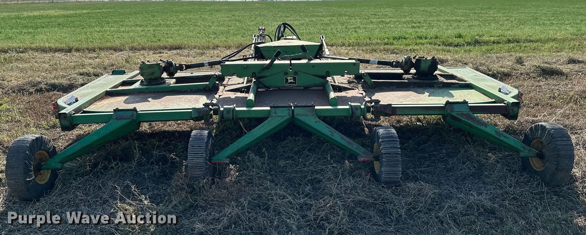 John Deere 1508 rotary mower. Serial: W01508F027486. Features Width: 15', Hydraulic lift, Hydraulic fold, PTO: 1000. Tires Solid. Geneseo, KS 67444