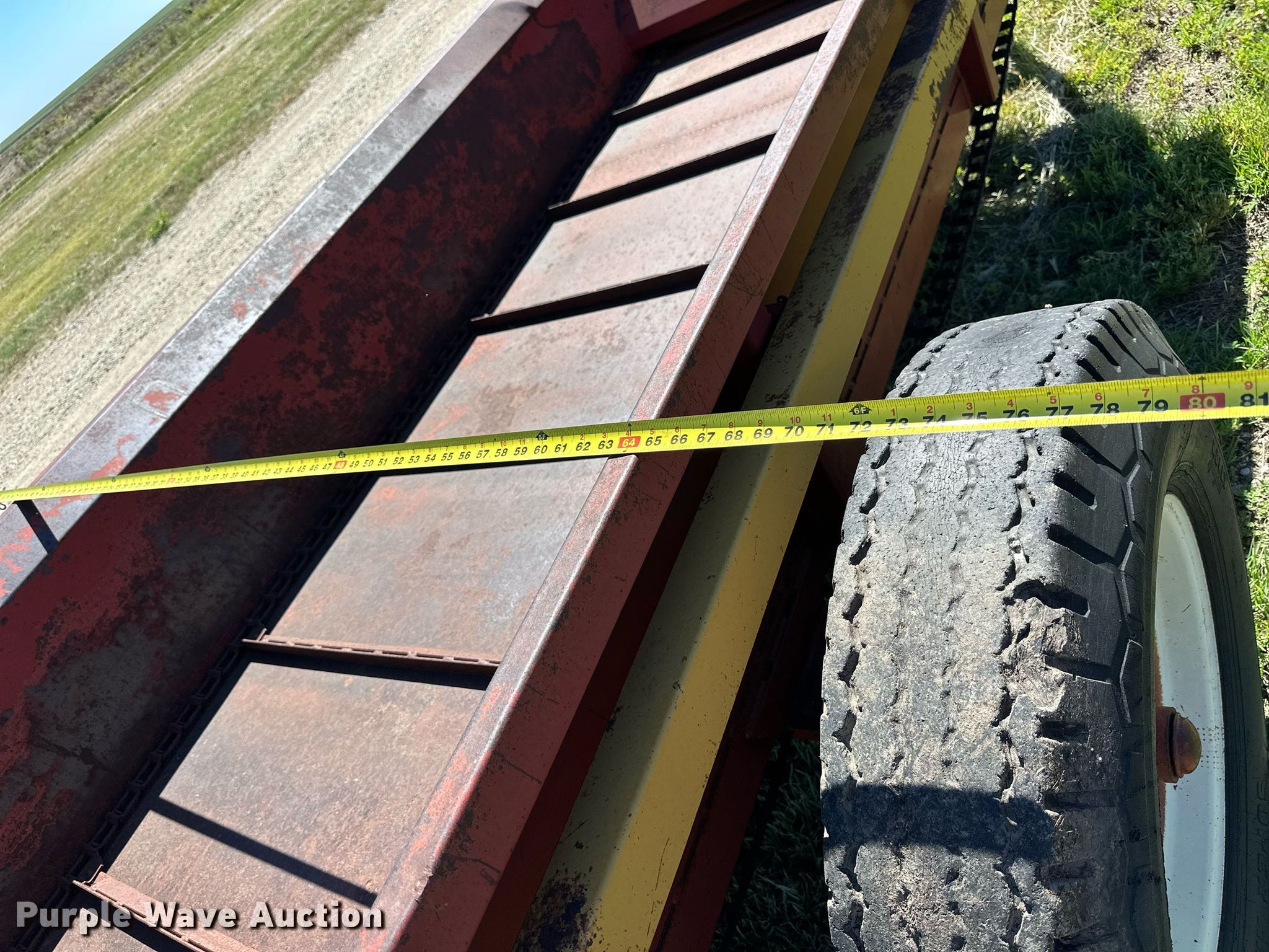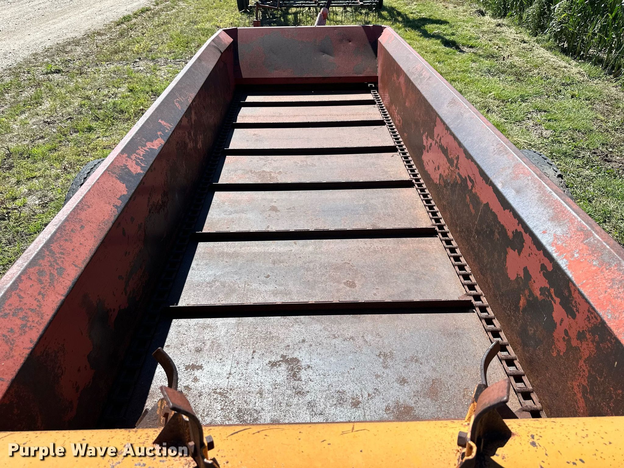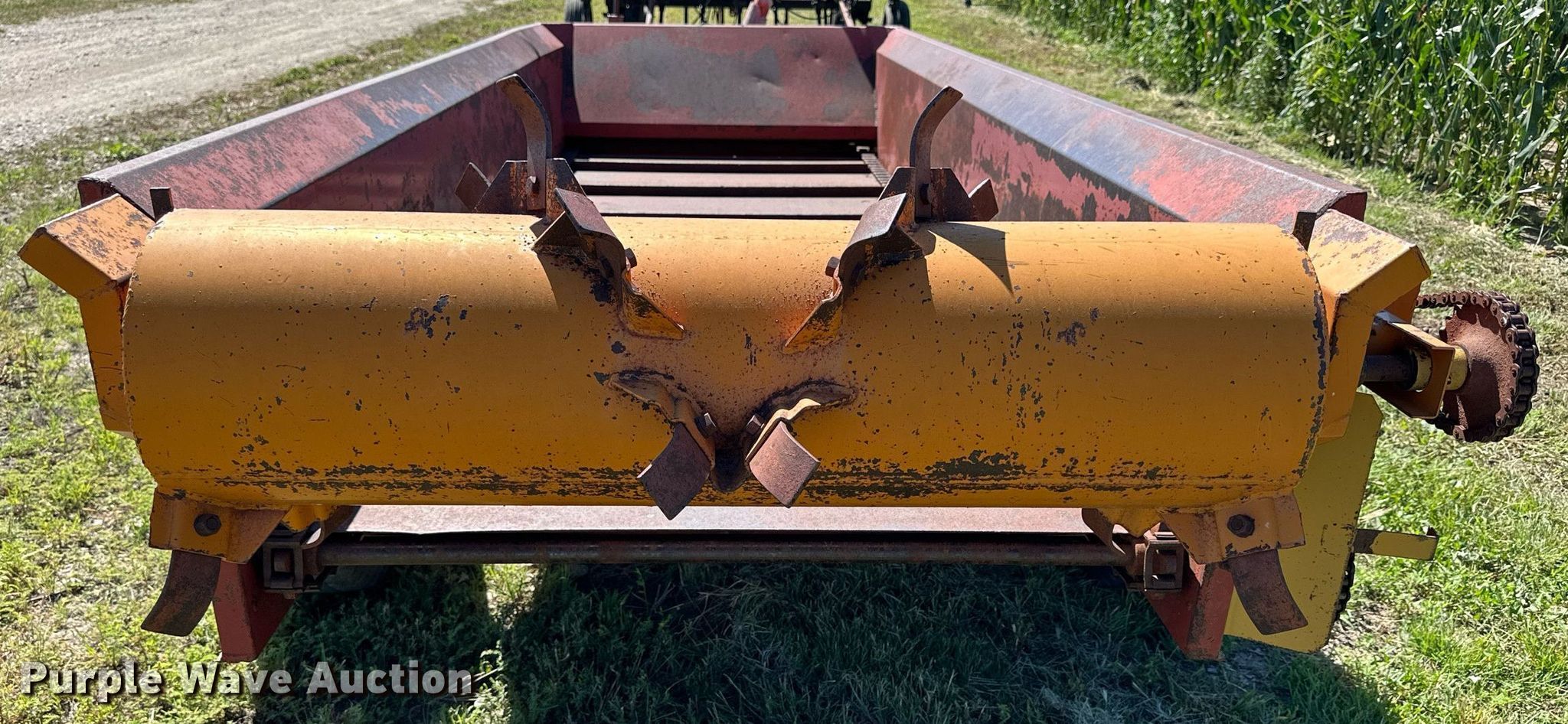 Kelly-Ryan manure spreader. Serial: 5455. Features 13' L x 77" W, Side height: 22", Chain driven floor, Rear beaters: Horizontal Quantity: 1, PTO: 540. Tires Size: 9.00-20. 9700 J Road. Norton, KS 67654
