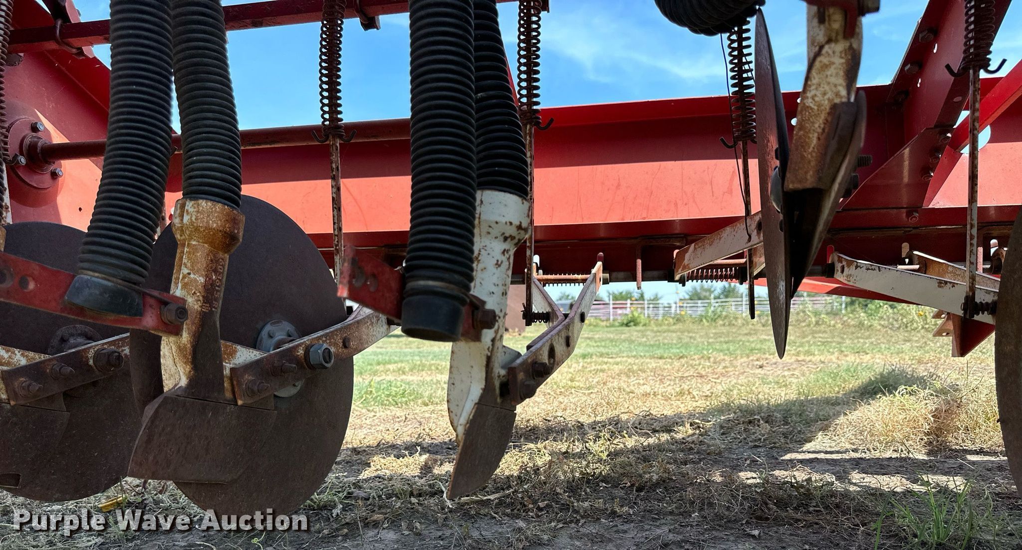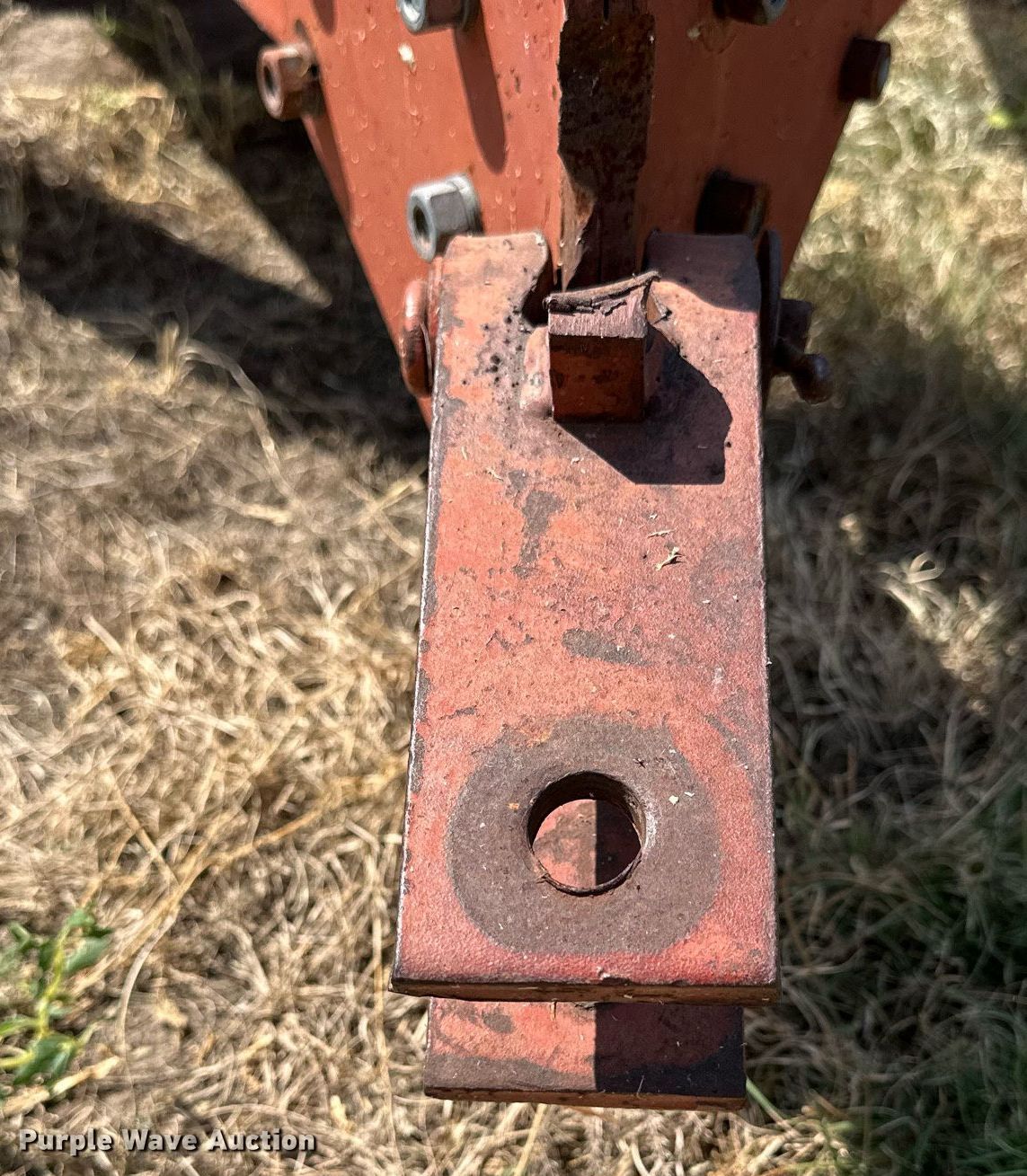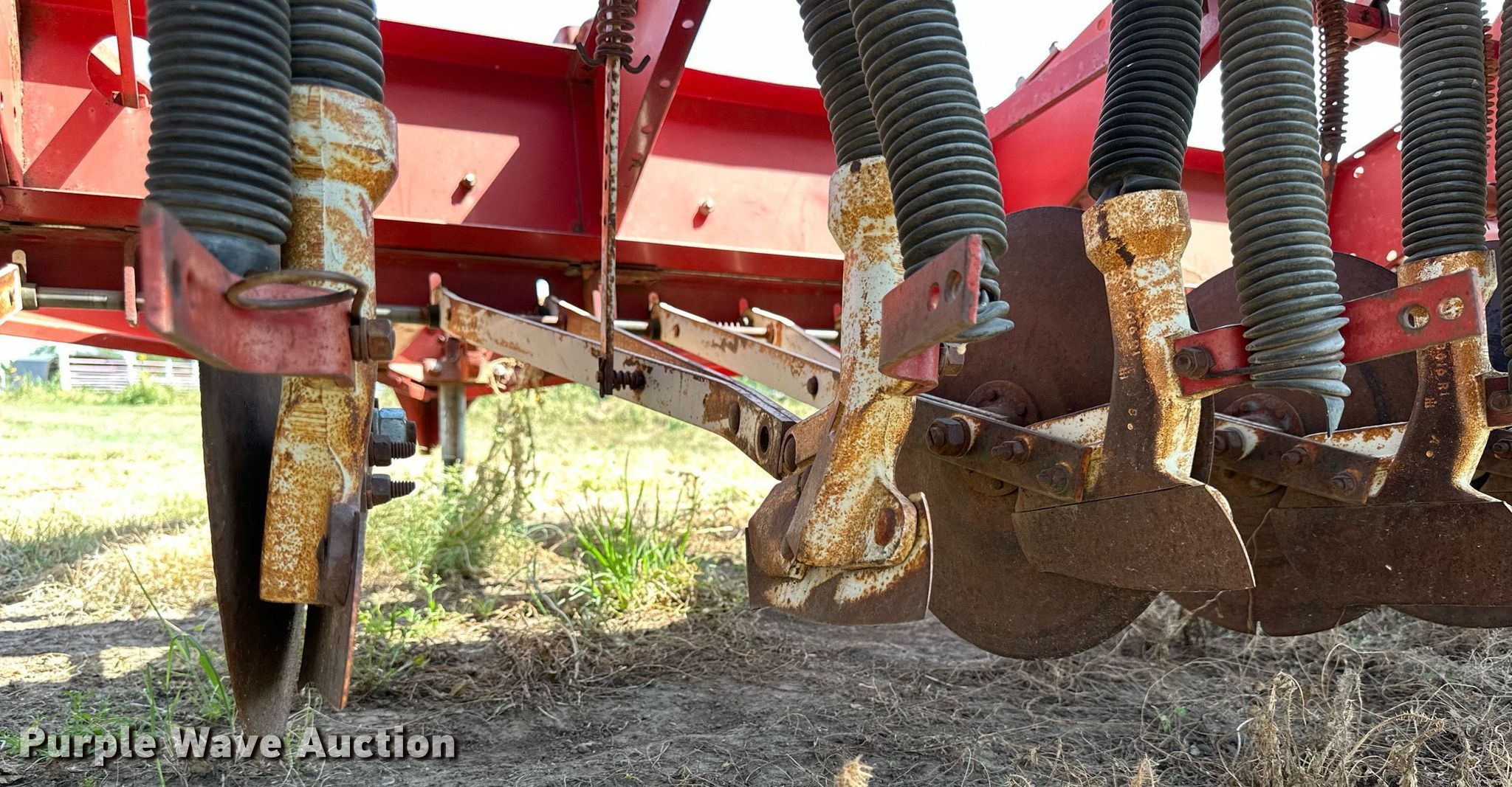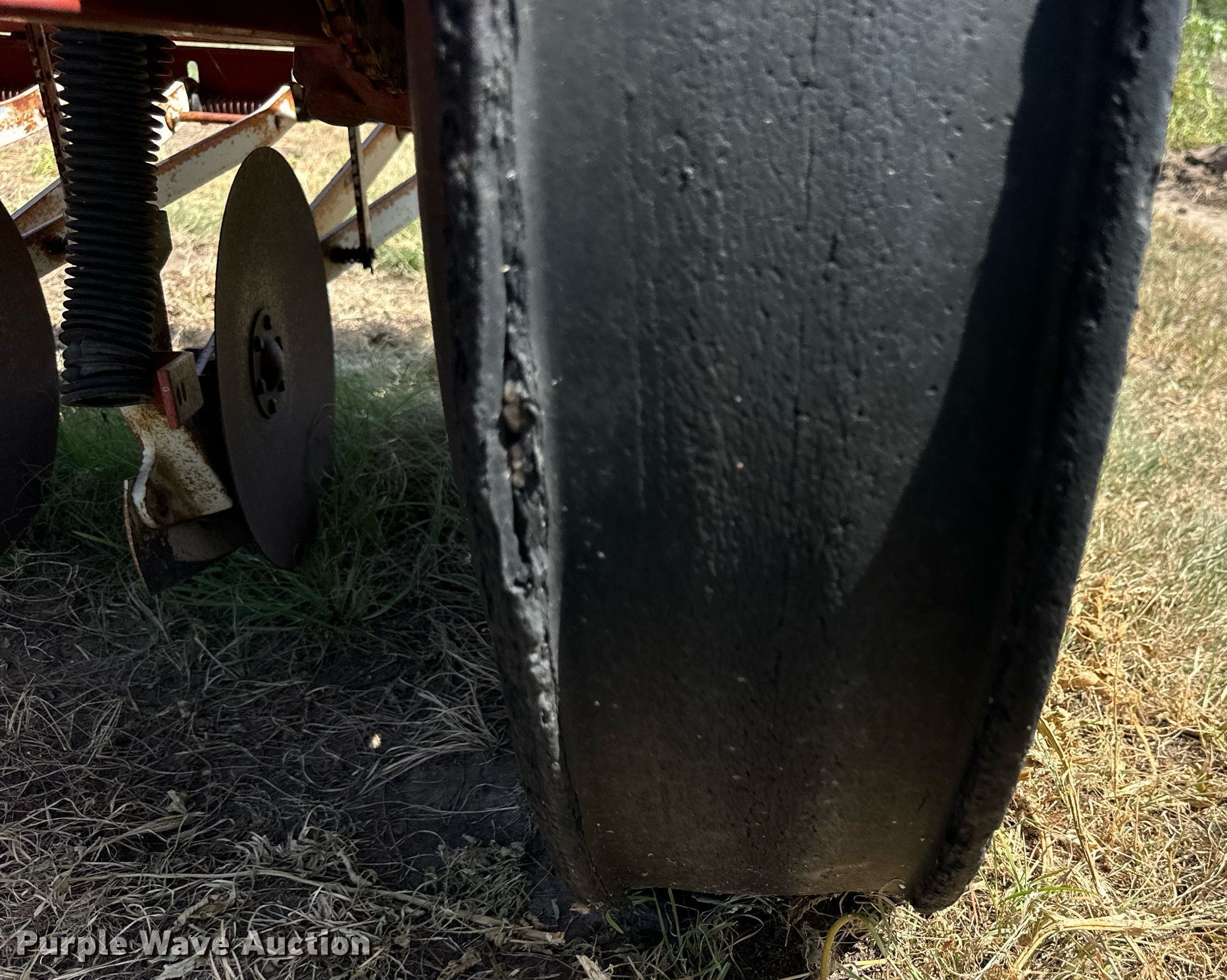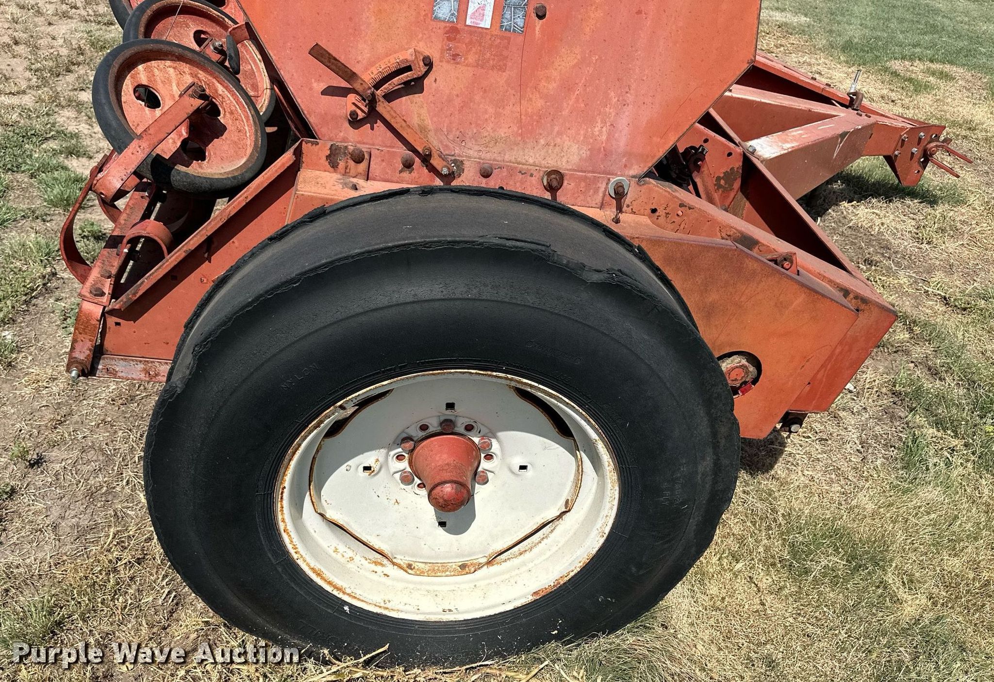 International 510 grain drill. Width: 14', Row units: 16, Row spacing: 11", Serial: 510C1111. Features Seed delivery Bulk fill system, Row units Meter drive: Ground, Down pressure: Spring, Disk openers: Single , Closing system: Single Type: Rubber.. Tires Drive/ outside tire size: 7.50-20. Notes (2) disks missing, Tire and wheel missing. 670 Northwest 60 Avenue. Olmitz, KS 67564