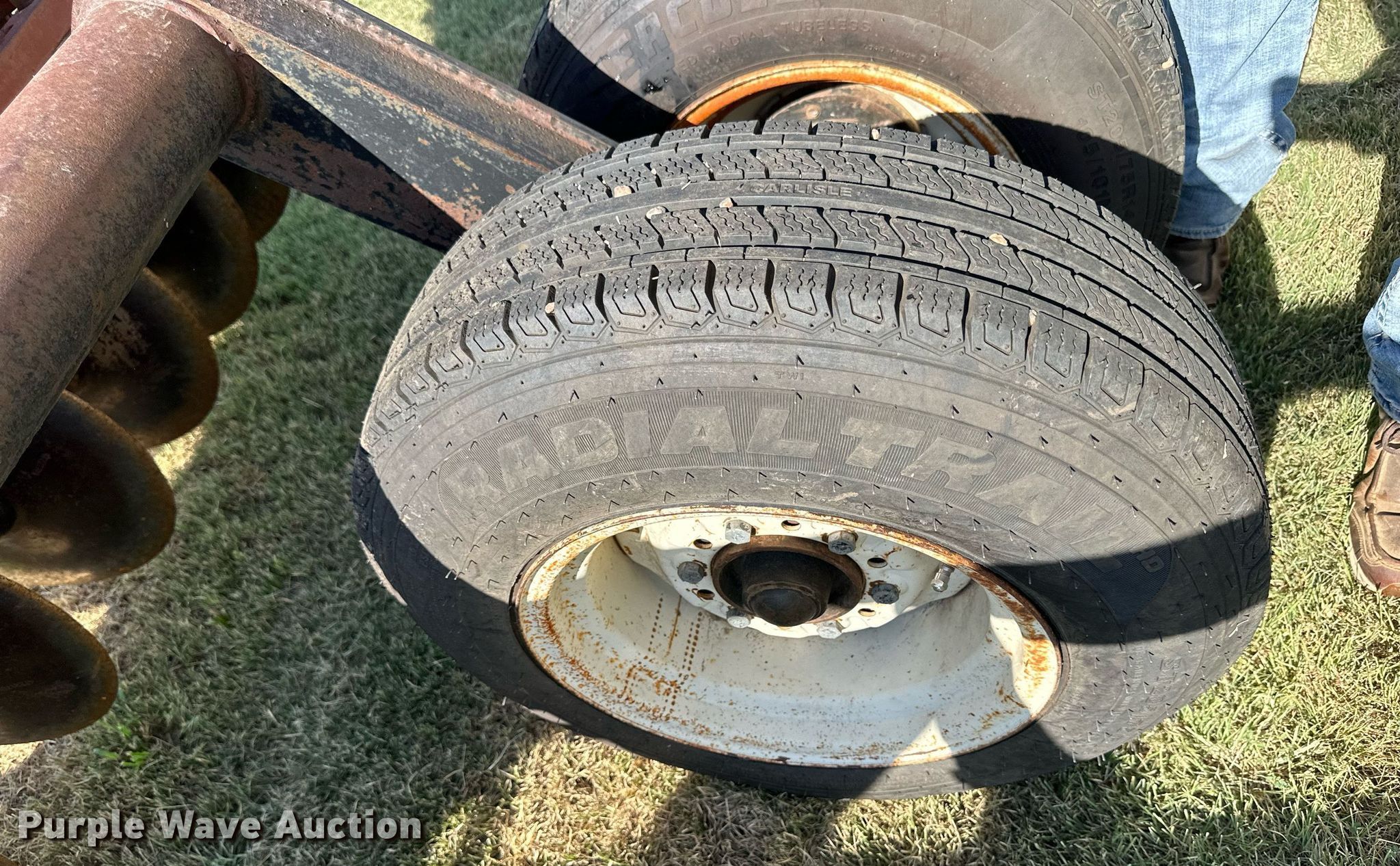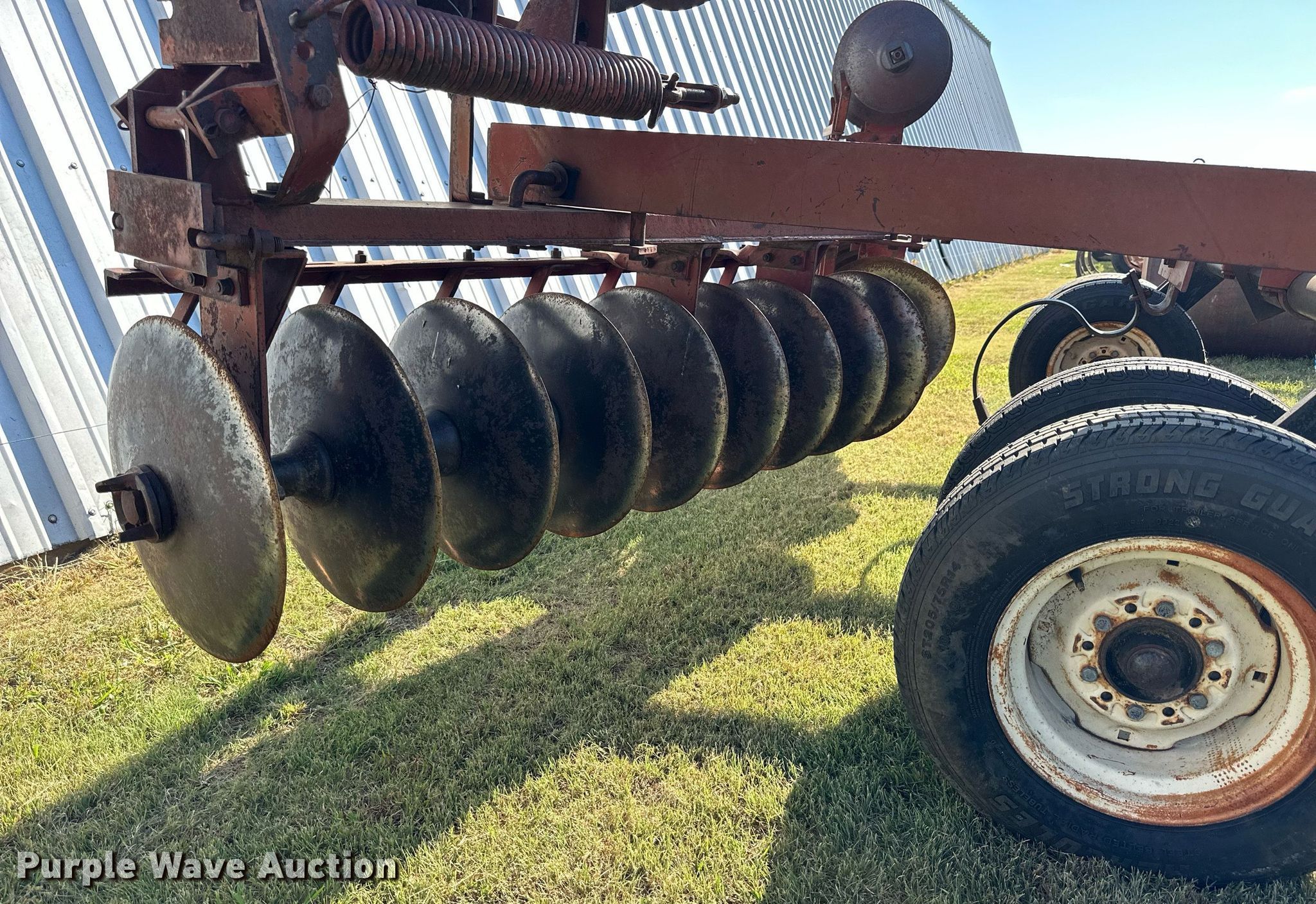 Tandem disk. Overall width: 18'. Features Front blades Diameter: 16", Spacing: 9", Rear blades Diameter: 16", Spacing: 9", Disk scrapers, Operation Hydraulic lift, Leveler: Manual. Tires Tire size: 205/75R14. 670 Northwest 60 Avenue. Olmitz, KS 67564