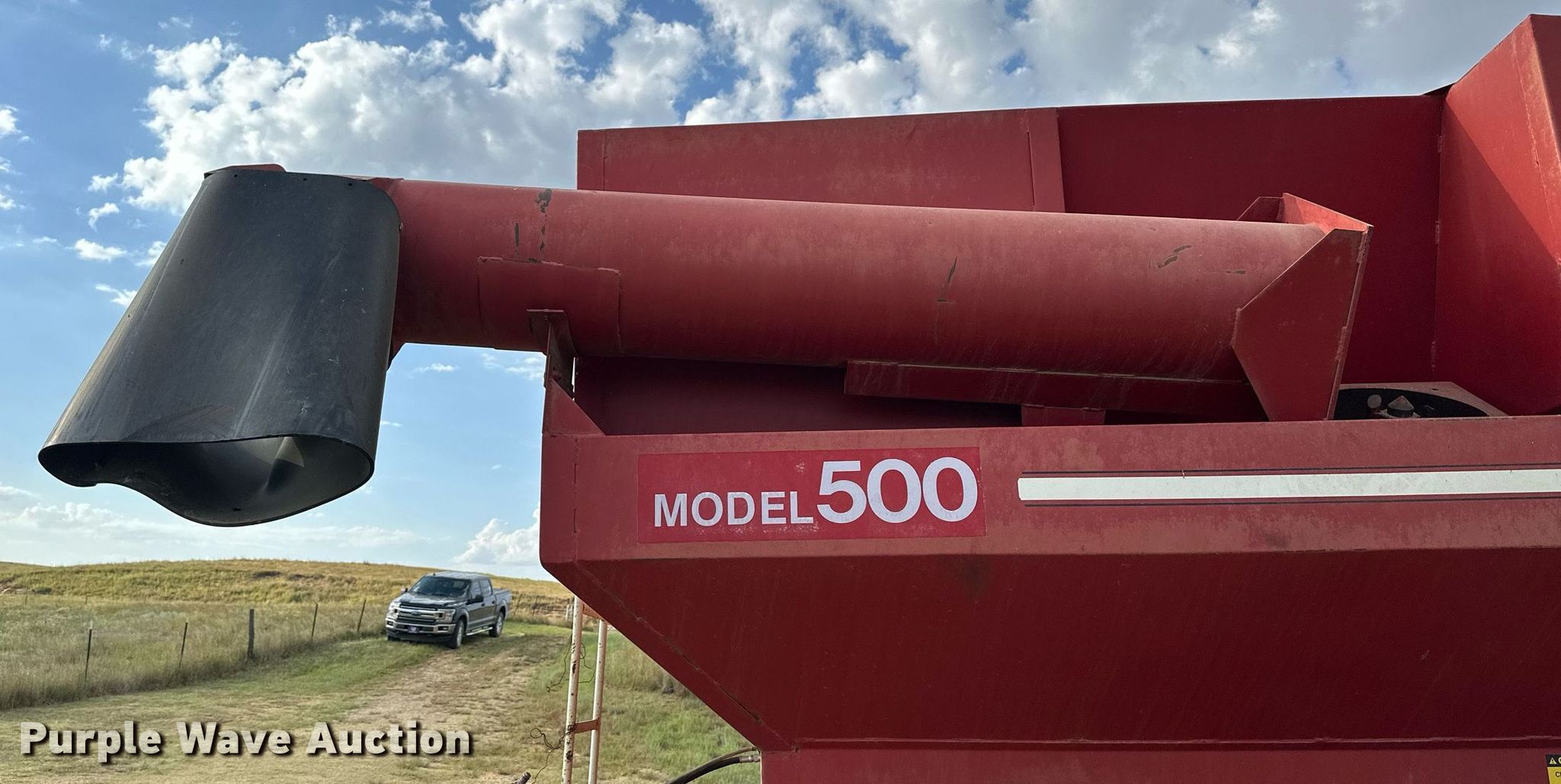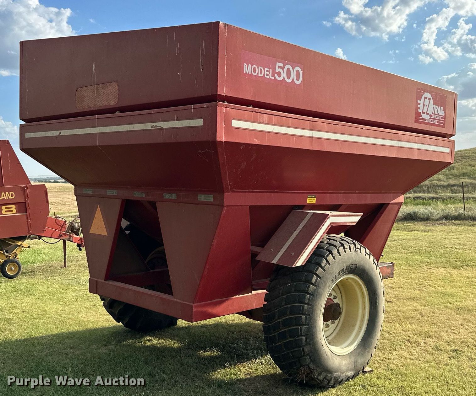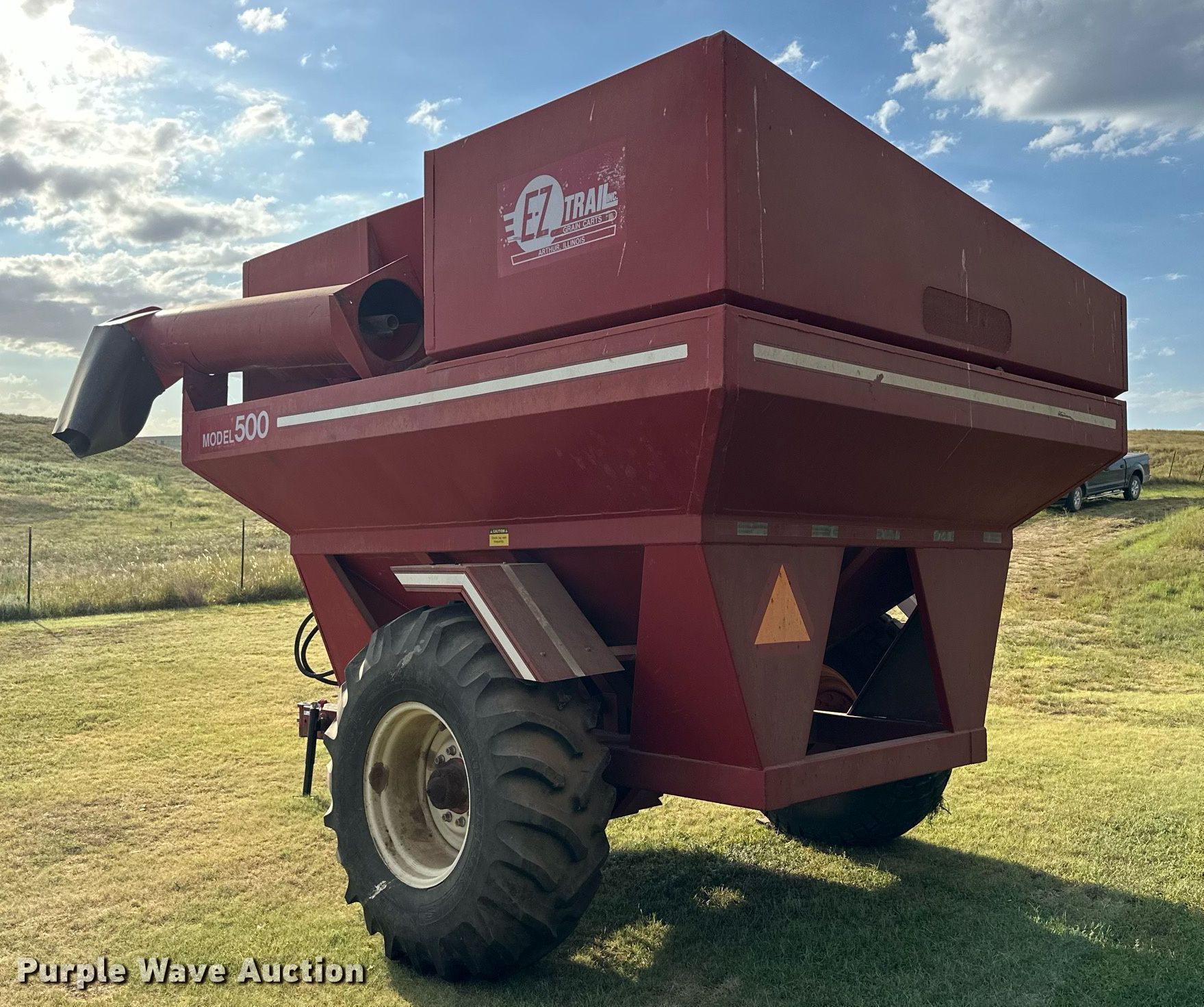 E-Z Trail 500 grain cart. Serial: EGC500Z011960099. Features Auger diameter: 16", Shut-off gate: Hydraulic, PTO: 1000. Tires Size: 18.4-26. Notes PTO shaft. Derek Meier. 1650 Fox Dr. Lincoln, KS 67455