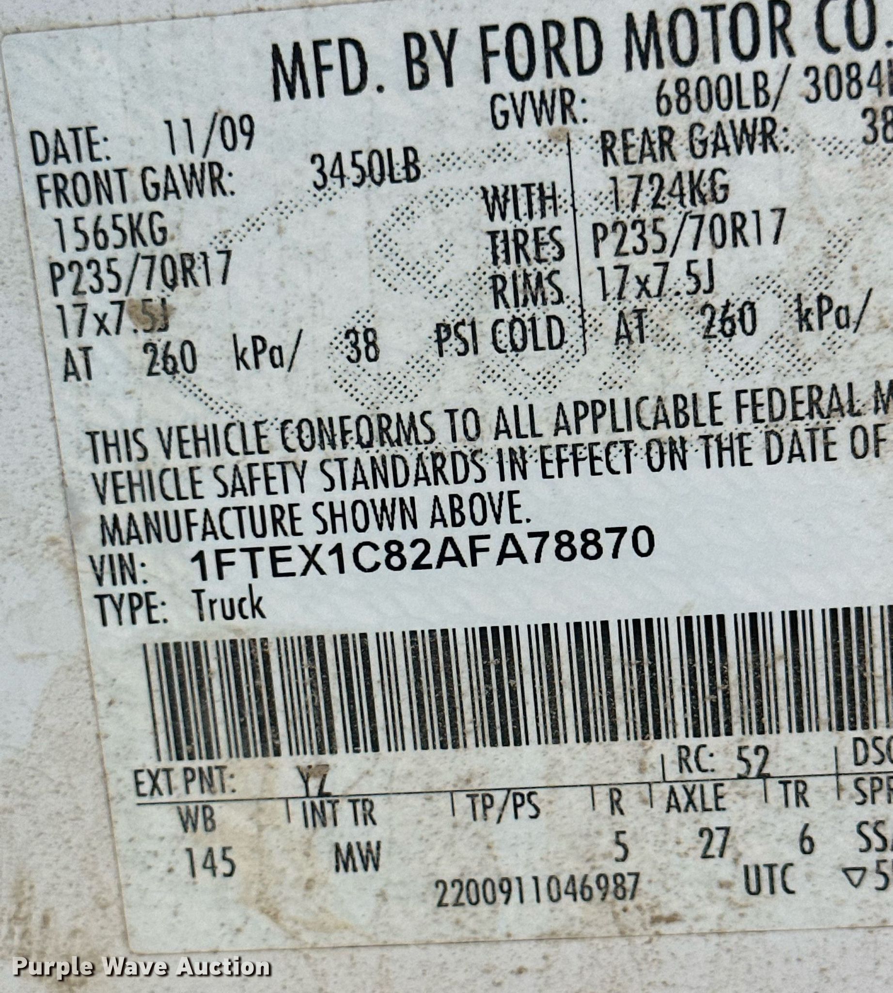 2010 Ford F150 XLT SuperCab pickup truck. Miles: Unknown, VIN: 1FTEX1C82AFA78870. Engine Displacement: 4.6L V8 SOHC, Cylinders: 8, Fuel type: Gas. Transmission Automatic. Interior AC, Heat, Power windows, Power locks, Cruise control. Tires Size: 265/70R17. Notes Battery missing, Flat tire, Unknown operating condition. Kansas title. Cobalt Cattle Company. 1291 Old Santa Fe Drive. Sublette, KS 67877
