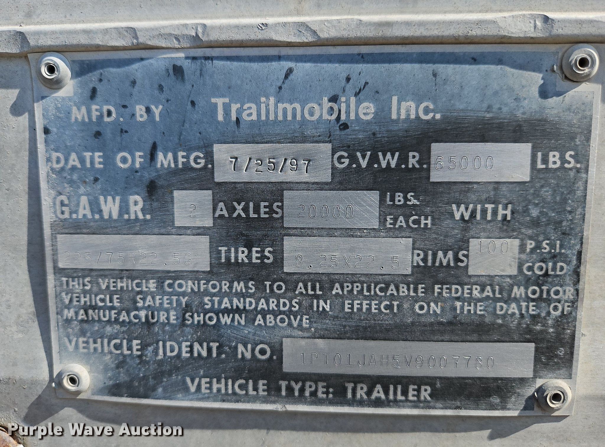 1997 Trailmobile 01JA-1RAY dry van trailer. VIN: 1PT01JAH5V9007780. Dimensions Overall: 53' L x 8' 6" W. Features Deck type: Wood. Chassis Landing gear: Dual, Suspension: Air, Brakes: Air, Axles: Tandem, Sliding, GVWR: 65,000 lbs, GAWR: 20,000 lbs. Tires Steel wheels, Size: 295/75R22.5. Notes Truck not included. Missouri title. Title distribution may be delayed up to 14 days from verification of funds. Zach Erwin Construction Inc.. 700 South Alma Street. Nevada, MO 64772