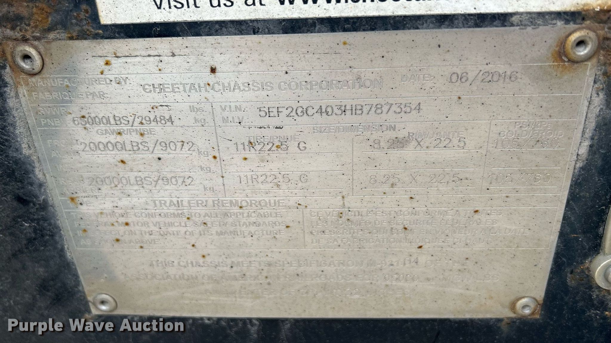 2017 Cheetah container trailer. VIN: 5EF2GC403HB787354, Unit #: 762804. Dimensions Overall: 40' 8" L x 96" W. Features Deck type: Steel. Chassis Hitch: Gooseneck, Landing gear: Dual, Suspension: Spring, Brakes: Air, Axles: Tandem, GVWR: 65,000 lbs, GAWR: 20,000 lbs. Tires Steel wheels, Size: 11R22.5. Ohio title. Aim NationaLease. 8125 Wattsburg Road. Erie, PA 16509