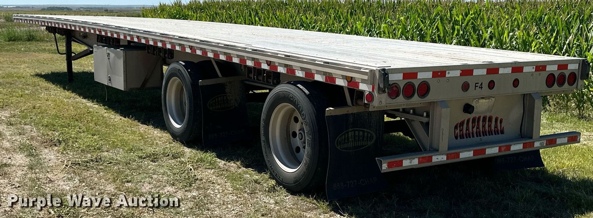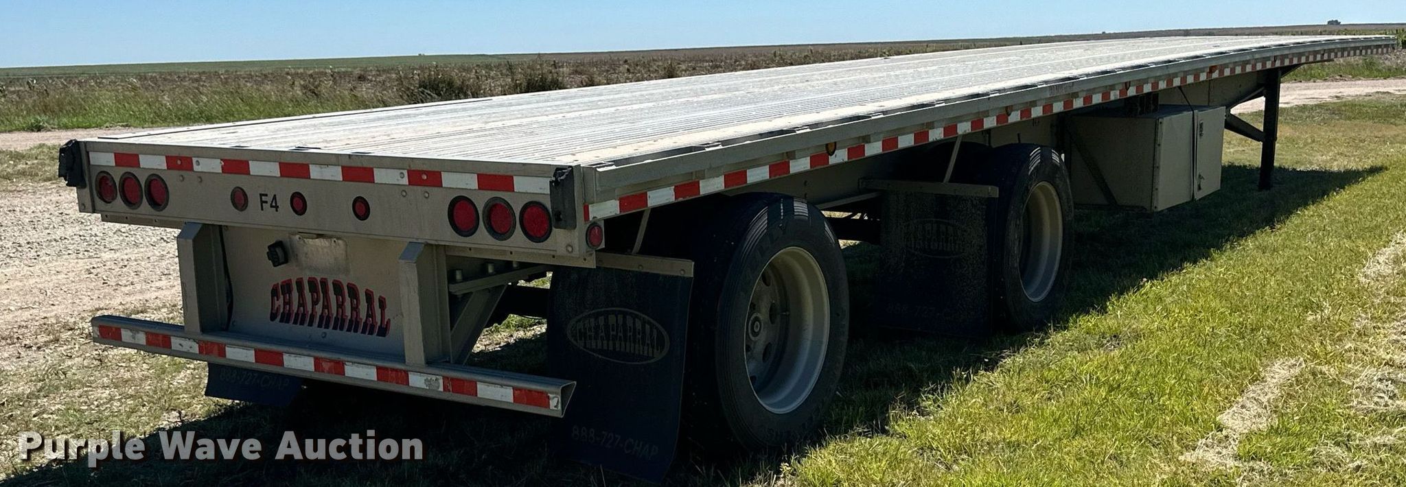 2007 Chaparral flatbed trailer. VIN: 1C92F48217M949381. Dimensions Overall: 48' L x 101" W, Deck: 48' L x 94" W, Deck height: 59". Features Deck type: Aluminum. Chassis Landing gear: Dual, Suspension: Air, Brakes: Air, Axles: Spread, GVWR: 90,000 lbs. Tires Aluminum wheels, Size: 275/80R24.5. Kansas title. Title distribution may be delayed up to 30 days from verification of funds. 9700 J Road. Norton, KS 67654