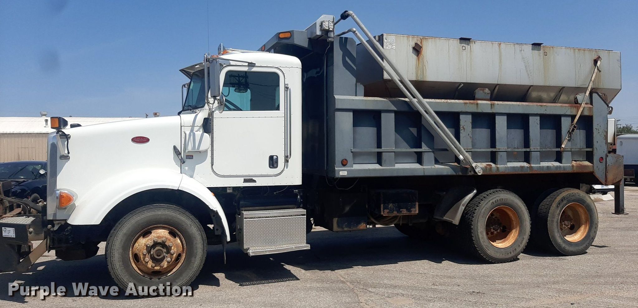 2011 Peterbilt 365 dump truck. Miles: 208,061 on odometer, VIN: 1NPSL50X9BD120149. Engine Displacement: 8.9L, Cylinders: 6, Fuel type: Diesel. Transmission Automatic. Chassis Axles: Tandem, Differential lock: Inter-axle, Suspension: Air Dump valves, Brakes: Air, PTO, Front mount PTO, GVWR: 58,180 lbs. Interior AC, Heat, Heated mirrors, Power windows, Cruise control, Brake controller. Features Dump bed Godwin, 15' L x 96" W, Side height: 40", Bed type: Steel, Roll tarp, Ram: Single , End gate: Air operated, Henderson spreader Serial: FSH28227. Tires Front: 315/80R22.5, Rear: 11R22.5. Notes Tailgate included. Kansas title. Title distribution may be delayed up to 14 days from verification of funds. Sedgwick County. 1021 Stillwell. Wichita, KS 67213