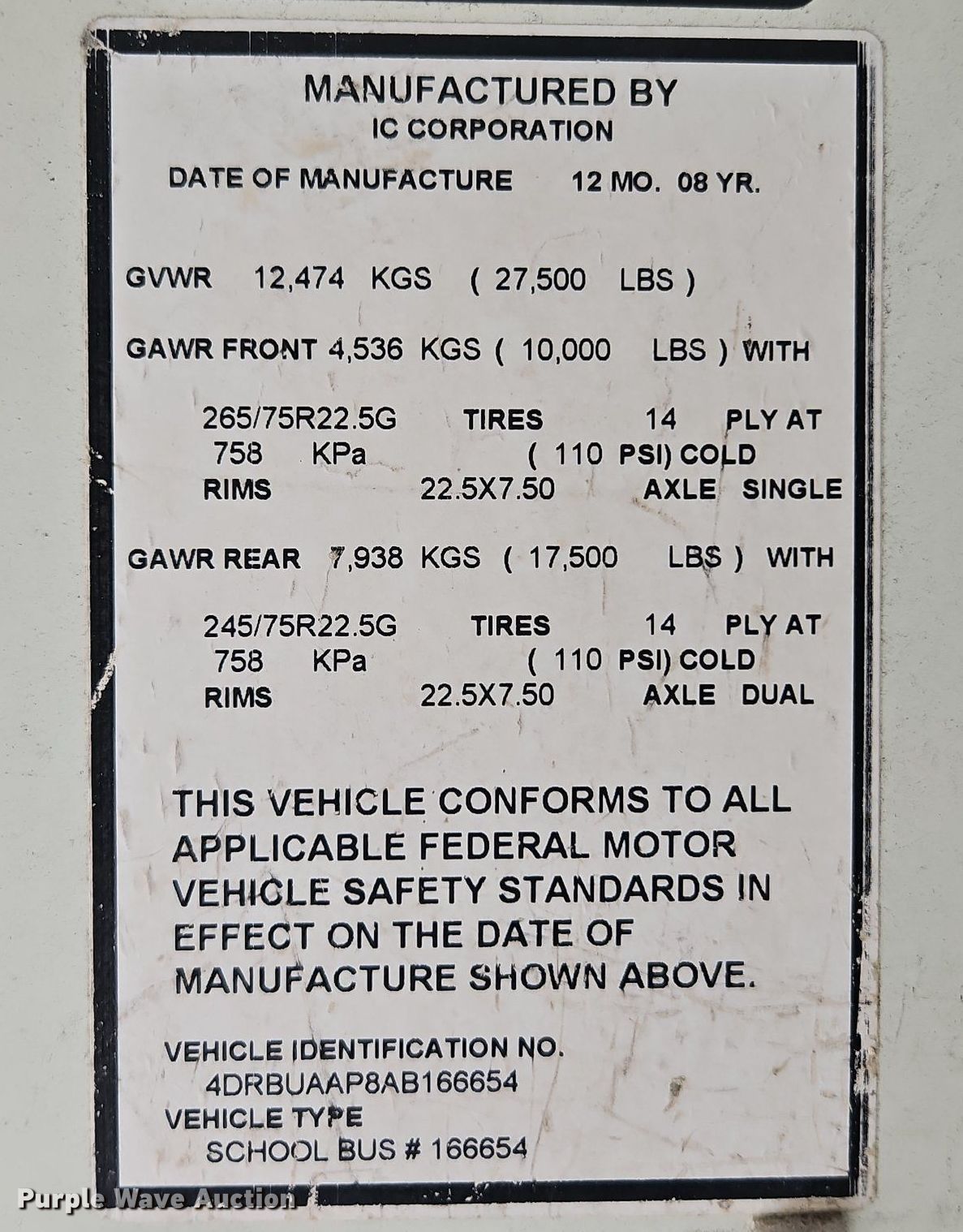 2010 IC PB105 school bus. Miles: 89,098 on odometer, Hours: 8,244 on meter, VIN: 4DRBUAAP8AB166654, Unit #: 13. Engine International MaxxForce DT, Displacement: 7.6L, Cylinders: 6, Fuel type: Diesel. Transmission Automatic. Chassis Axles: Single, Suspension: Spring, Brakes: Air, GVWR: 27,500 lbs. Interior Heat, Cruise control, Auxiliary controls, Electric passenger sliding door, Passengers: 71. Tires Size: 11/R22.5. Notes Dash warning indicator: Regen light, Fuel filter. Kansas title. Title distribution may be delayed up to 14 days from verification of funds. Kansas City, KS 66101
