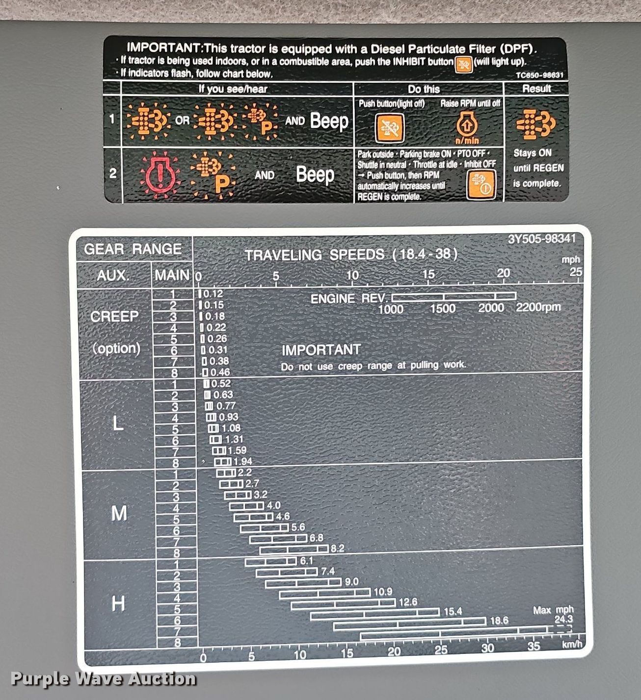 2019 Kubota M6-131 MFWD tractor. Hours: 1,192 on meter, Serial: 11029. Engine Kubota V6108-CR-T1-EV05, Serial: 3KE0139, Displacement: 6.1L, Cylinders: 4, Fuel type: Diesel, kW: 93.1. Transmission Powershift, 24F - 24R, Left-hand reverser, Differential lock. Operators station AC, Heat. Features PTO: 1000, Three point, Seven pin outlet, Hydraulic remote sets Rear: 3, Suitcase weights: 8. Tires Front: 380/85R24, Rear: 460/85R38, Duals. Adams County Secondary Roads. 2004 200th Street. Corning, IA 50841