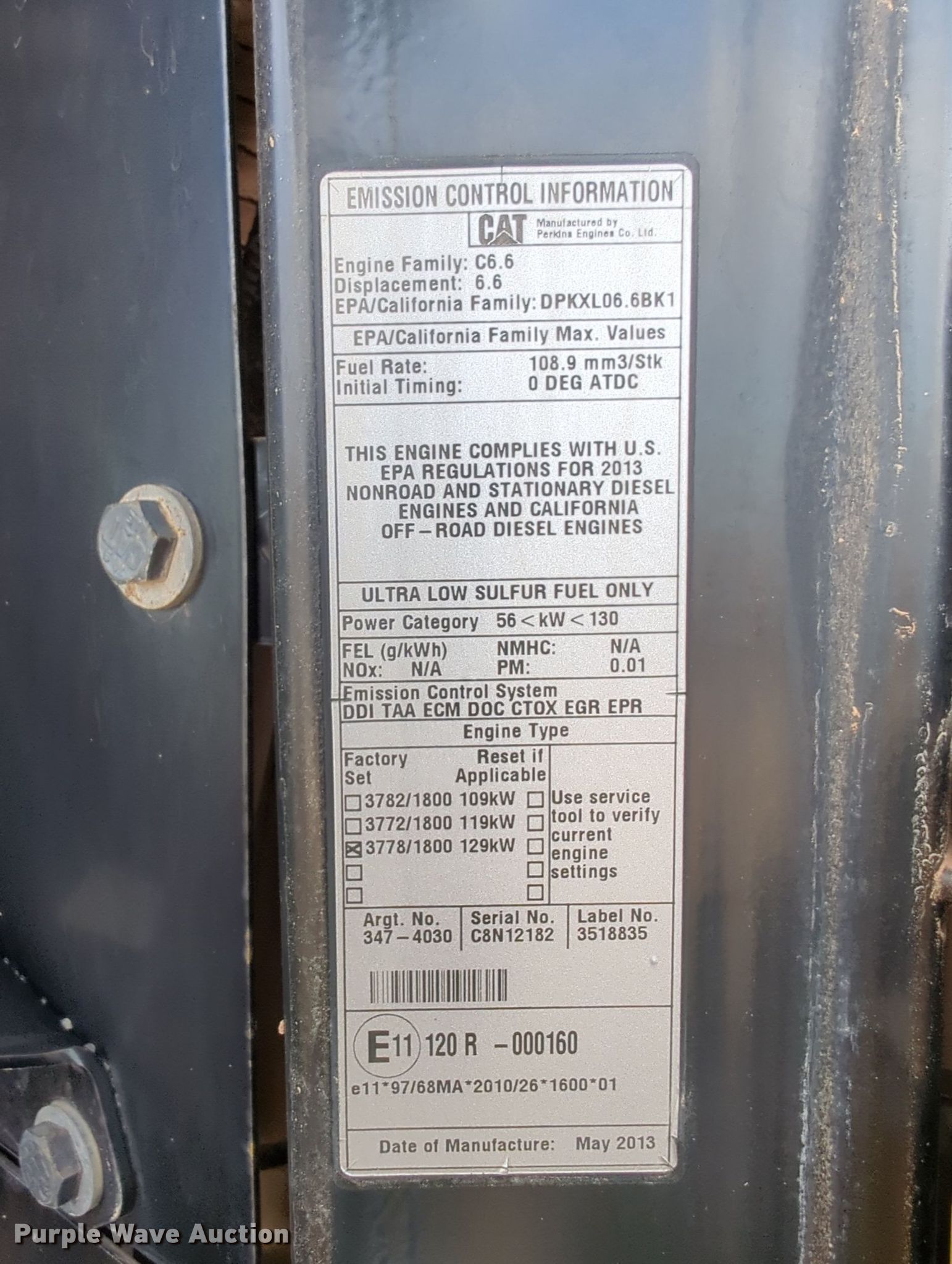 2013 Caterpillar 924K wheel loader. Hours: 3,582 on meter, Serial: CAT0924KCPWR02087. Engine Caterpillar C6.6, Displacement: 6.6L, Cylinders: 6, Fuel type: Diesel. Transmission Hydrostatic, Four speed travel. Chassis Differential lock: Front. Operators station Enclosed cab, AC, Heat, Bucket controls: Joystick. Features Bucket Width: 98", Self- leveling bucket, Cutting edge: Bolt-on. Tires Size: 20.5R25. Grady County. 860 County Street 2910. Tuttle, OK 73089