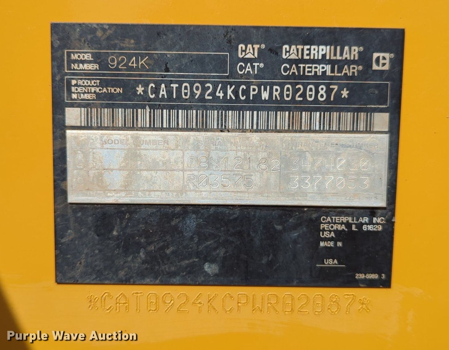 Purple Wave is selling a used Wheel Loader in Oklahoma. This item is a 2013 Caterpillar 924K wheel loader with the following: Hours: 3,582 on meter, Serial: CAT0924KCPWR02087