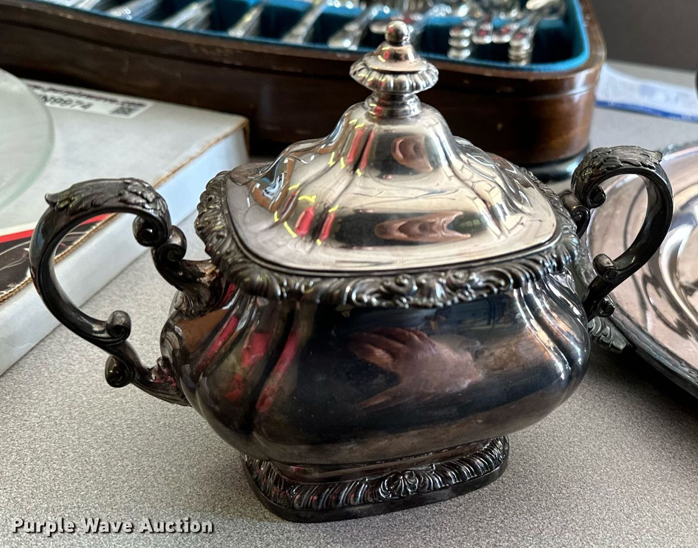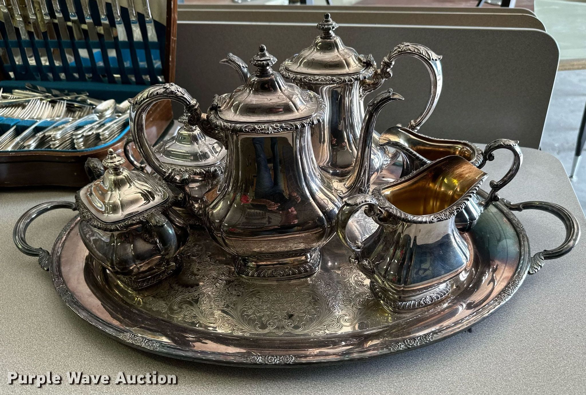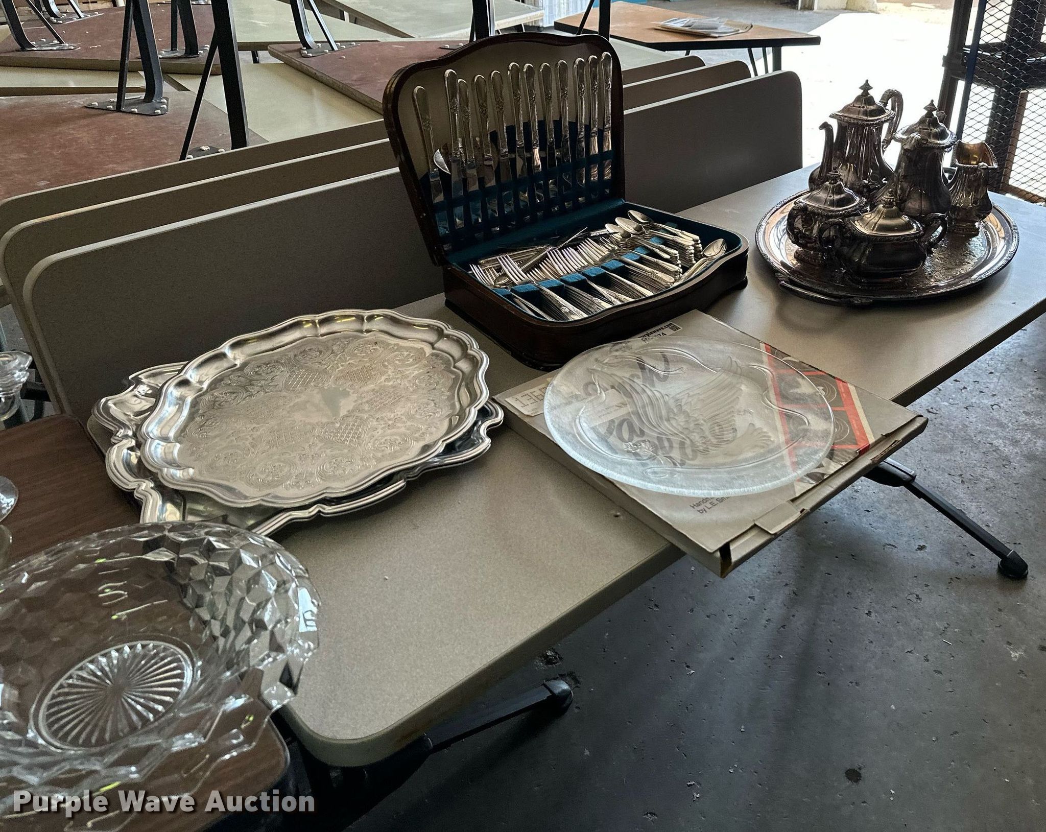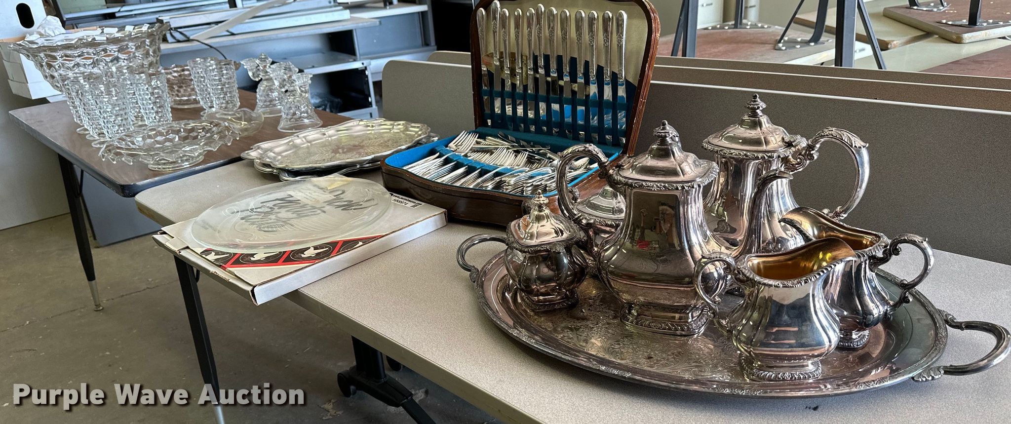 Purple Wave is selling a used All Other Household Items in Kansas. This item is a Kitchen utensils with the following: Gorham Silver tea set, Fostoria glassware, Rogers silverplate flatware service, Table not included