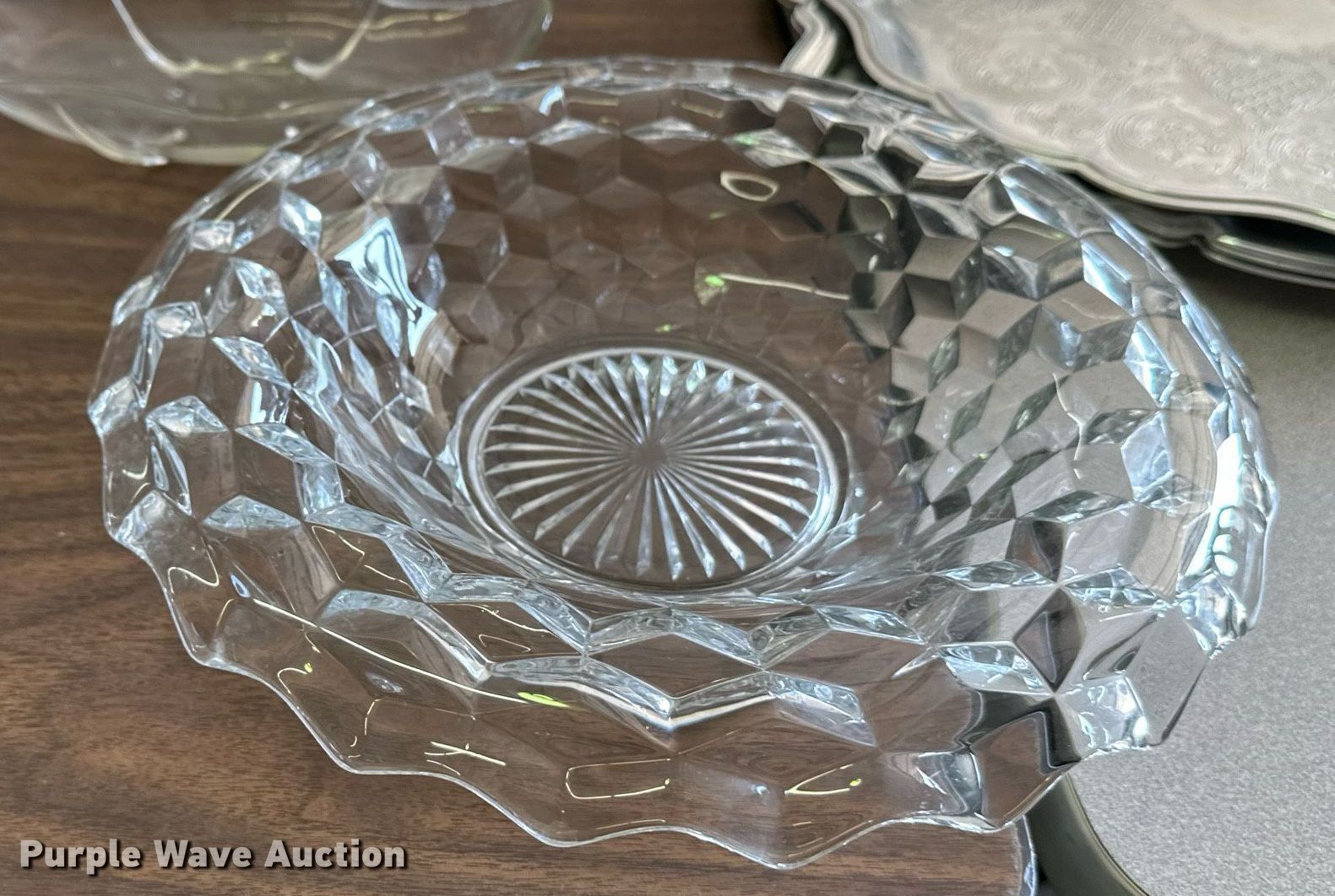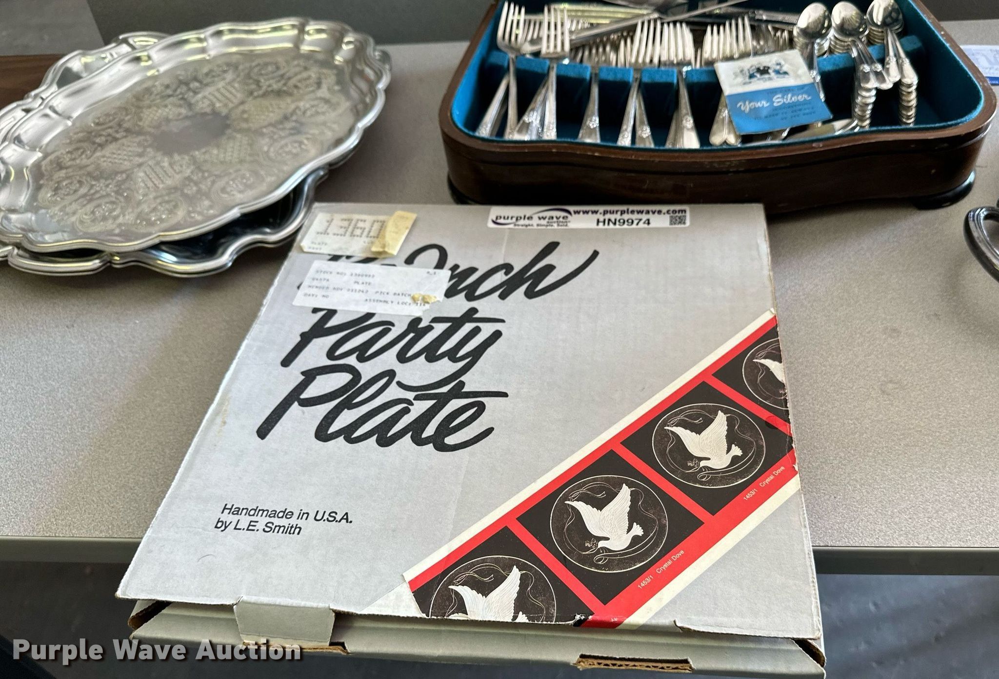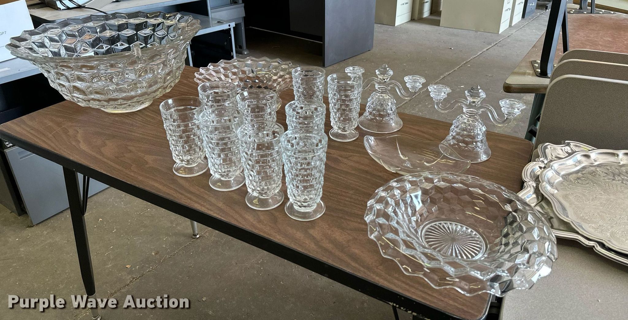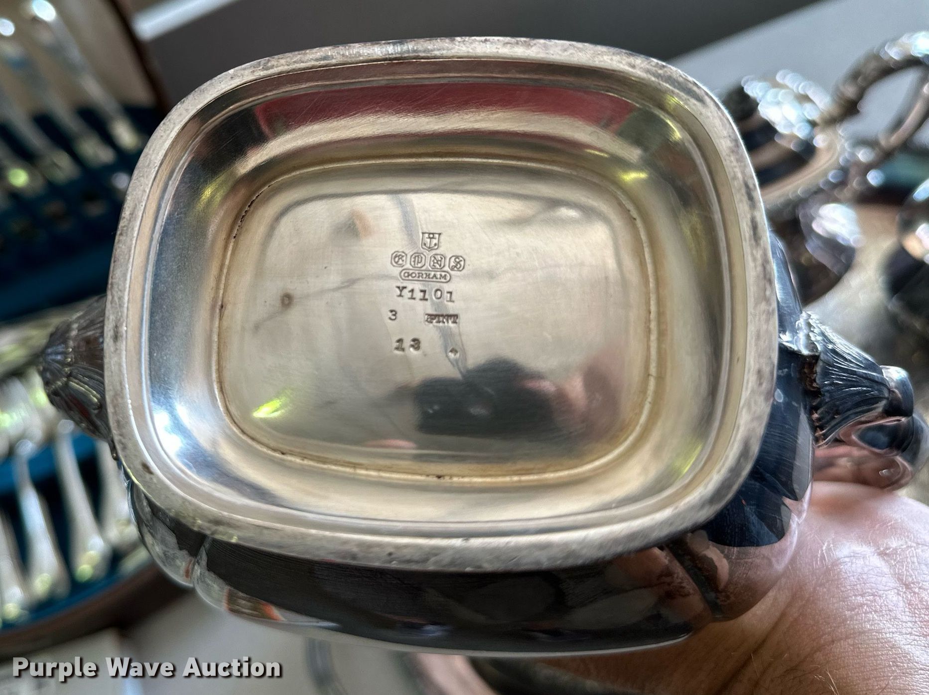 Purple Wave is selling a used All Other Household Items in Kansas. This item is a Kitchen utensils with the following: Gorham Silver tea set, Fostoria glassware, Rogers silverplate flatware service, Table not included