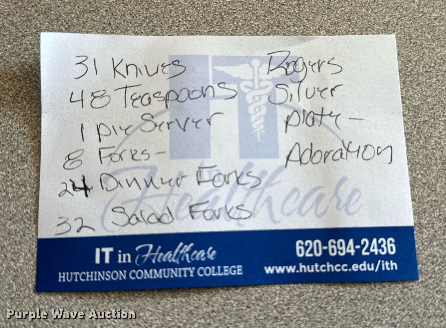 Kitchen utensils. Gorham Silver tea set, Fostoria glassware, Rogers silverplate flatware service, Table not included. Hutchinson Community College. 1800 East Essex Road. Hutchinson, KS 67501