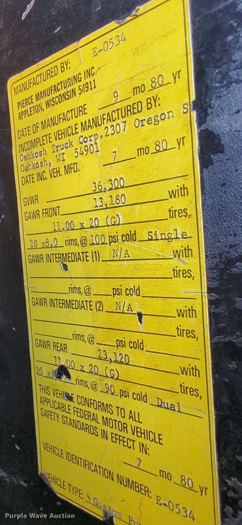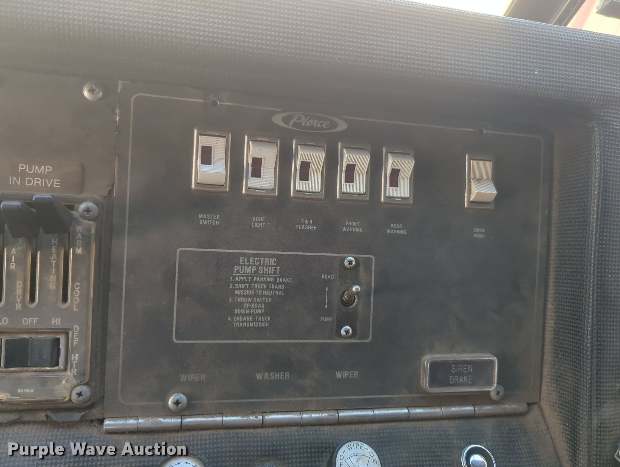 Purple Wave is selling a used Fire Truck or Emergency Vehicle in Oklahoma. This item is a 1979 Pierce pumper fire truck with the following: Miles: 79,128 on odometer, Hours: 4,798 on meter, VIN: E0534