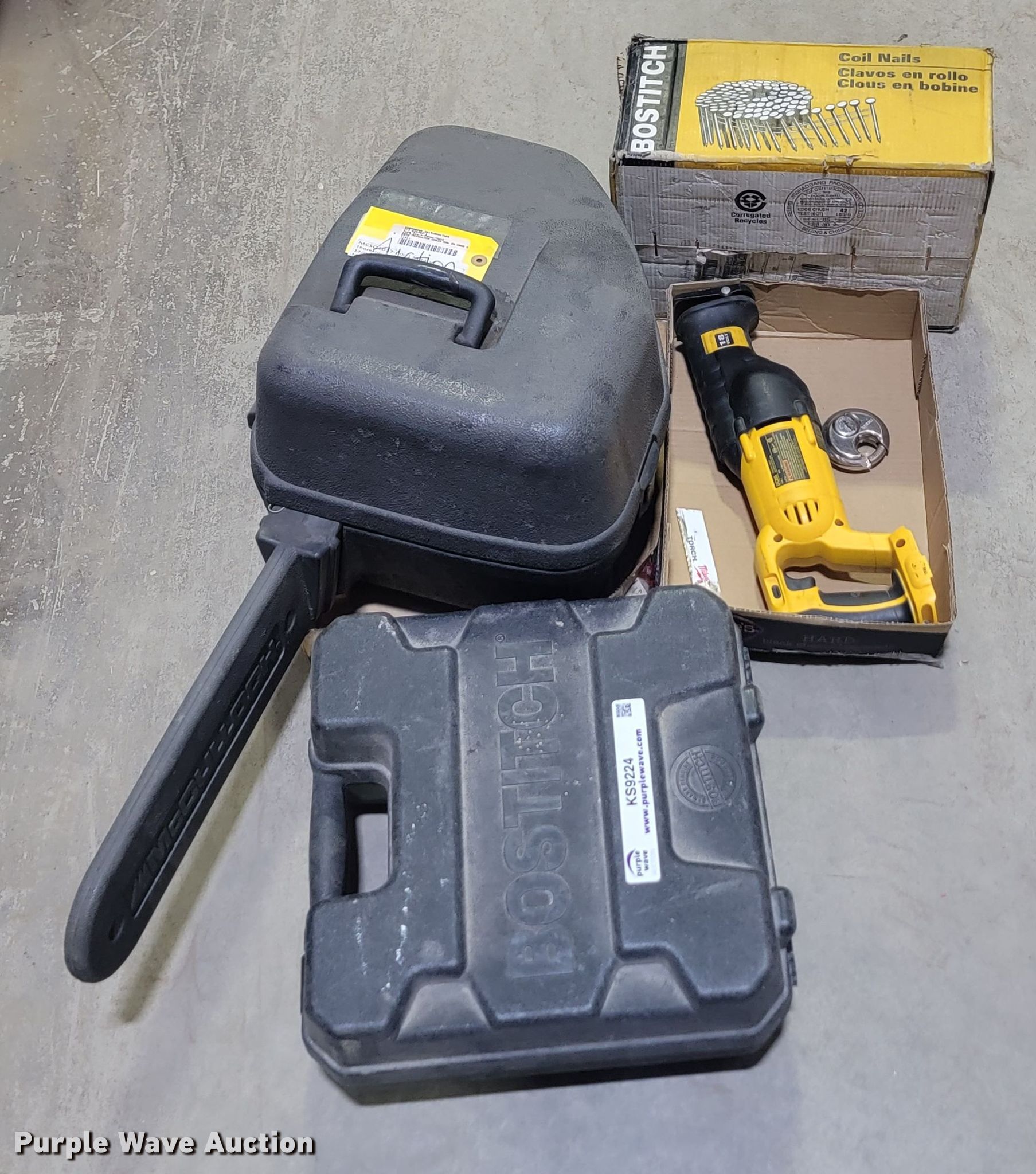 Purple Wave is selling a used Tools in South Dakota. This item is a Tools with the following: Chainsaw, Bostitch nail gun, Nails, DeWalt reciprocating saw