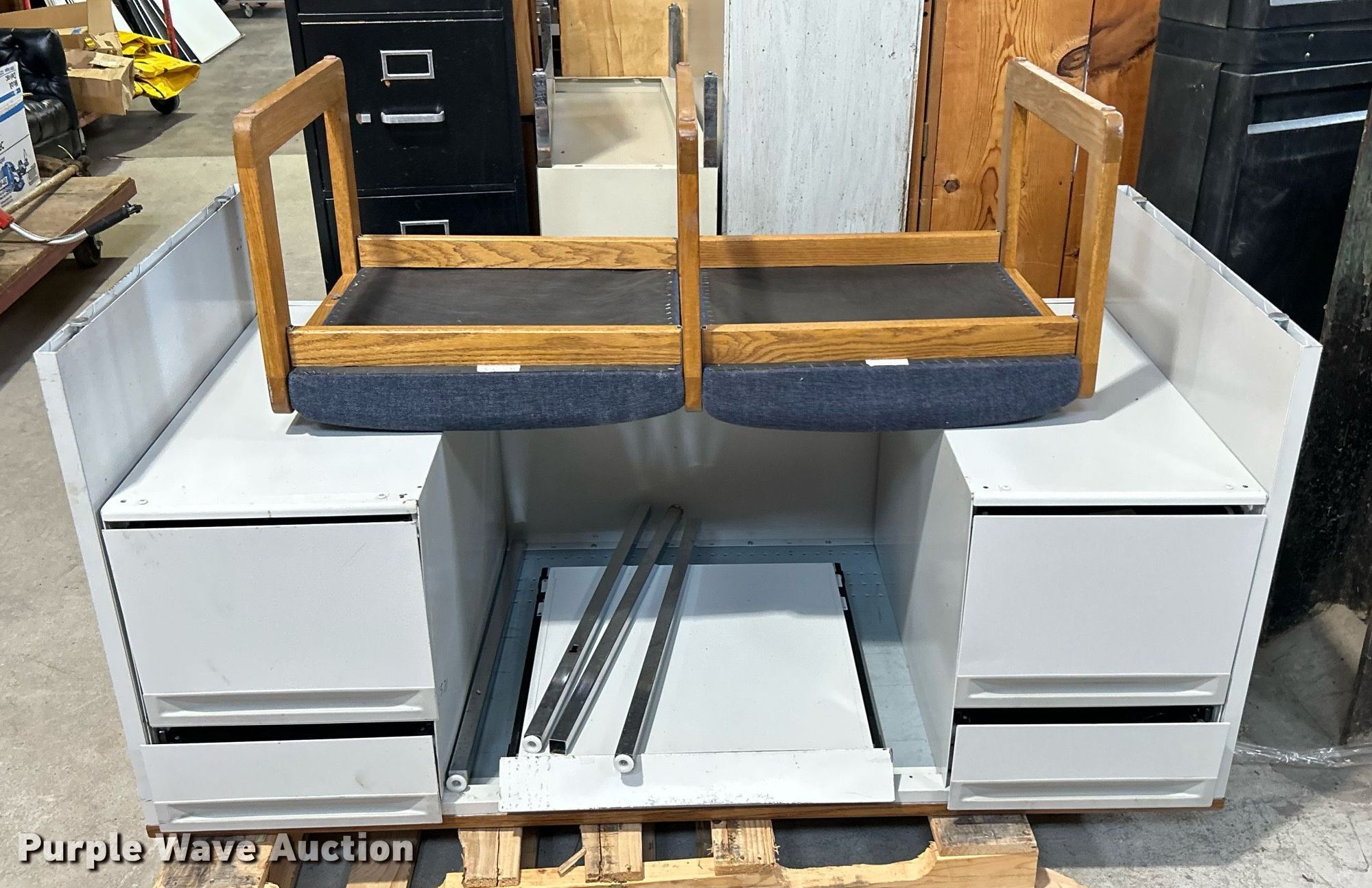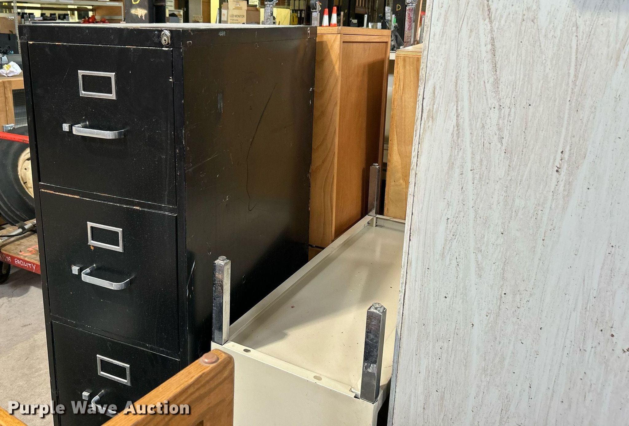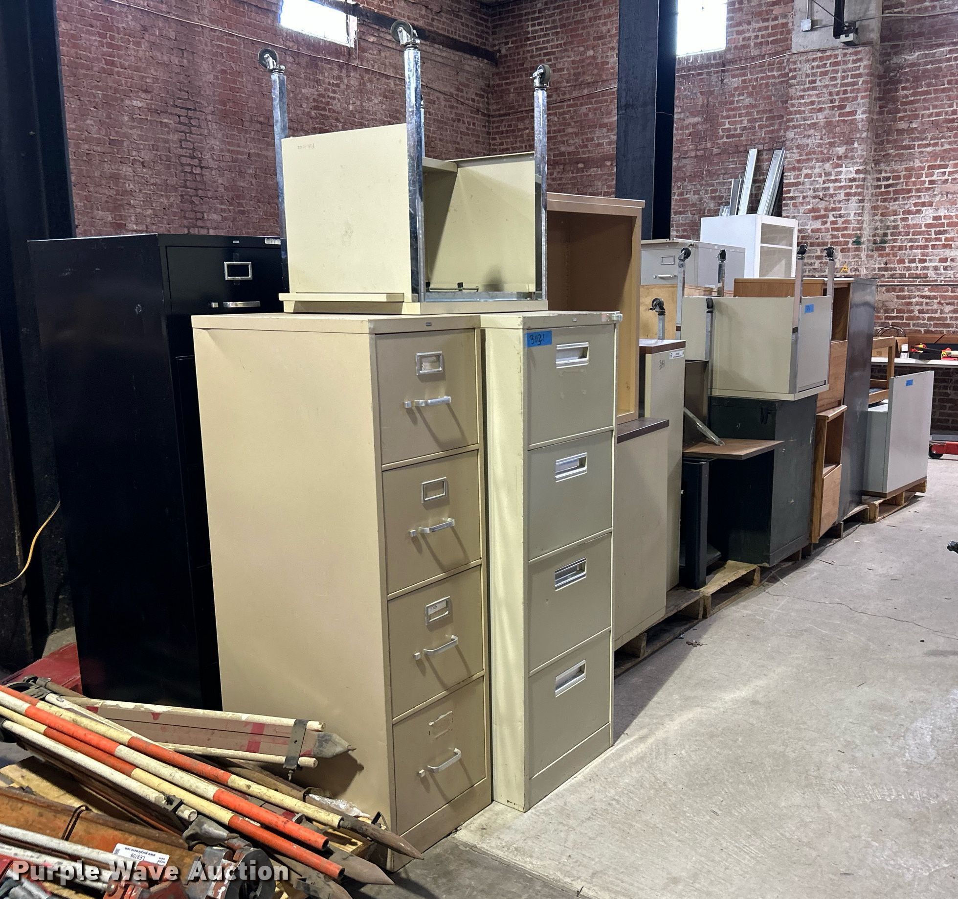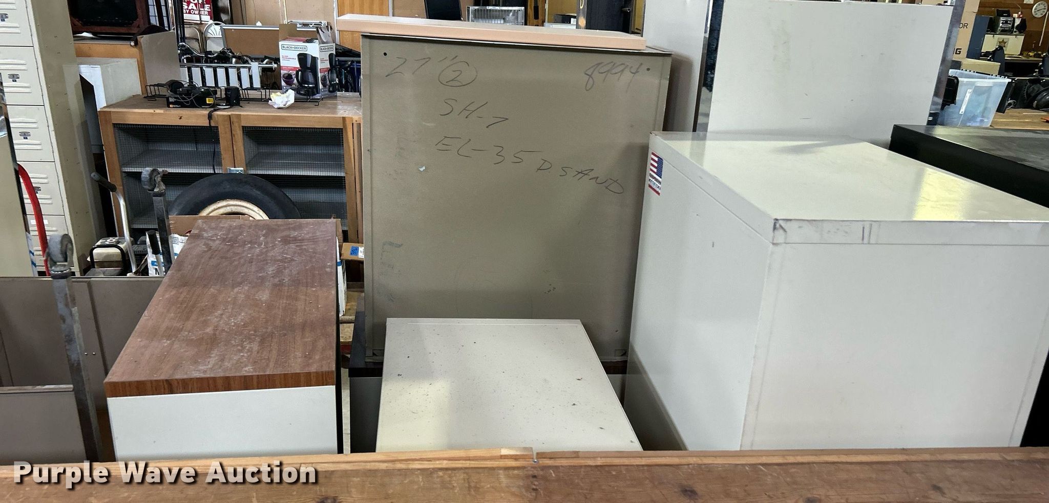 Purple Wave is selling a used Office Supplies and Equip. in Oklahoma. This item is a Office supplies with the following: File cabinets, Book shelves, Computer stands, TV stand, Desk