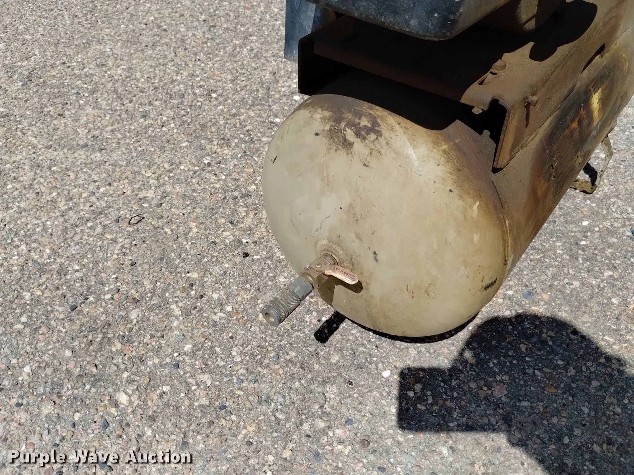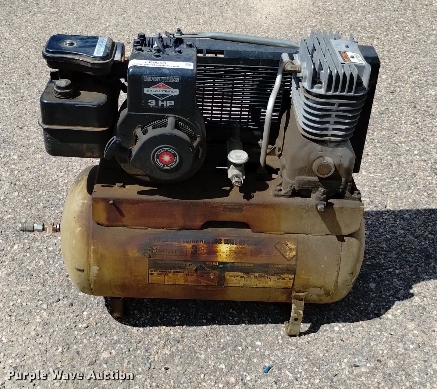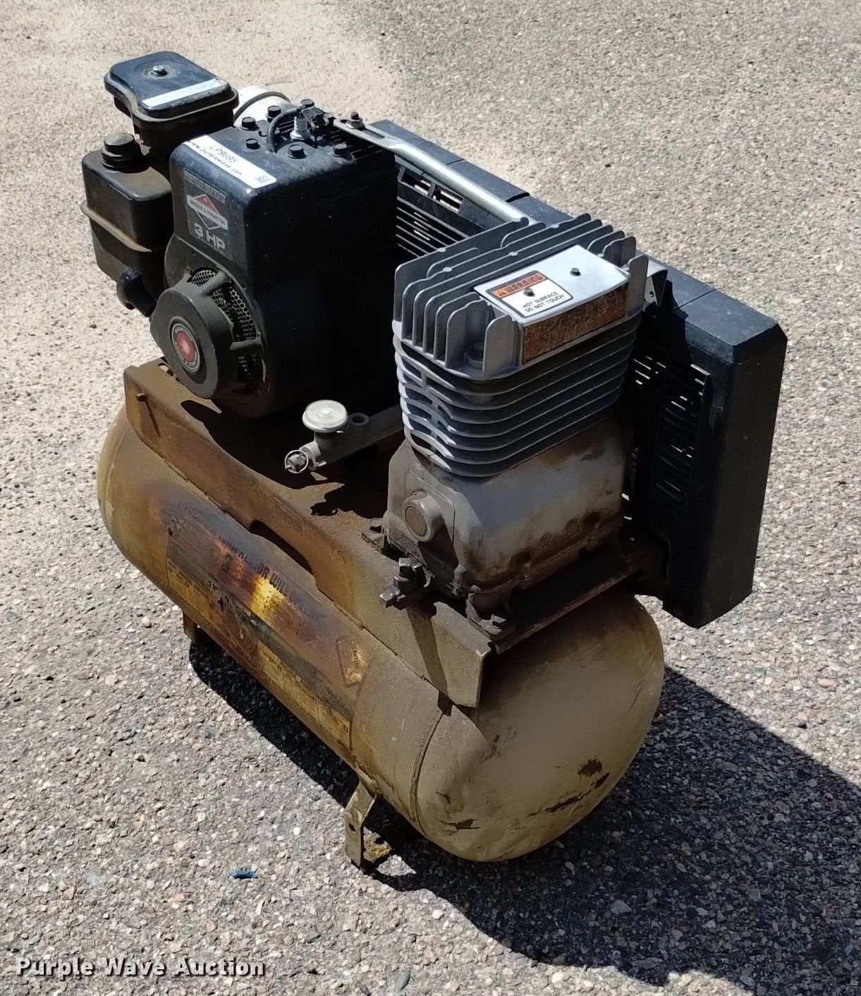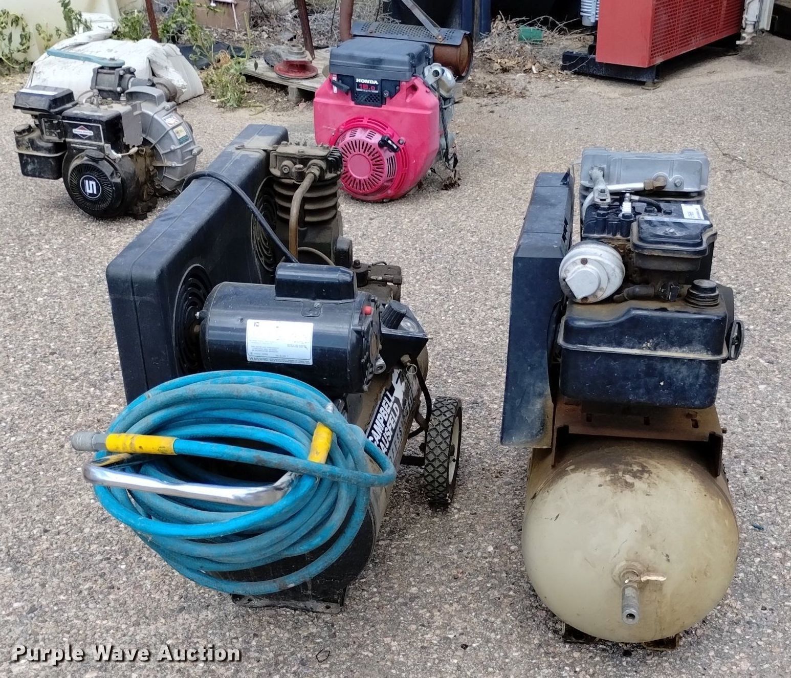 Purple Wave is selling a used Air Compressor in Colorado. This item is a (2) air compressors with the following: Sears, Briggs & Stratton single cylinder gas engine, Tank capacity: 2 gallons, Campbell Hausfeld VS401100AJ, Electric motor, HP: 2, Tank capacity: 11 gallons