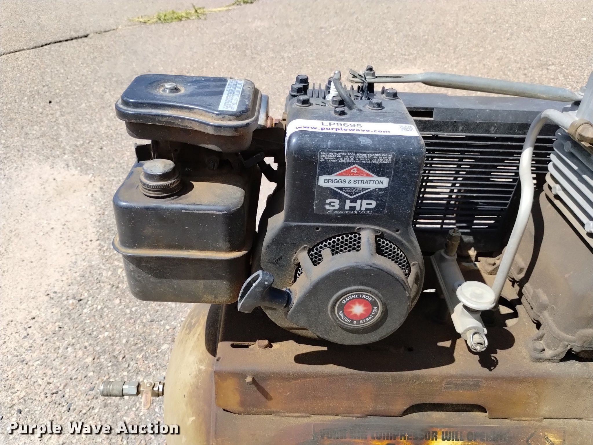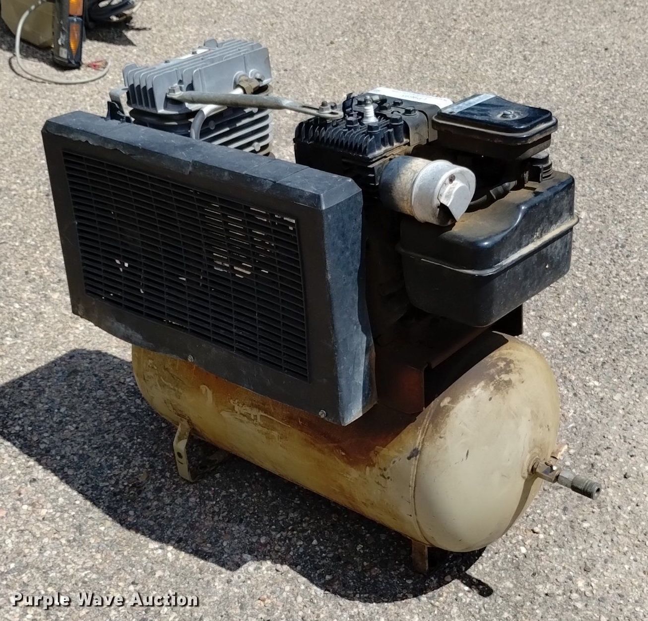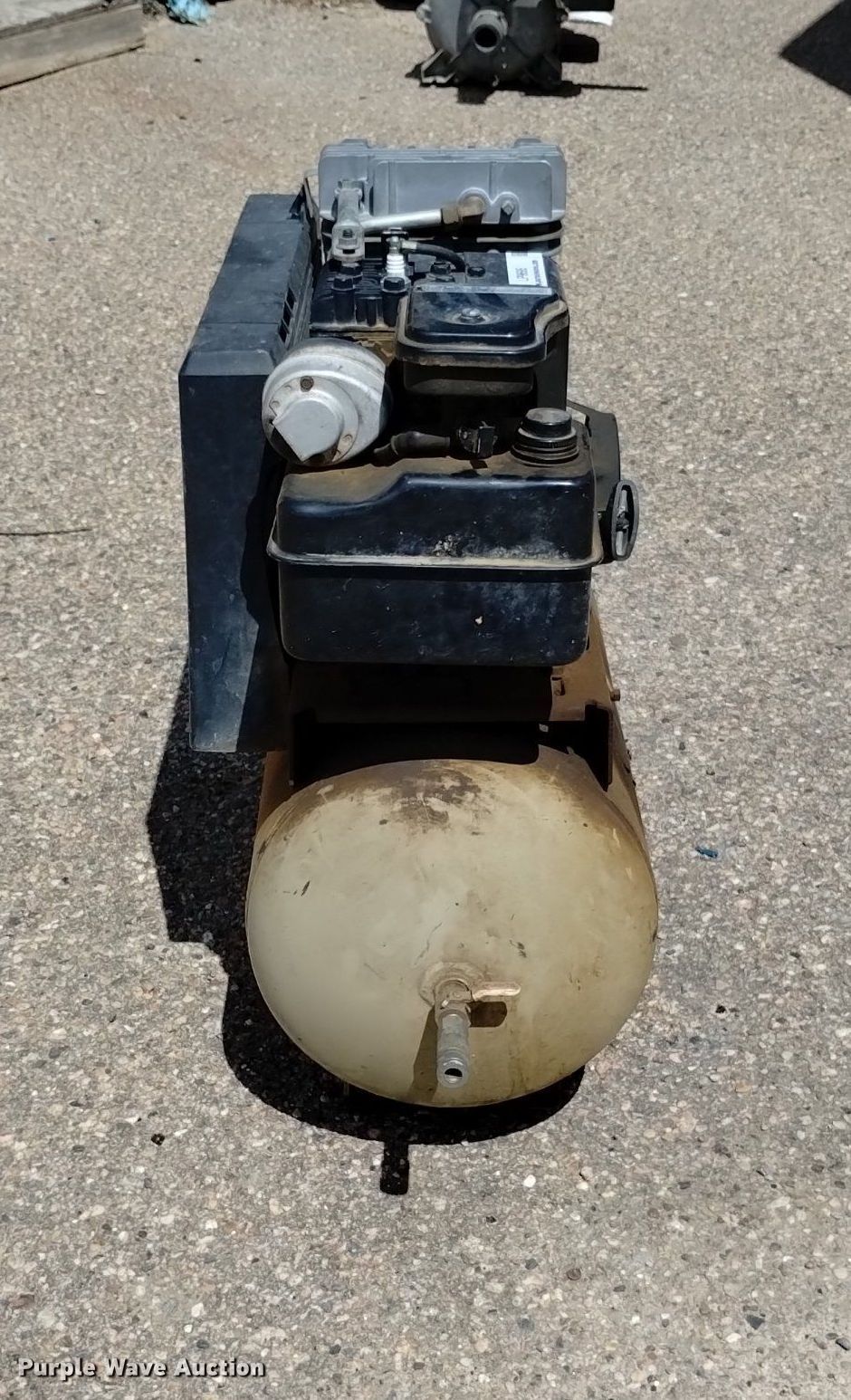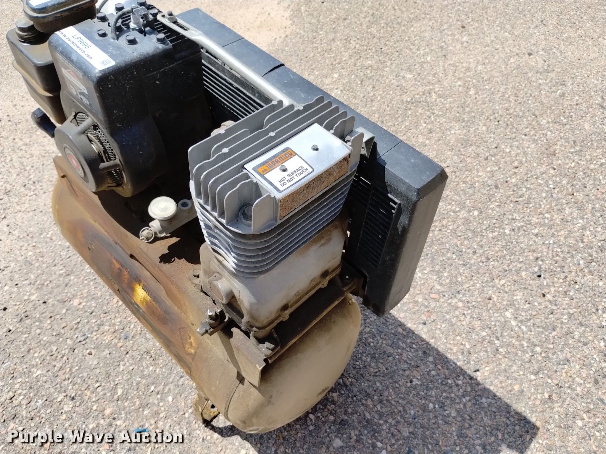 Purple Wave is selling a used Air Compressor in Colorado. This item is a (2) air compressors with the following: Sears, Briggs & Stratton single cylinder gas engine, Tank capacity: 2 gallons, Campbell Hausfeld VS401100AJ, Electric motor, HP: 2, Tank capacity: 11 gallons