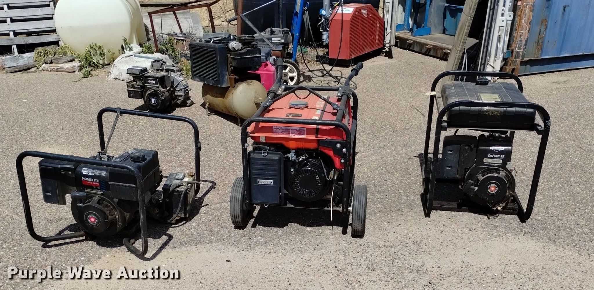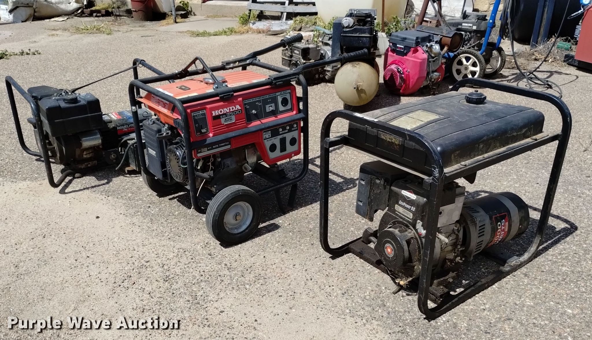 Purple Wave is selling a used Generator Set in Colorado. This item is a (3) generators with the following: GenPower 9.0, Briggs & Stratton single cylinder gas engine, Watts: 5,000, Honda EB3500, Single cylinder gas engine, Max Kva: 3.5, Homelite 4400, Briggs & Stratton single cylinder gas engine, Watts: 4,000
