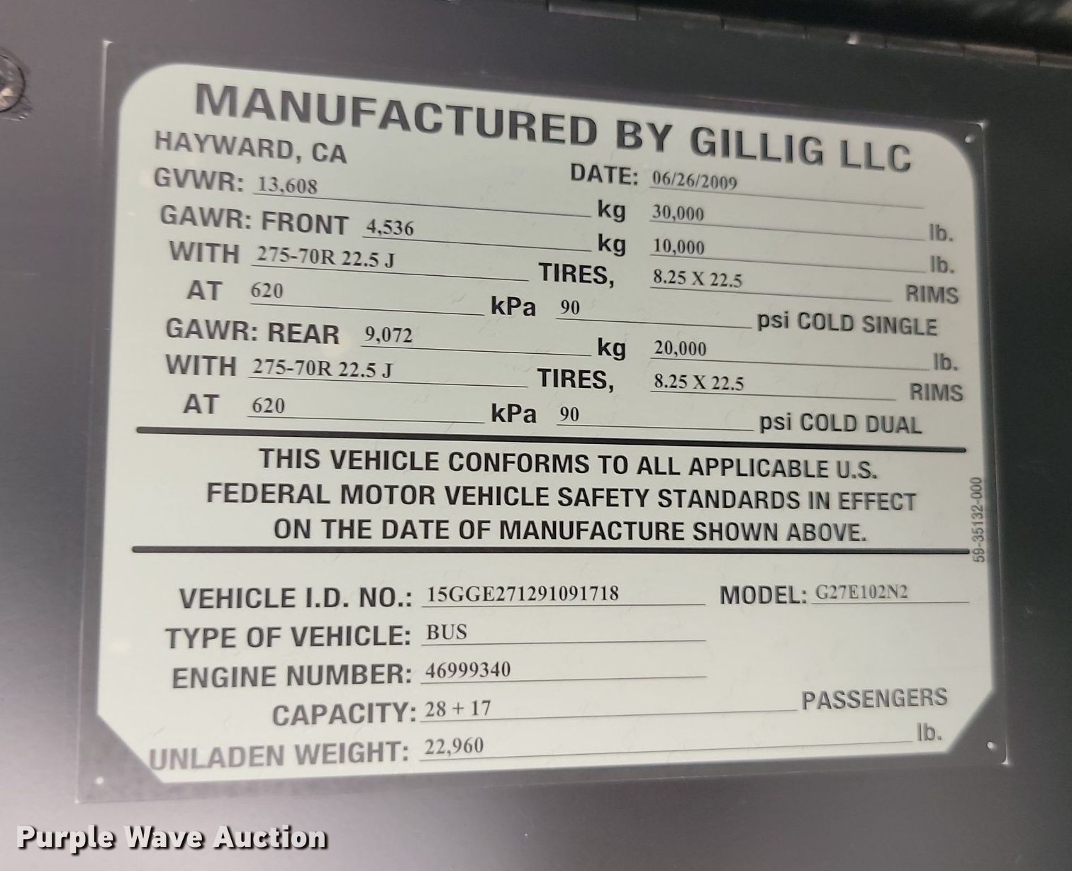 2009 Gillig shuttle bus. Miles: 392,773 on odometer, VIN: 15GGE271291091718, Unit #: 51-38. Engine Cummins ISL, Displacement: 8.9L, Cylinders: 6, Fuel type: Diesel. Transmission Automatic. Chassis Axles: Single, Suspension: Air, Brakes: Air, GVWR: 30,000 lbs. Interior AC, Heat, Electric passenger sliding door, Passengers: 28, Adult seats: 28, Wheelchair ramp. Tires Size: 275/70R22.5. Notes Unknown operating condition. South Dakota title. City of Sioux Falls - Open inspection September 22. 1000 East Chambers Street. Sioux Falls, SD 57104