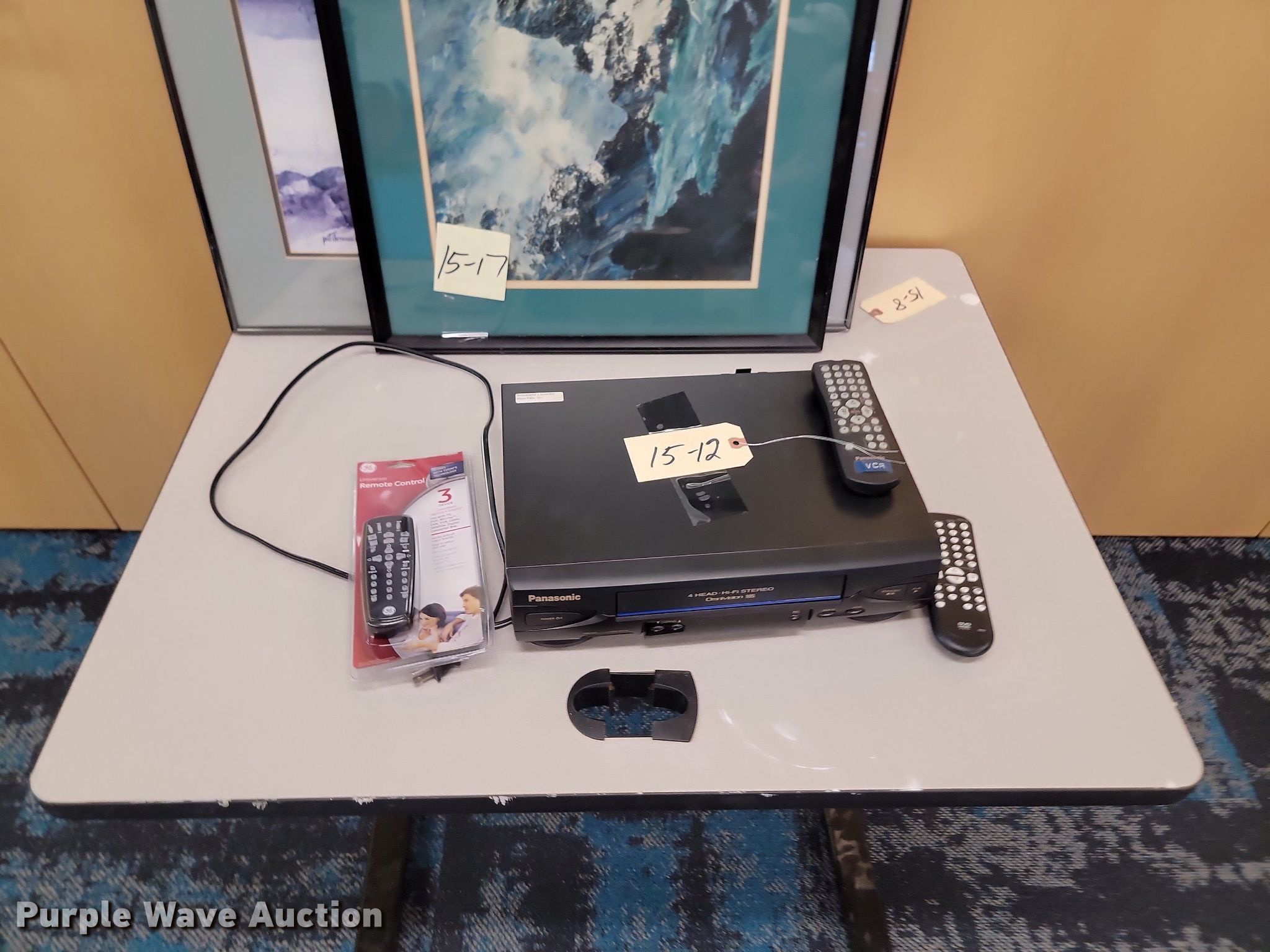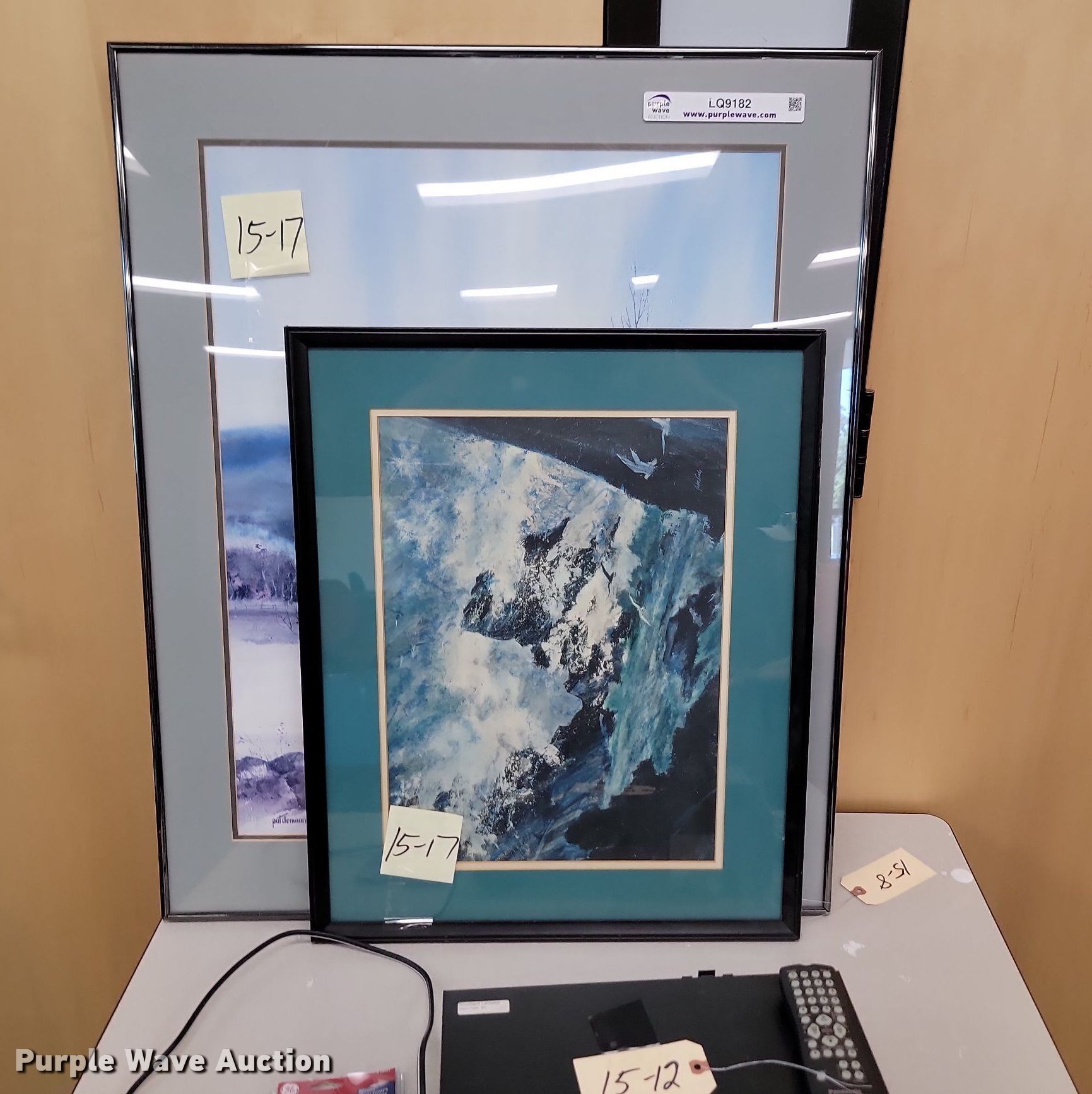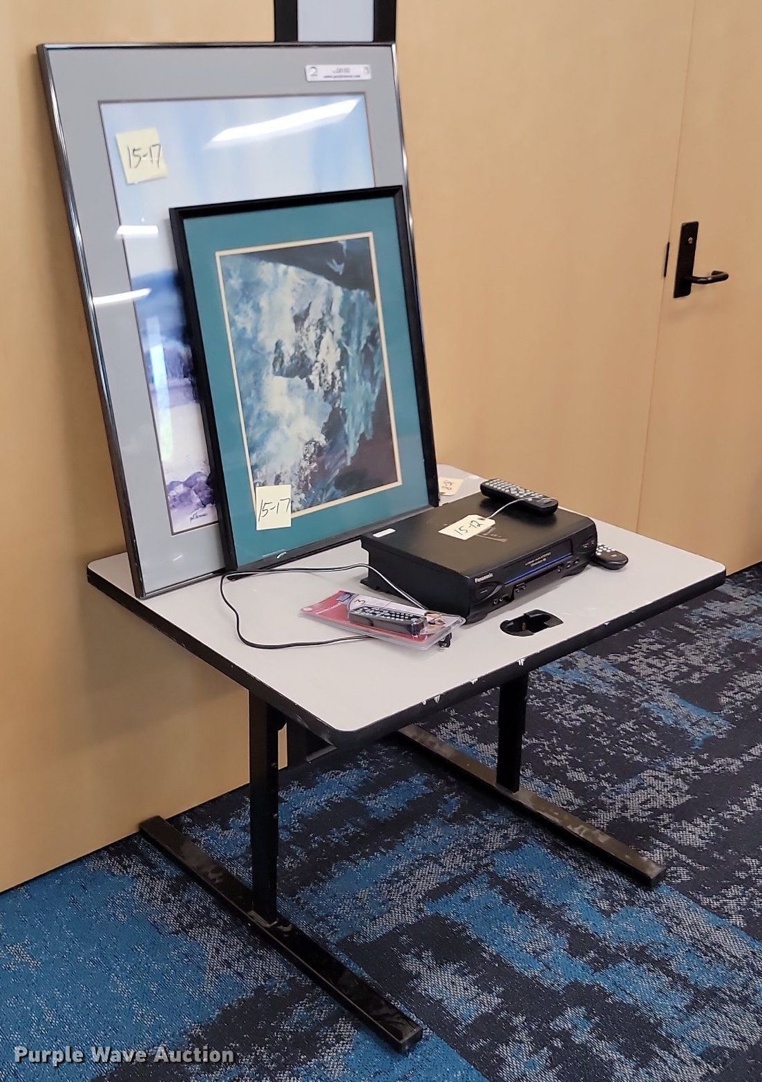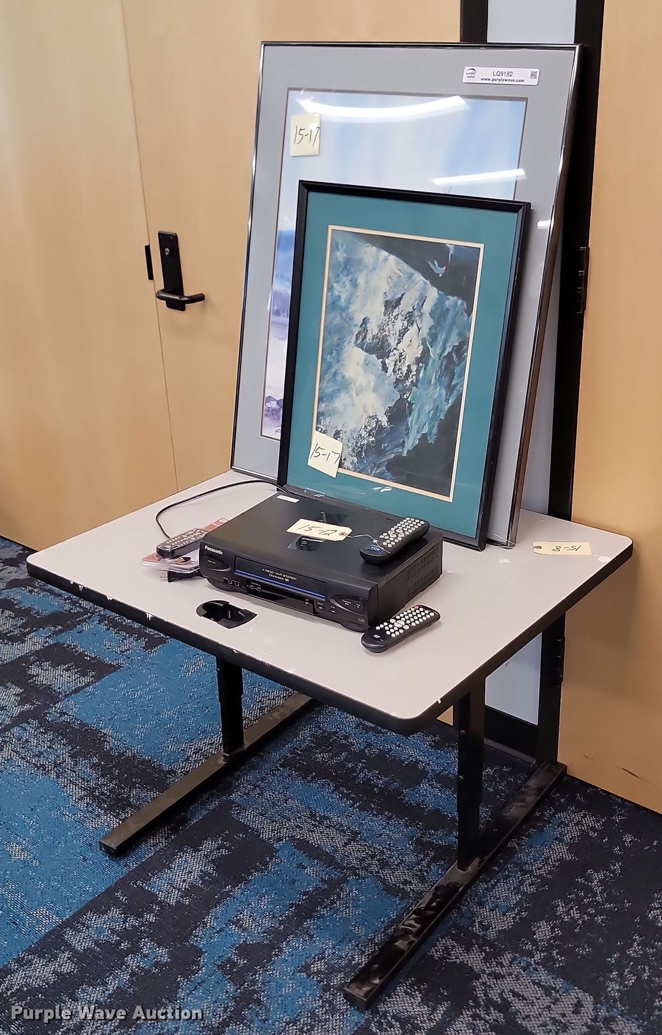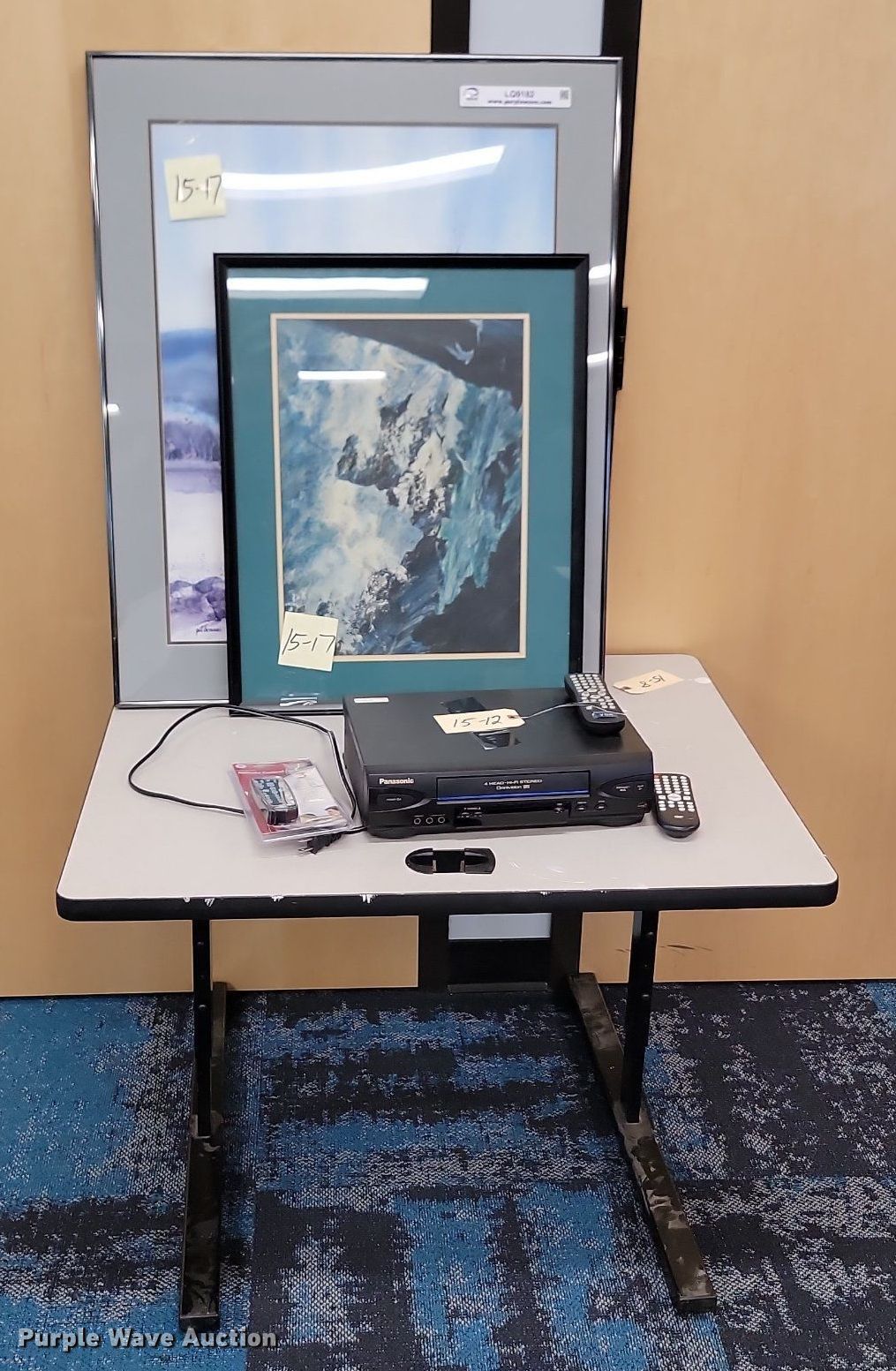 Purple Wave is selling a used Office Supplies and Equip. in South Dakota. This item is a Office supplies and equipment with the following: (2) framed wall art, Table, VHS player