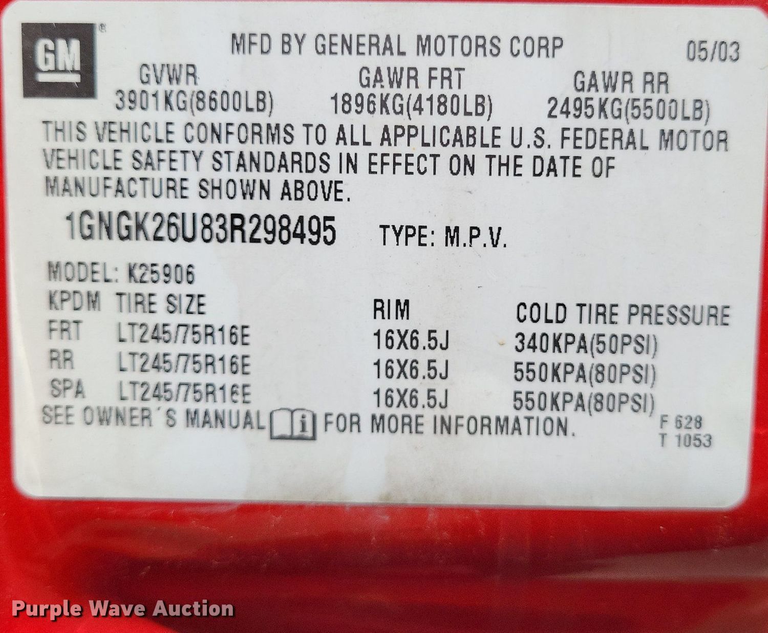 Purple Wave is selling a used Passenger Vehicle in Missouri. This item is a 2003 Chevrolet Suburban 2500 SUV with the following: Miles: 166,790 on odometer, VIN: 1GNGK26U83R298495, Unit #: 3401
