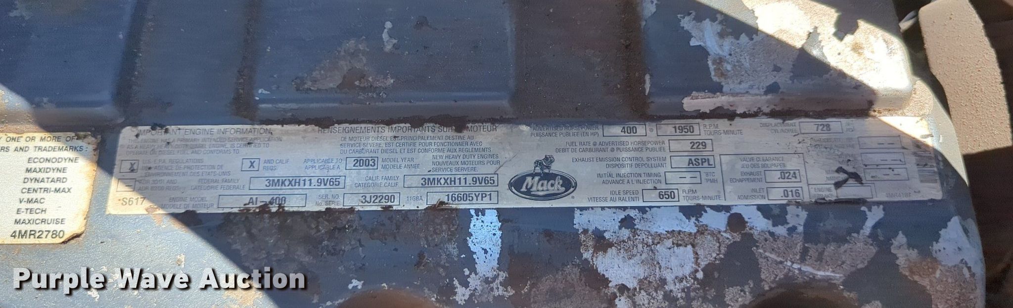 2004 Mack CV713 Granite dump truck. Miles: 304,335 on odometer, Hours: 15,992 on meter, VIN: 1M2AG11Y64M009743. Engine Mack Maxicruise, Displacement: 12.0L, Cylinders: 6, Fuel type: Diesel. Transmission Eaton Fuller 8LL, Manual, Speed: 10. Chassis Axles: Tandem, Differential lock: Inter-axle, Suspension: Camelback, Brakes: Air. Interior AC, Heat, Cruise control. Features Dump bed Godwin 500t, 14' L x 96" W, Side height: 36", Side board height: 9", Bed type: Steel, Ram: Single , End gate: Air operated. Tires Size: 11R24.5. Notes Dash warning indicator: ABS. Oklahoma title. Title distribution may be delayed up to 30 days from verification of funds. Oklahoma County - Open inspection September 25. 7105 South Anderson Road. Oklahoma City, OK 73150