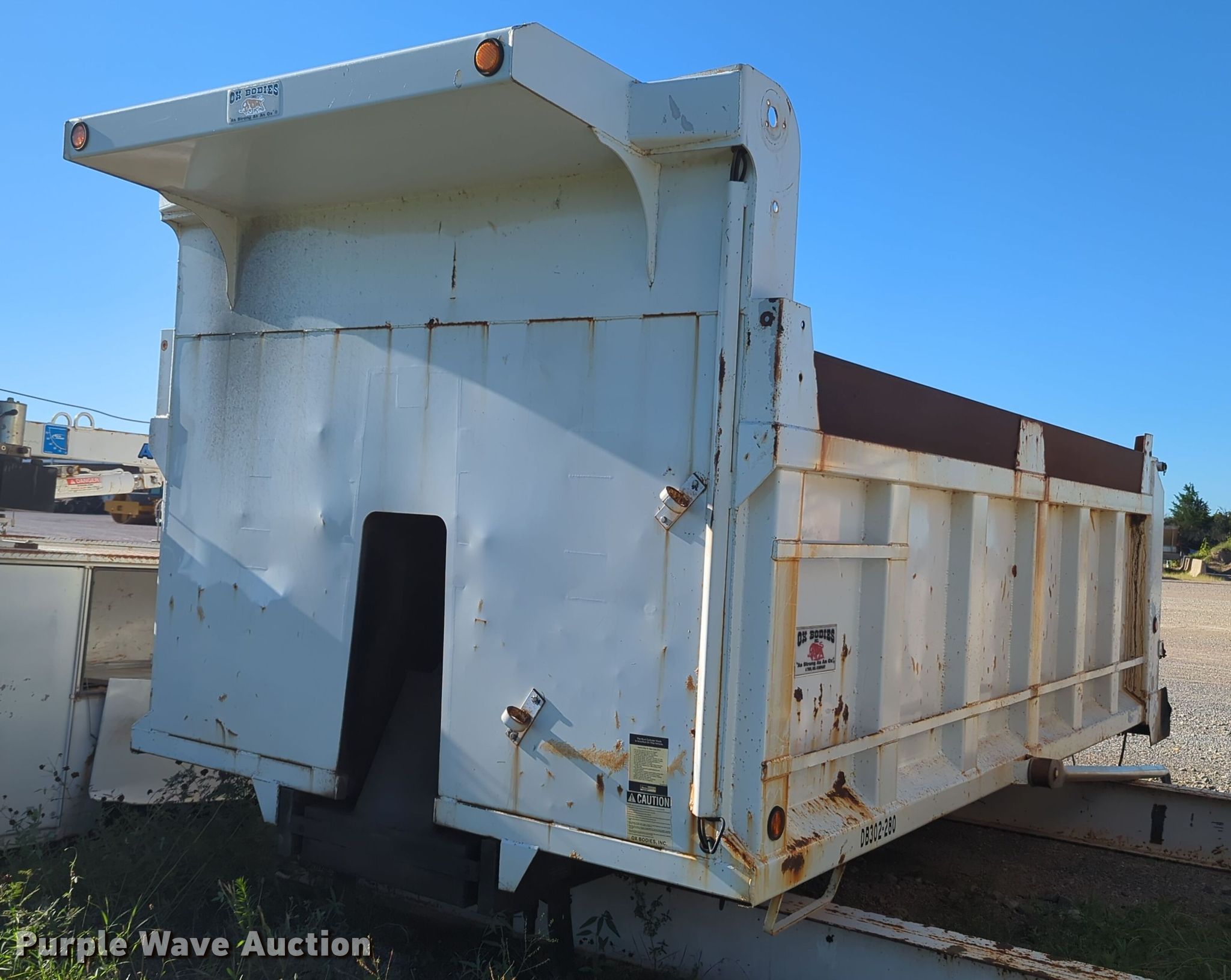 Purple Wave is selling a used Truck Part and Attach. in Oklahoma. This item is a Ox Bodies dump bed with the following: 14' L x 96" W, Side height: 42", Side board height: 8", Bed type: Steel, Roll tarp, Ram: Single, End gate: Air operated
