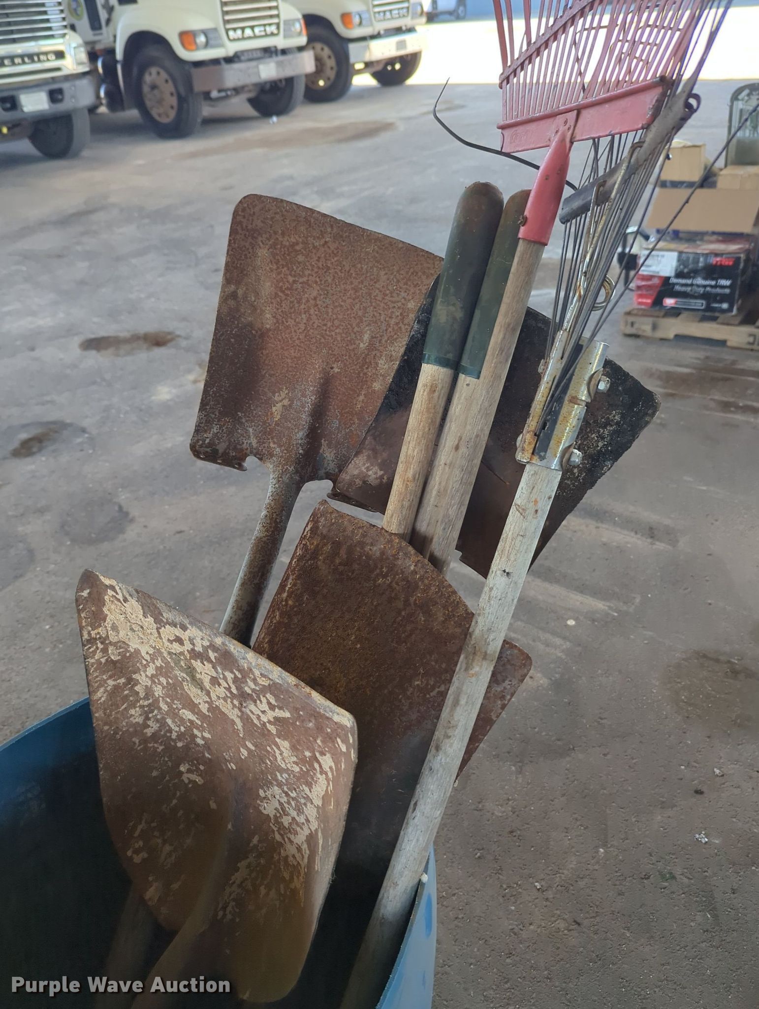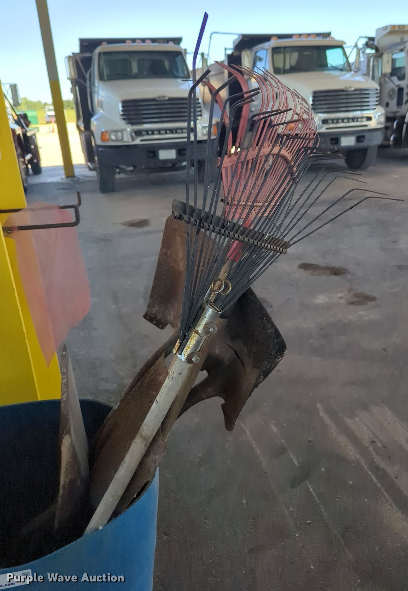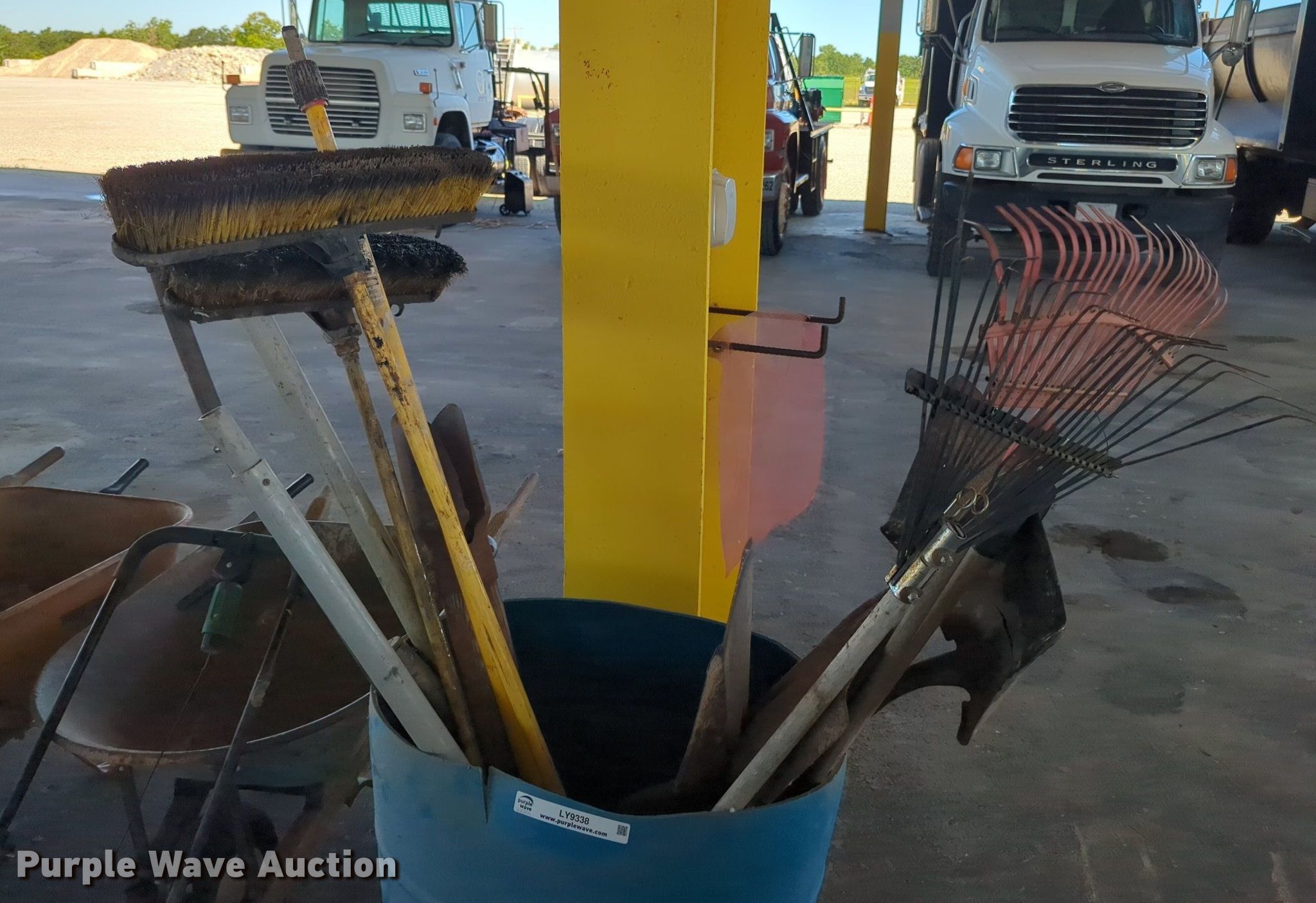 Purple Wave is selling a used Lawn and Garden in Oklahoma. This item is a Lawn equipment with the following: (3) Scotts Turf Builder spreaders, (3) wheel barrows, Shovels, Brooms, Rakes and more