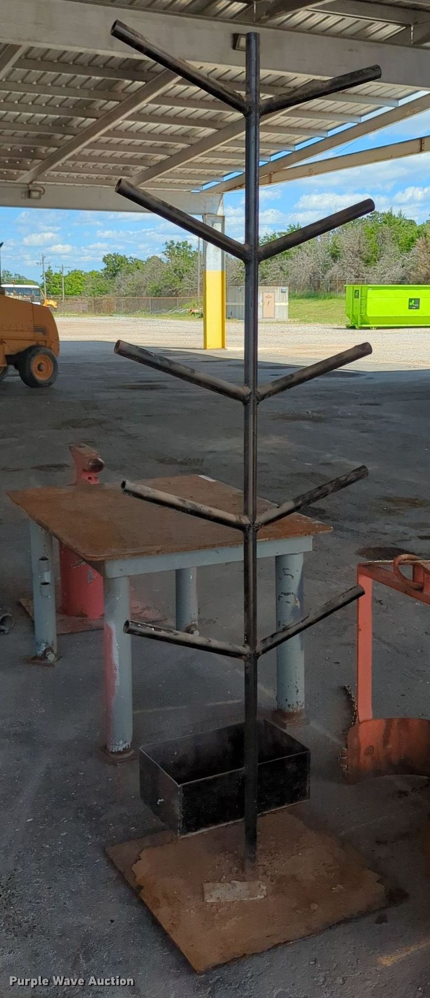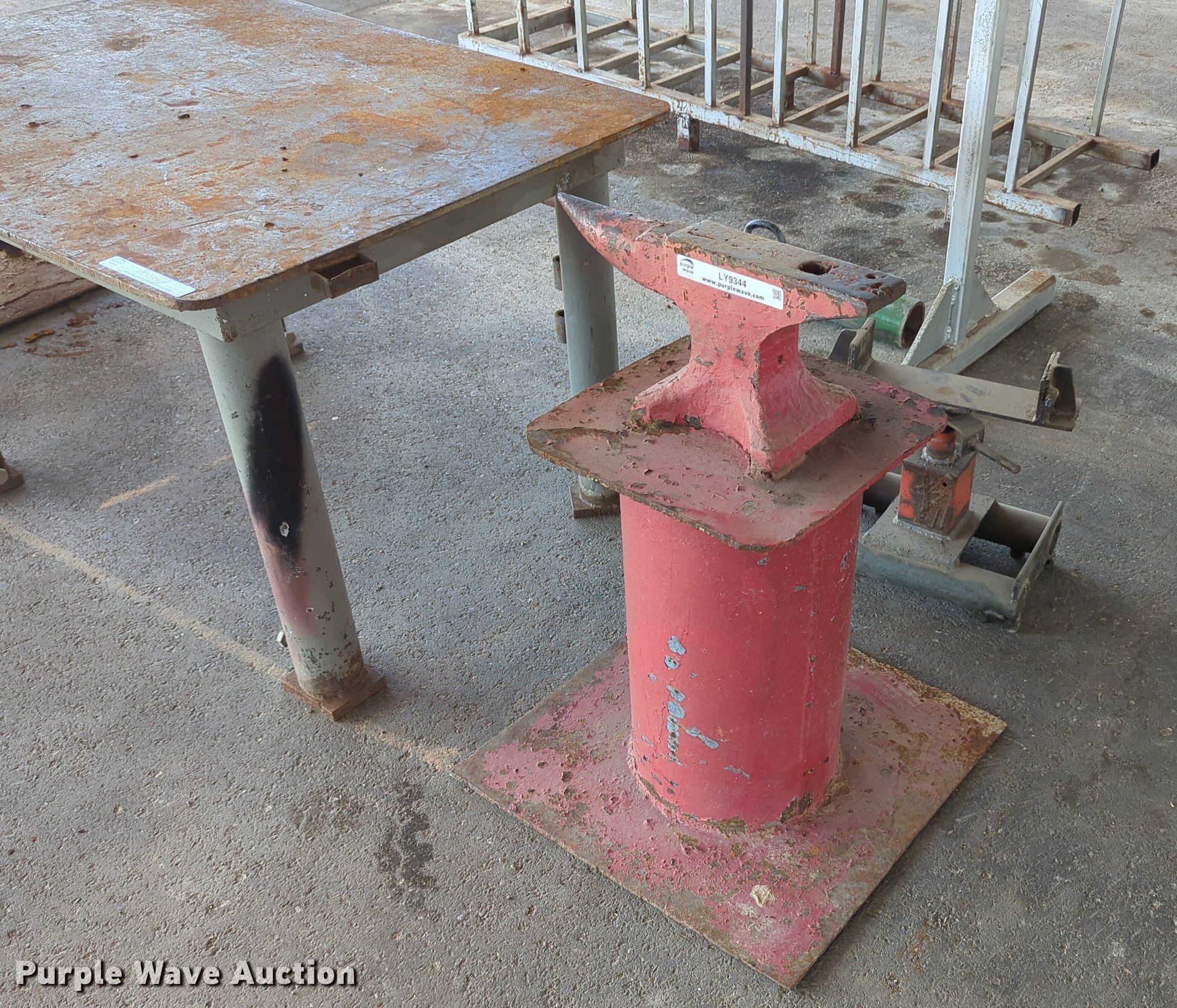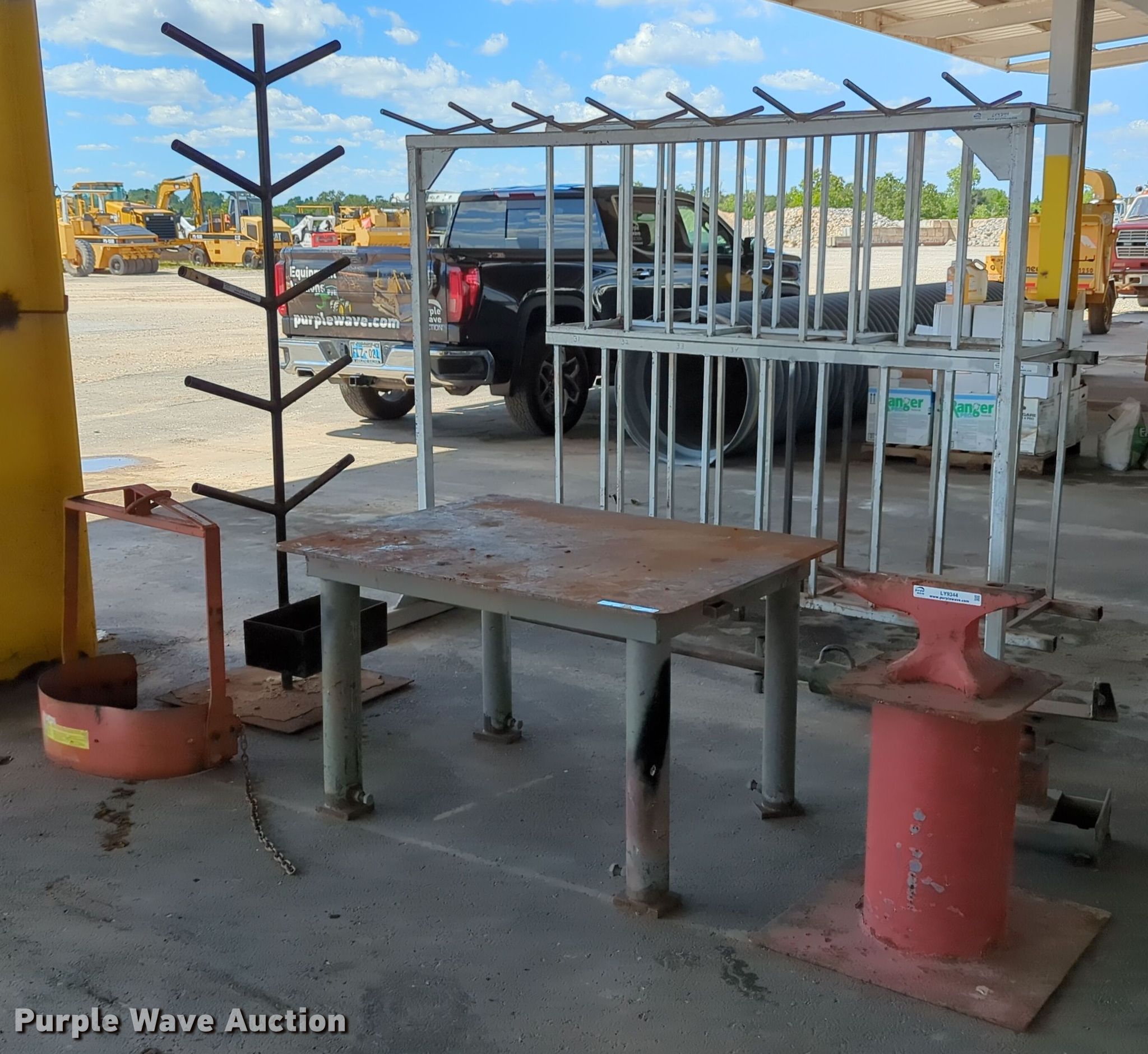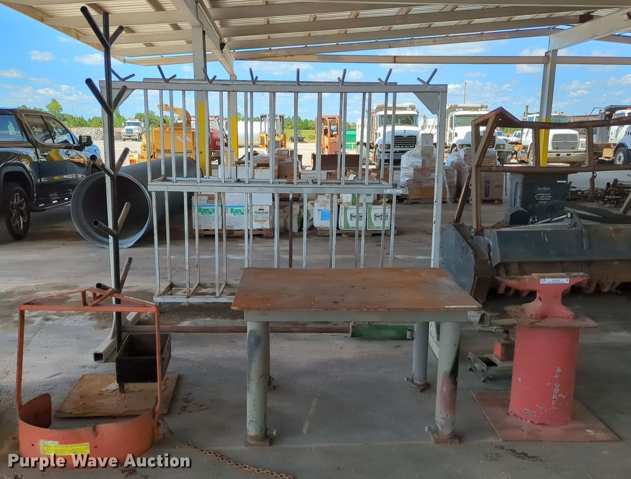 Purple Wave is selling a used Tools in Oklahoma. This item is a Tools with the following: Anvil, Shop built table, (3) shop built racks