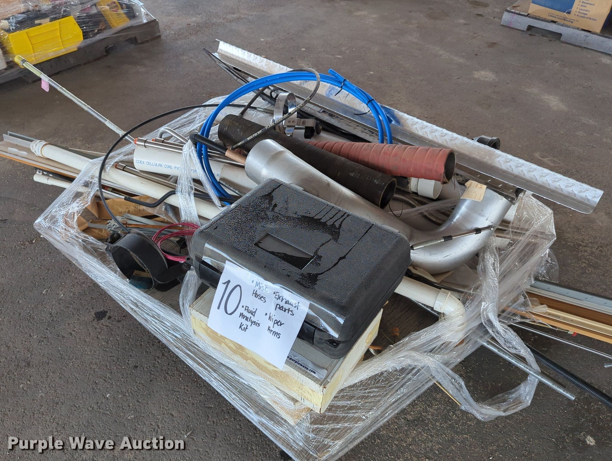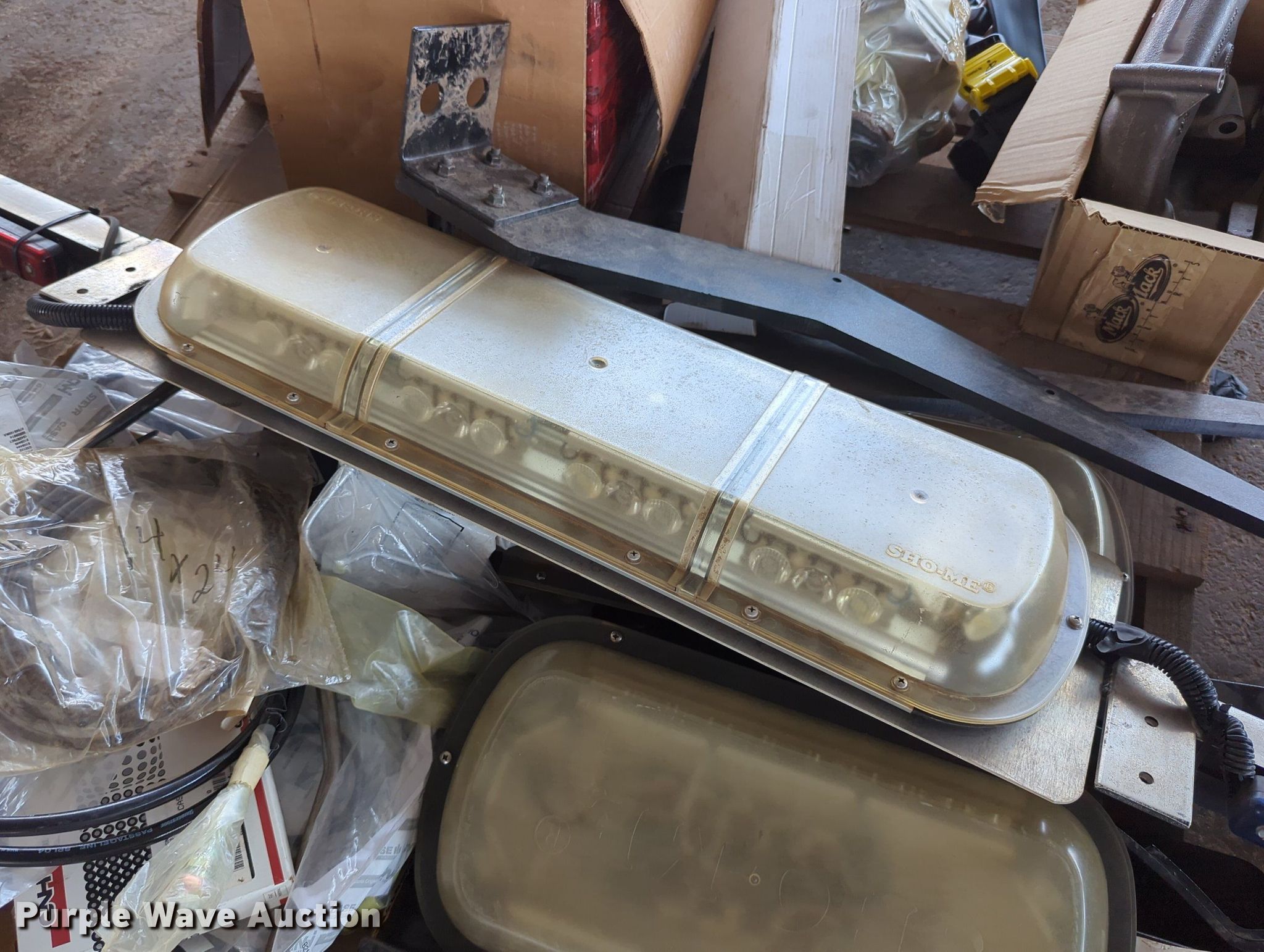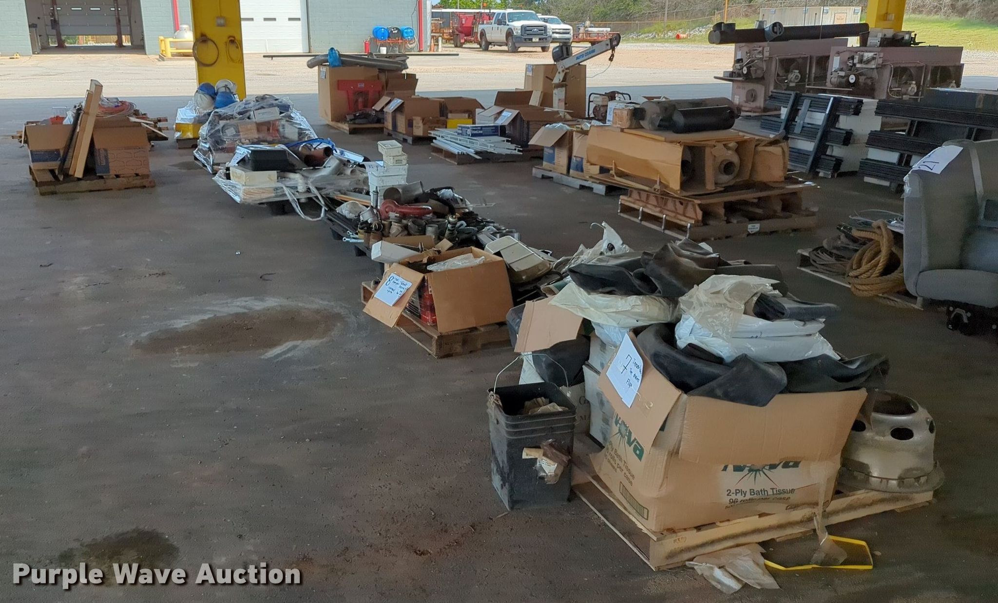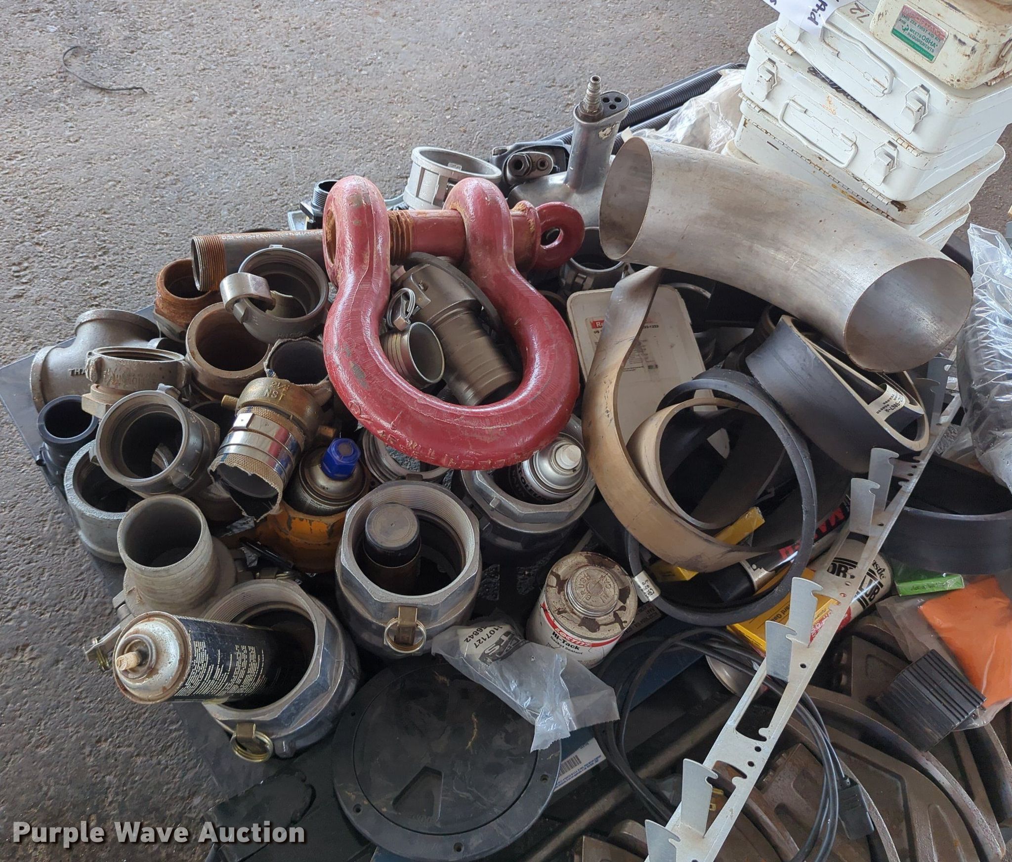 Purple Wave is selling a used Tools in Oklahoma. This item is a (16) pallets of tools with the following: Mack truck parts, Overhead safety lighting, Pipe fittings, Hoses, Fluid analysis kit, Exhaust parts, AC condensers, Pipe bender, Shelving and more