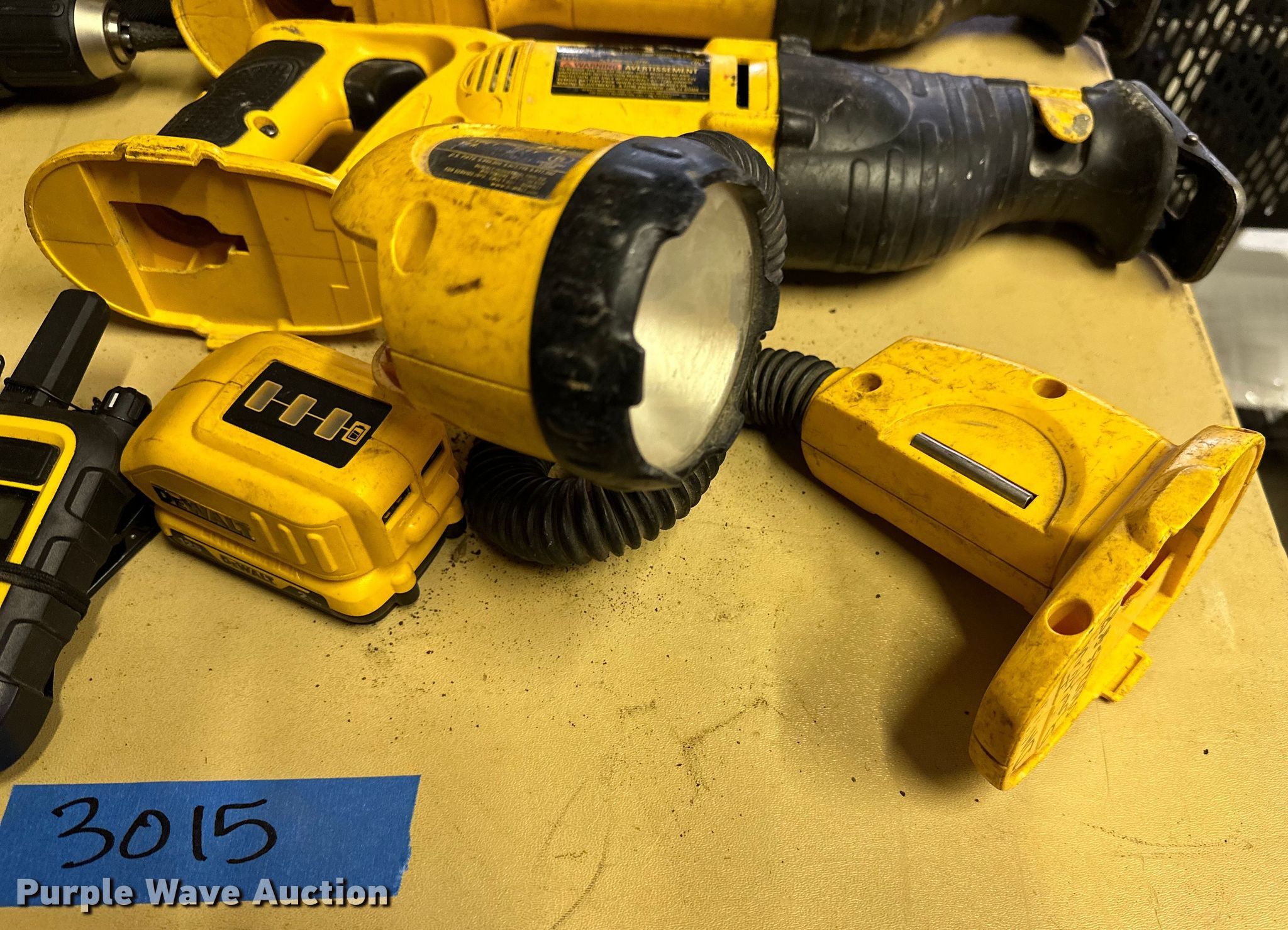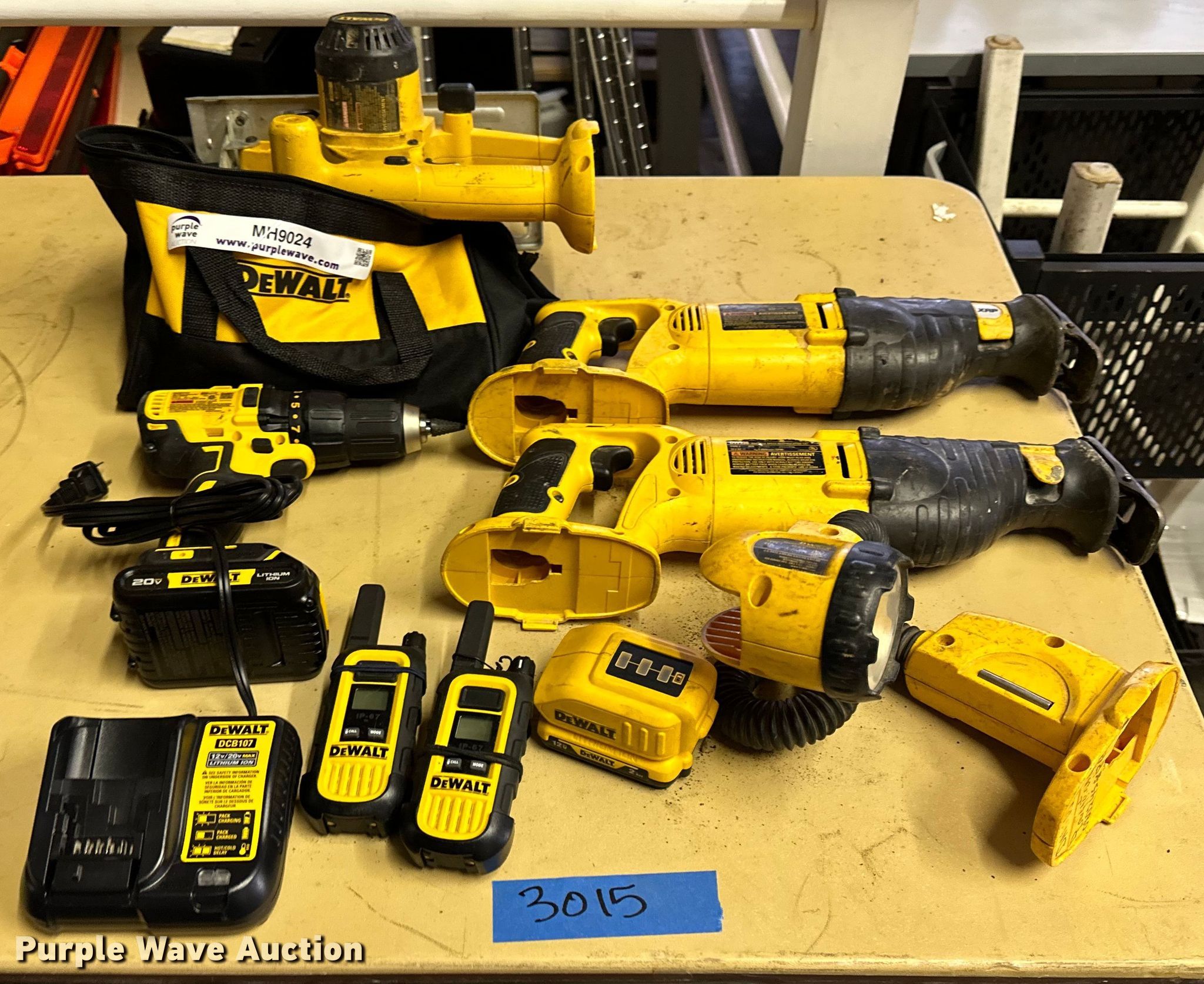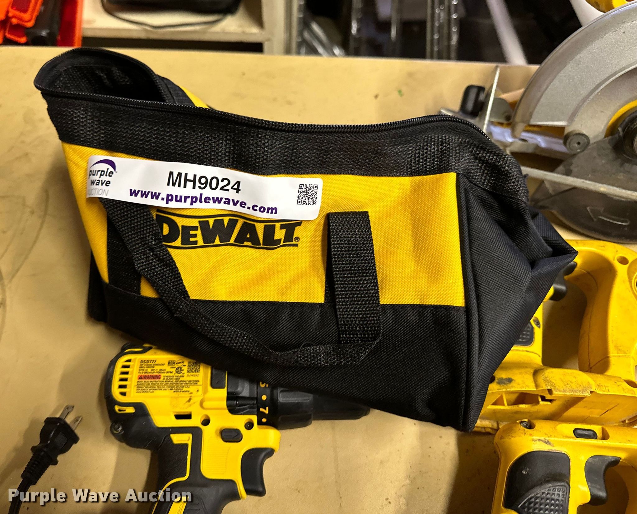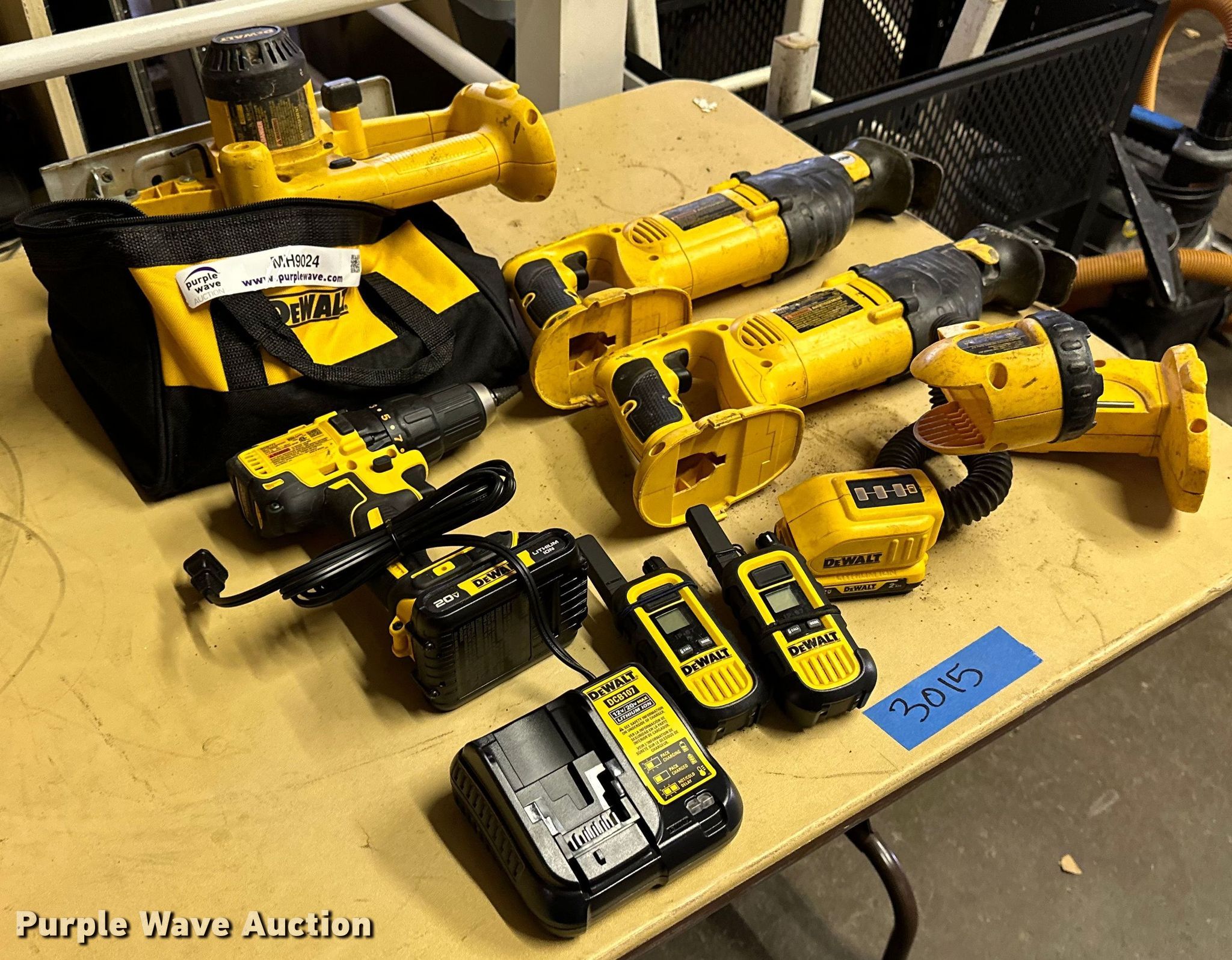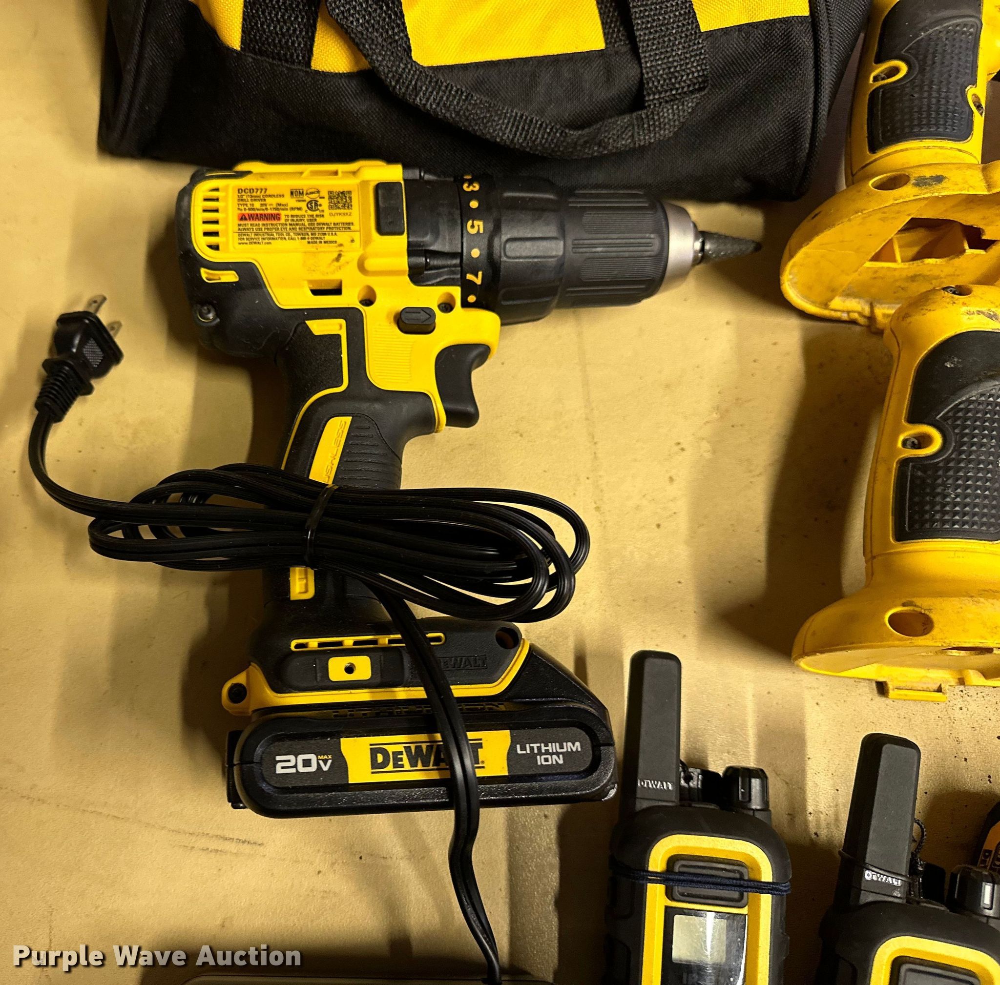 Purple Wave is selling a used Tools in Oklahoma. This item is a DeWalt tools with the following: DCB107 charger, DCD777 cordless drill, DW919 light, DW938/DC385 reciprocating saw, DW939 circular saw, Carrying bag, Unit #: 3015