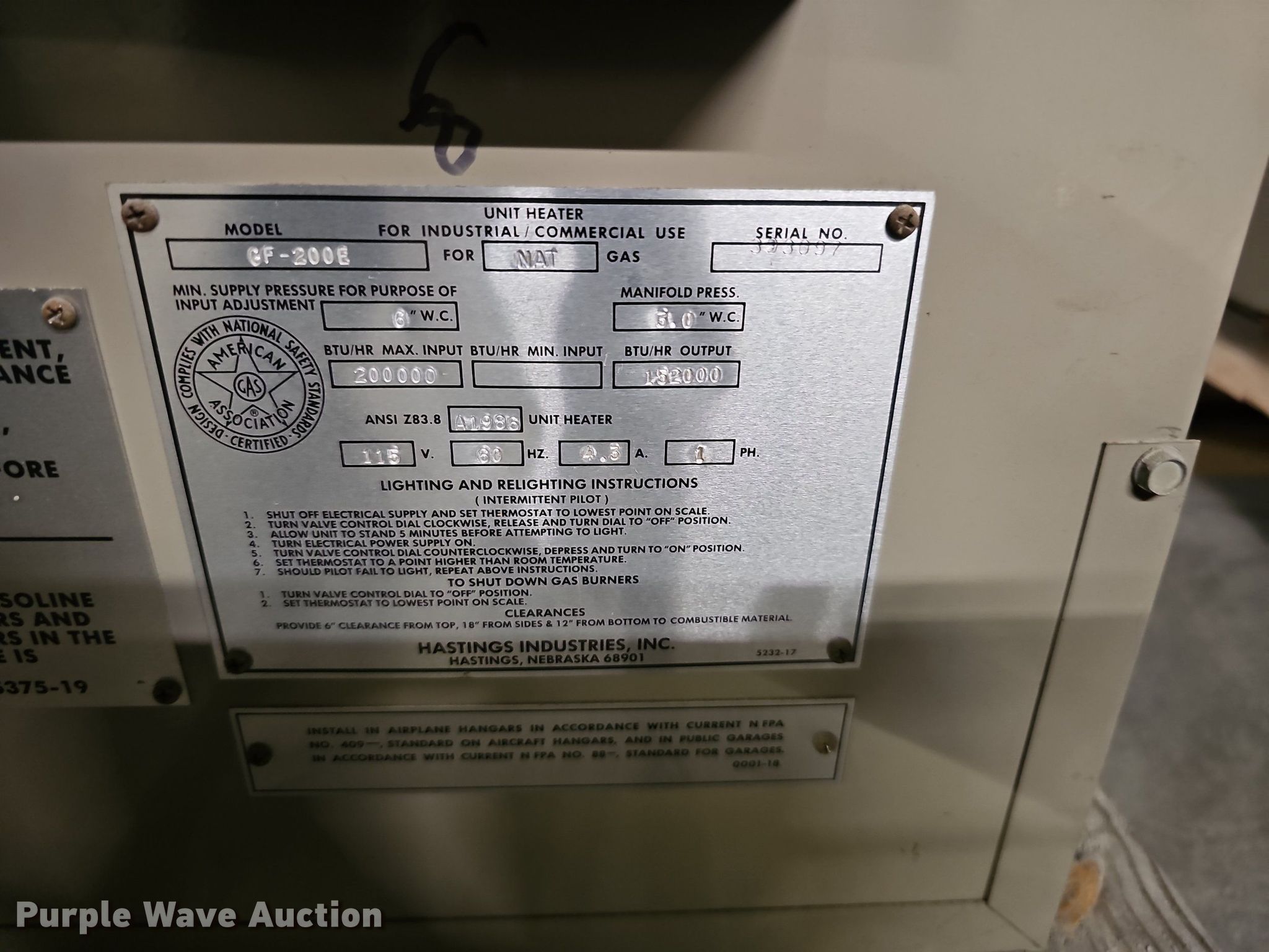 Purple Wave is selling a used Appliances in Nebraska. This item is a (2) Hastings furnaces with the following: 29"L x 29"W, 115V, Natural gas fired, 200,000 BTU per hour input, 152,000 BTU per hour output