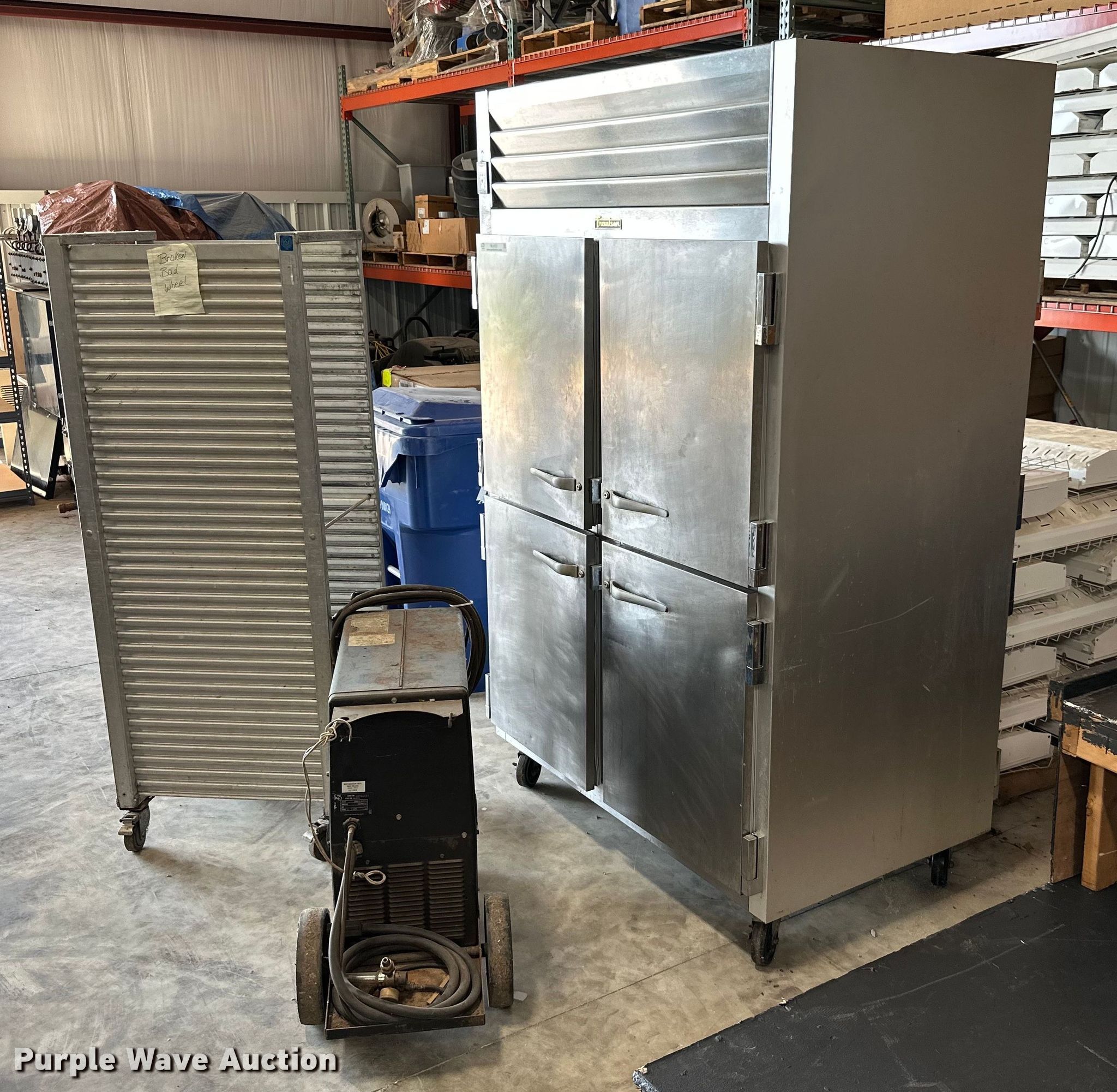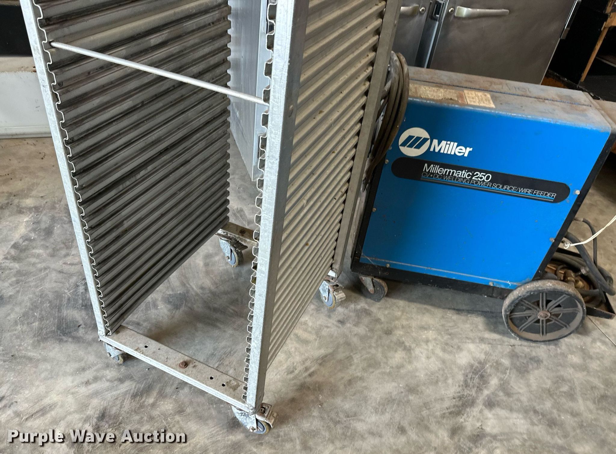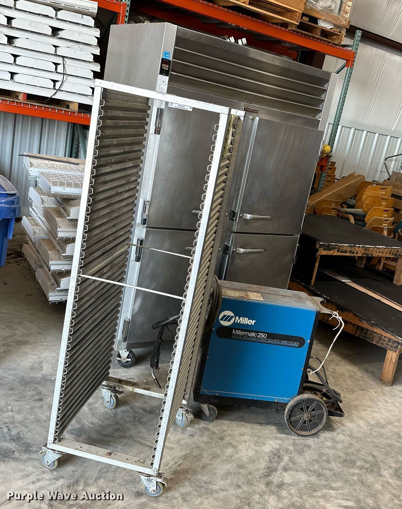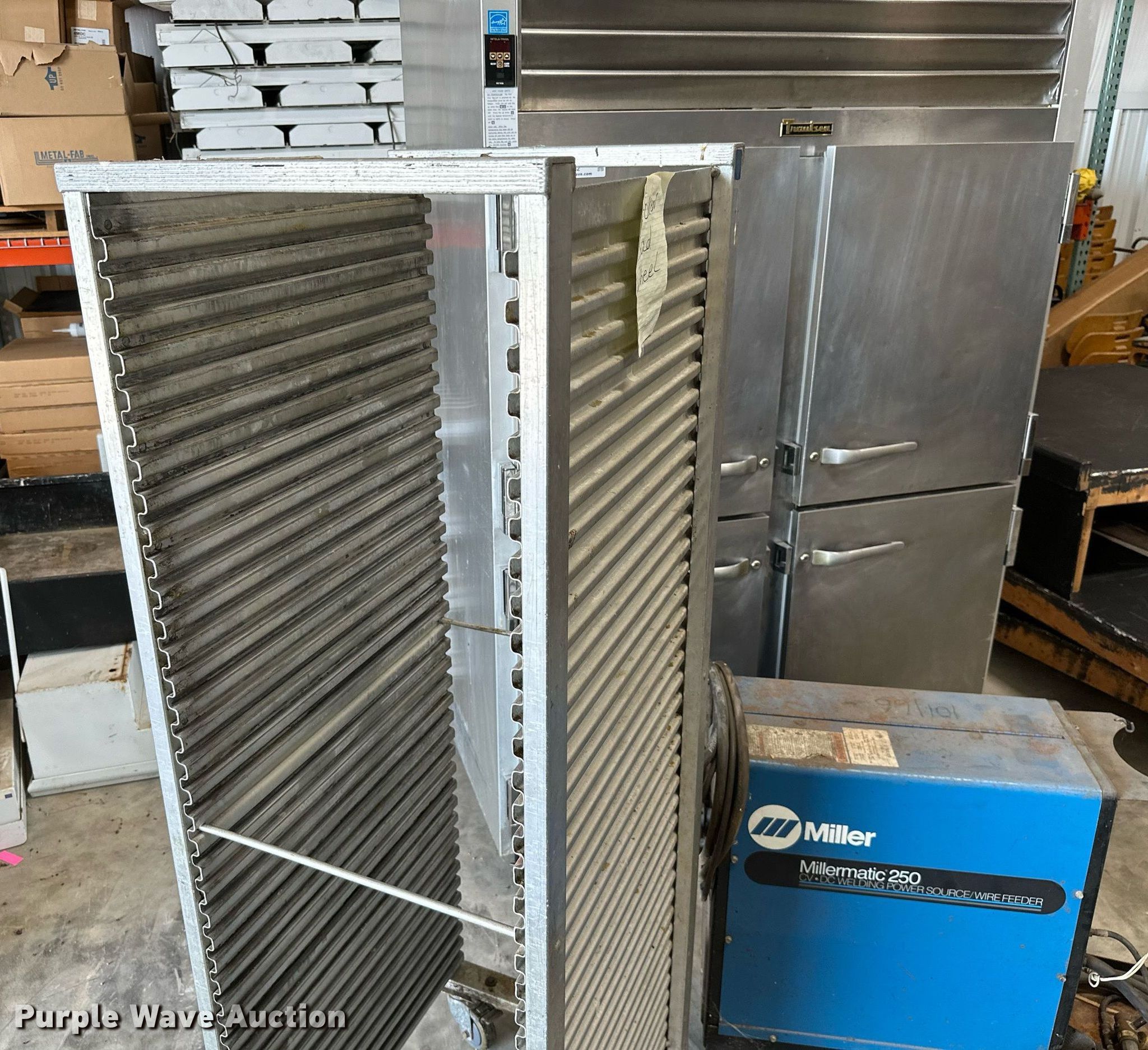 Purple Wave is selling a used Tools in Oklahoma. This item is a Tools with the following: Millermatic 250 CV/DC wire welder, Non-operational unit, parts only, Traulsen food warmer, Approx. 14 lights, Food rack