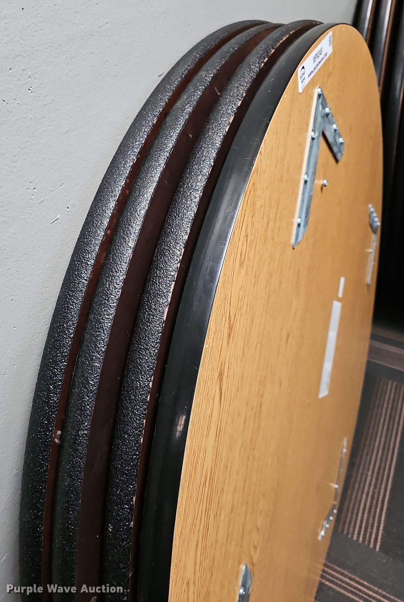Purple Wave is selling a used Furniture in Kansas. This item is a (4) round tables with the following: 4' Diameter, Legs included