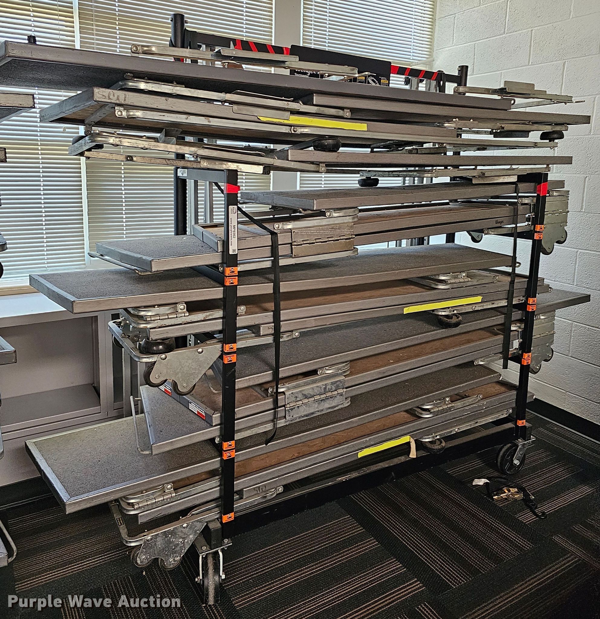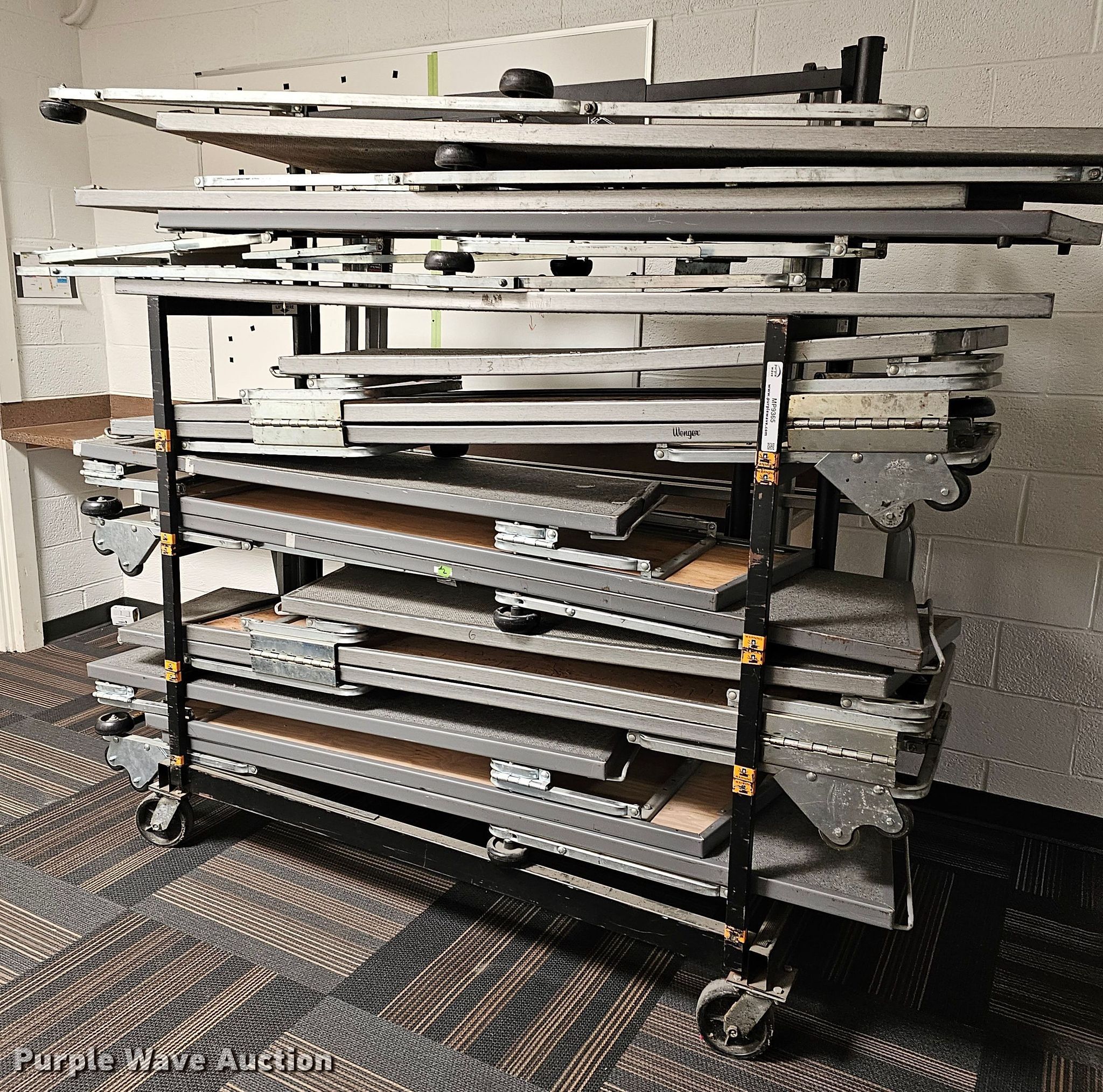 Purple Wave is selling a used Furniture in Kansas. This item is a Stage risers with cart with the following: (8) risers, 7' x 28"