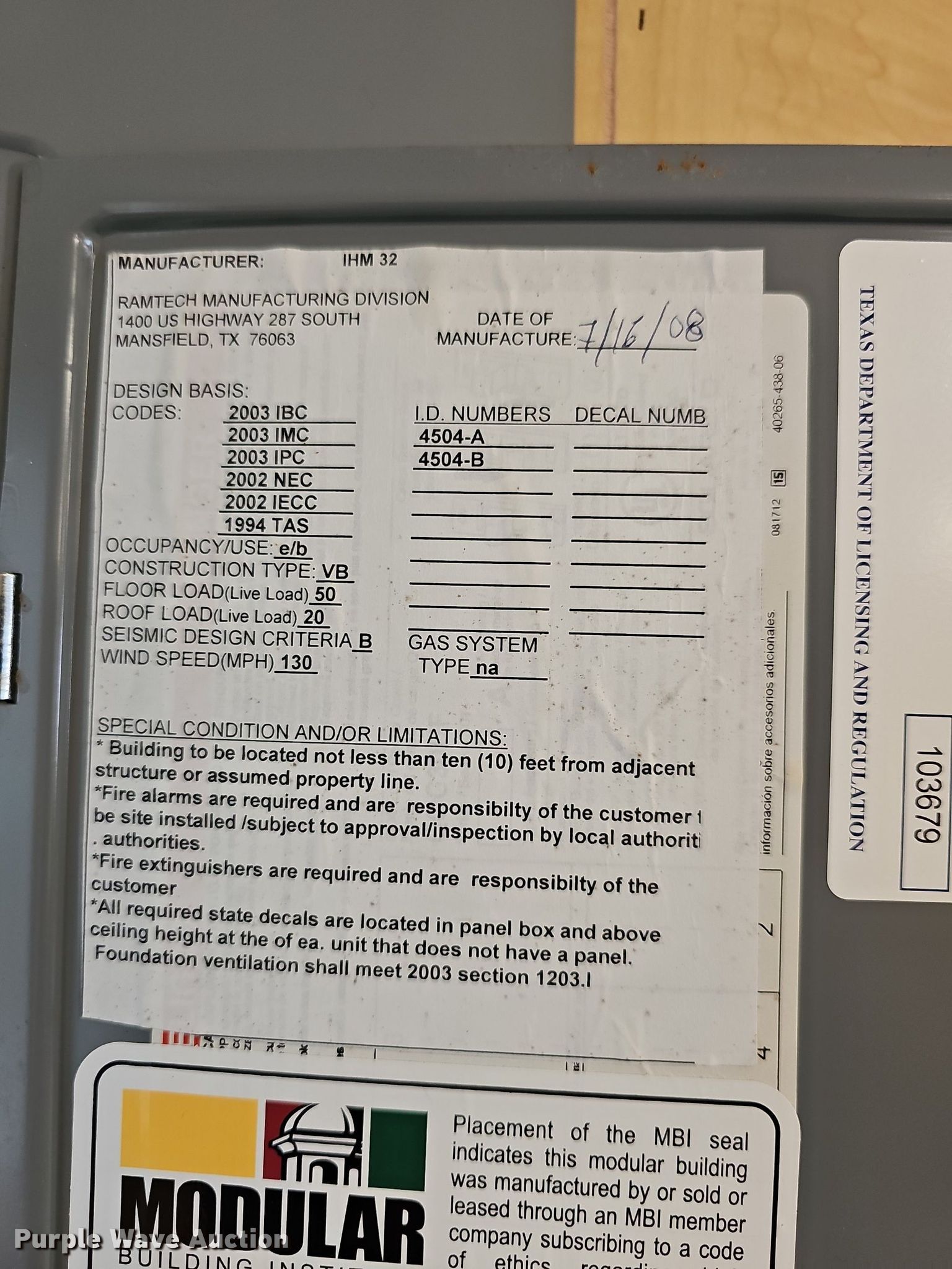 Purple Wave is selling a used Manufactured Home or Office in Kansas. This item is a 2008 Ramtech UHM32 modular classroom with the following: 64' 4" L x 24' 6" W x 11' 8" H, (2) classrooms, Bathrooms, Electric and water will be disconnected prior to auction, Deck not included, Contents not included, VIN: 4504-A, 4504-B