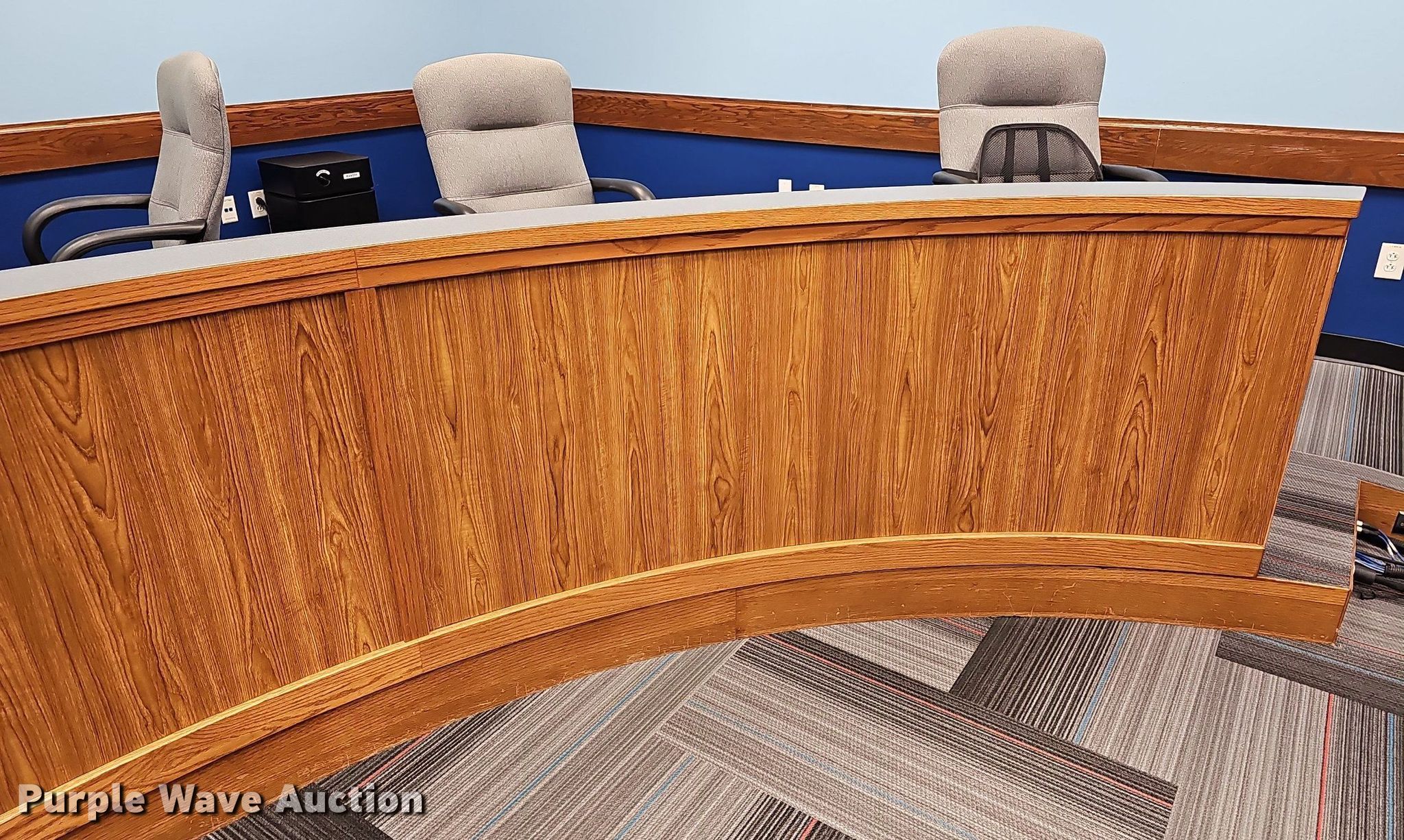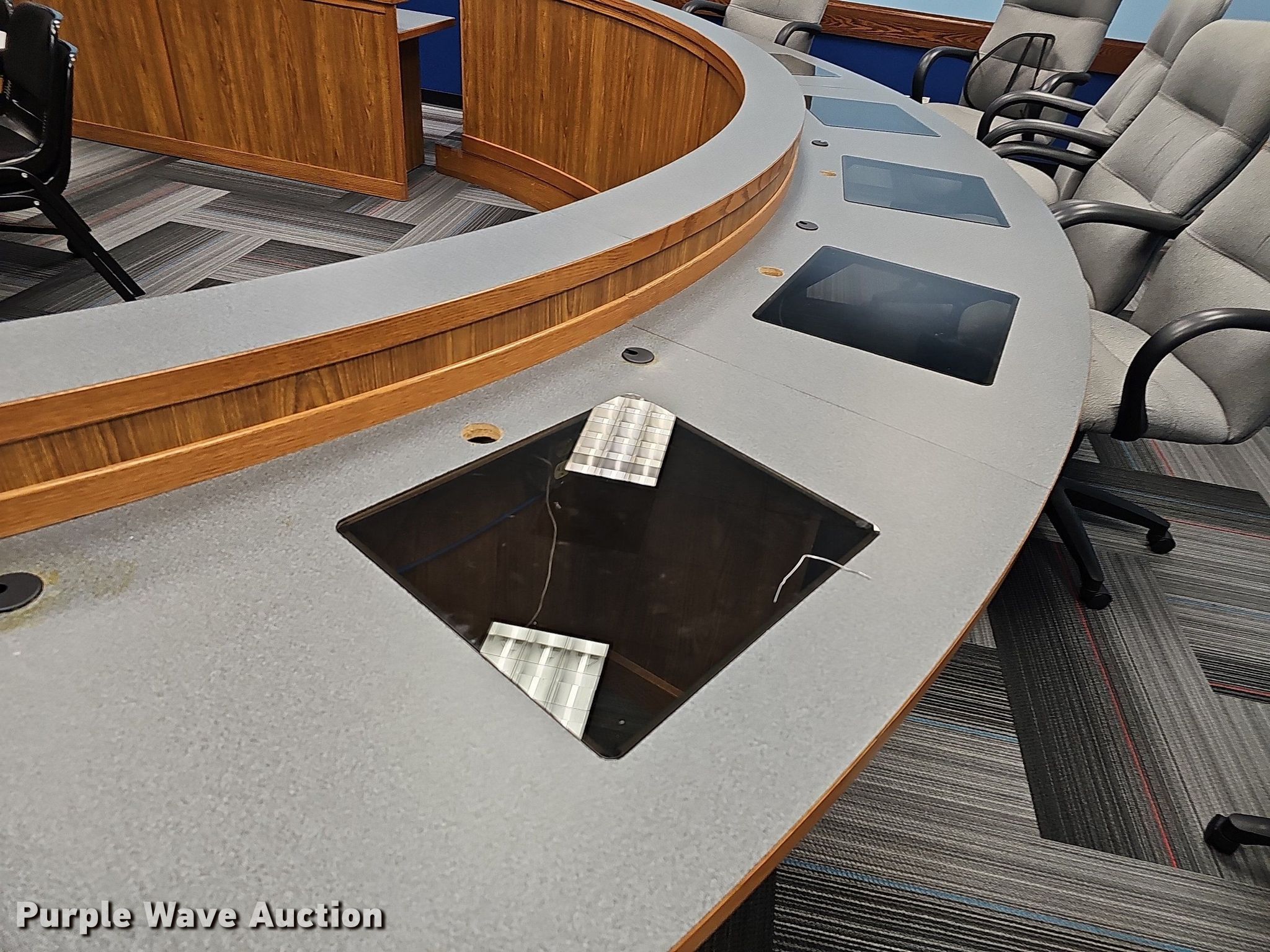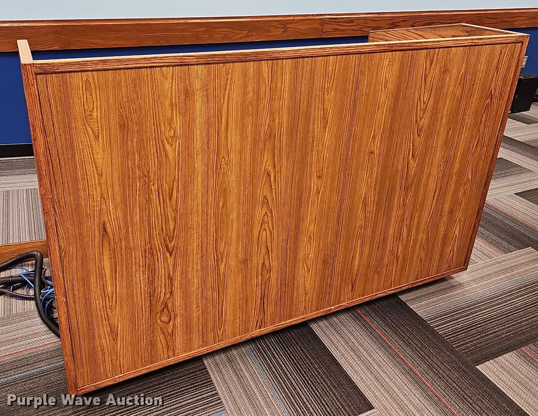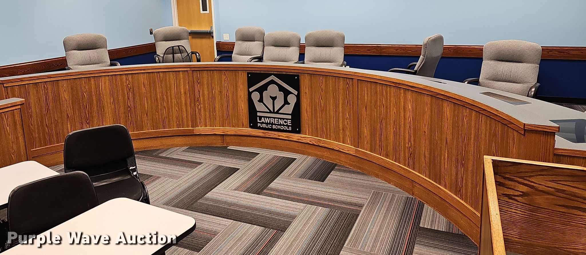 Purple Wave is selling a used Furniture in Kansas. This item is a Boardroom conference furniture with the following: 8'L x 26"W x 35"H table, 68"L x 25"W x 45"H podium, 20'3"L x 31"W x 24"H horseshoe table, Screen displays, Chairs not included, Cables not included, Wiring will be disconnected prior to auction