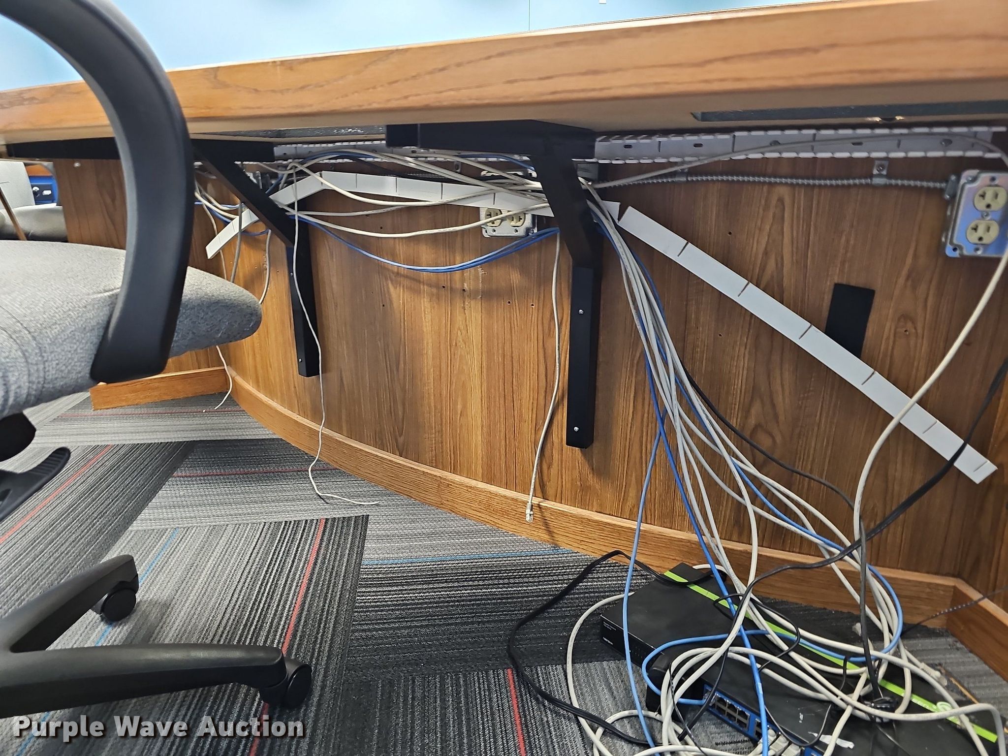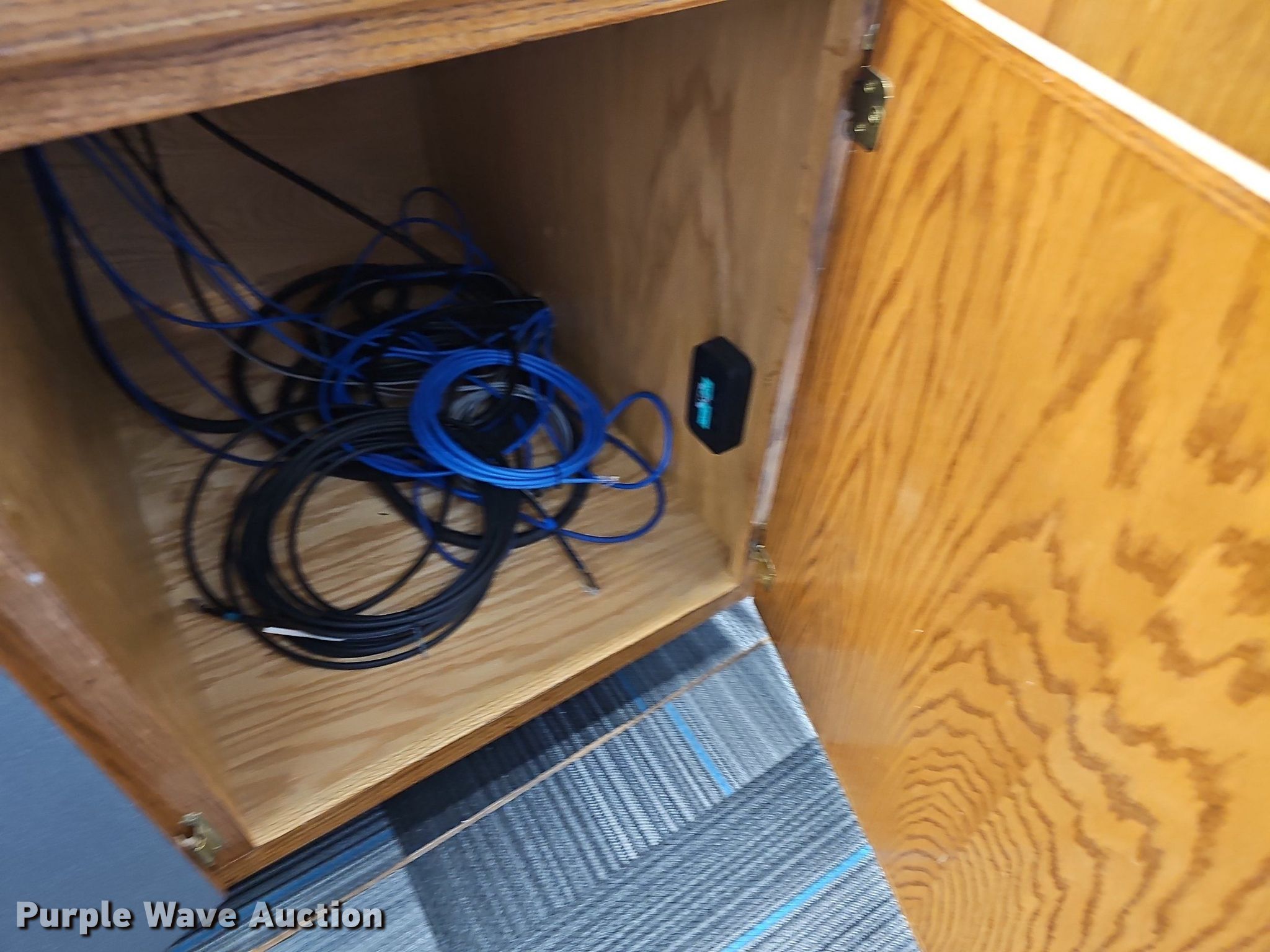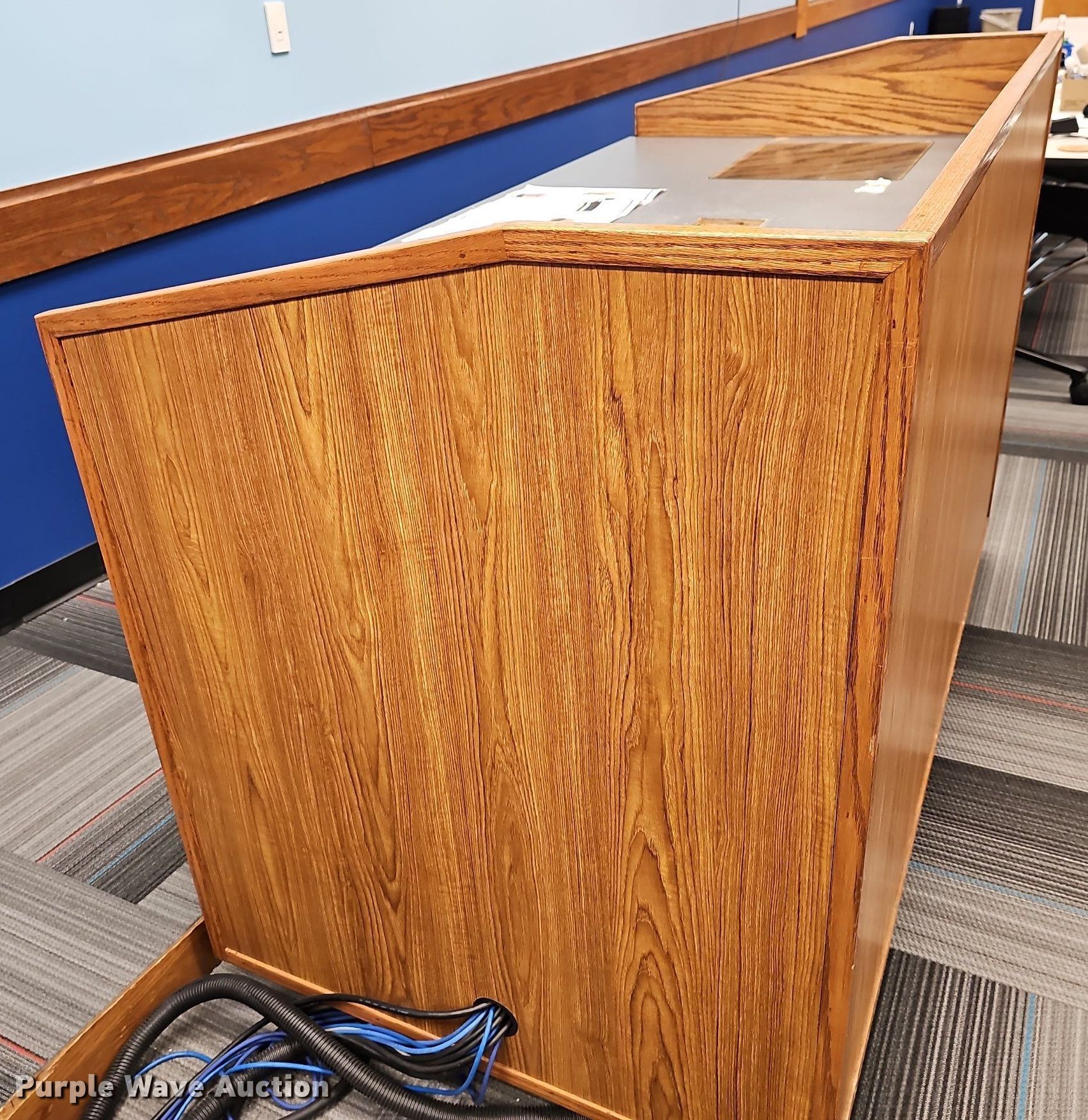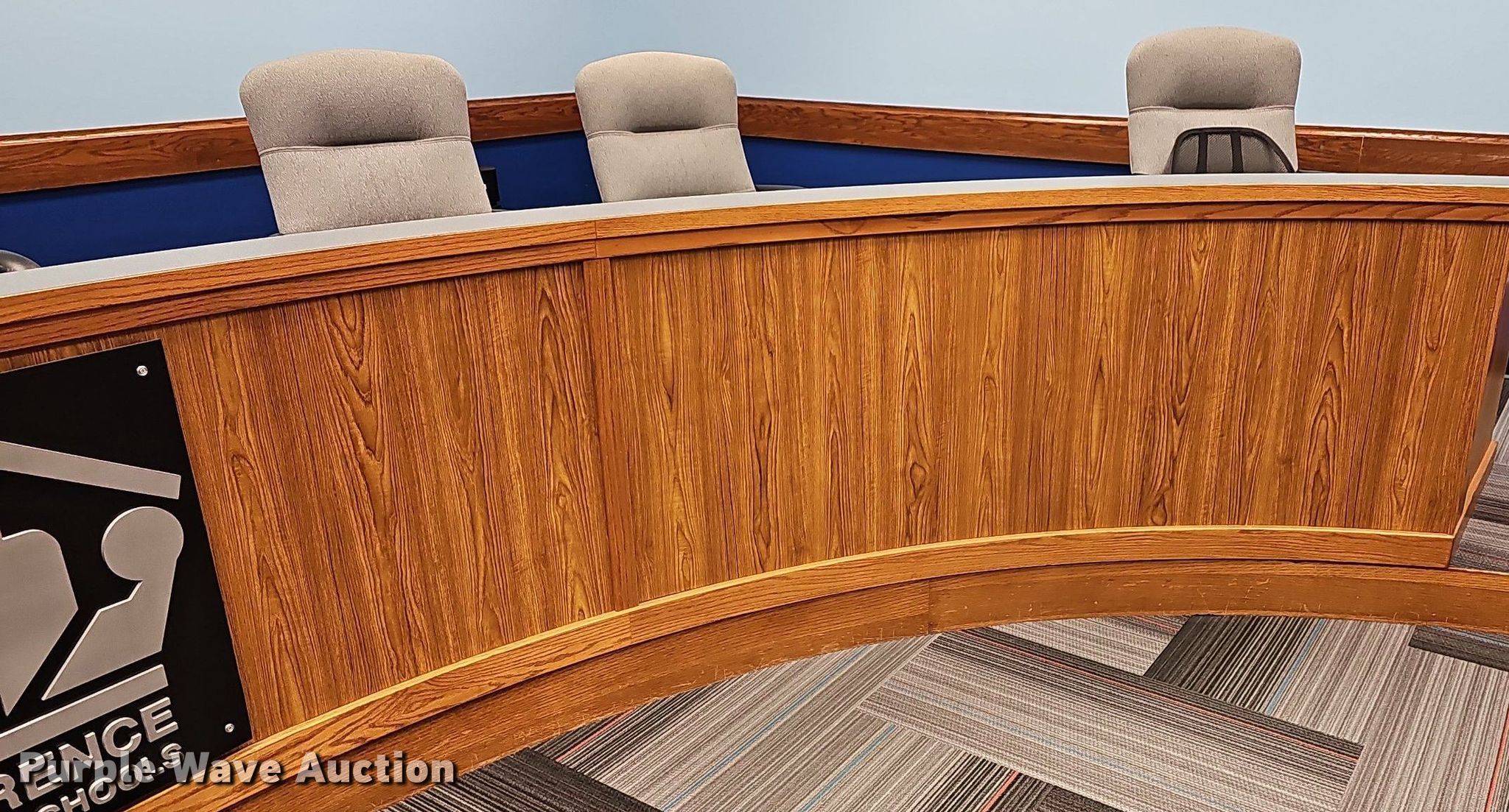 Purple Wave is selling a used Furniture in Kansas. This item is a Boardroom conference furniture with the following: 8'L x 26"W x 35"H table, 68"L x 25"W x 45"H podium, 20'3"L x 31"W x 24"H horseshoe table, Screen displays, Chairs not included, Cables not included, Wiring will be disconnected prior to auction