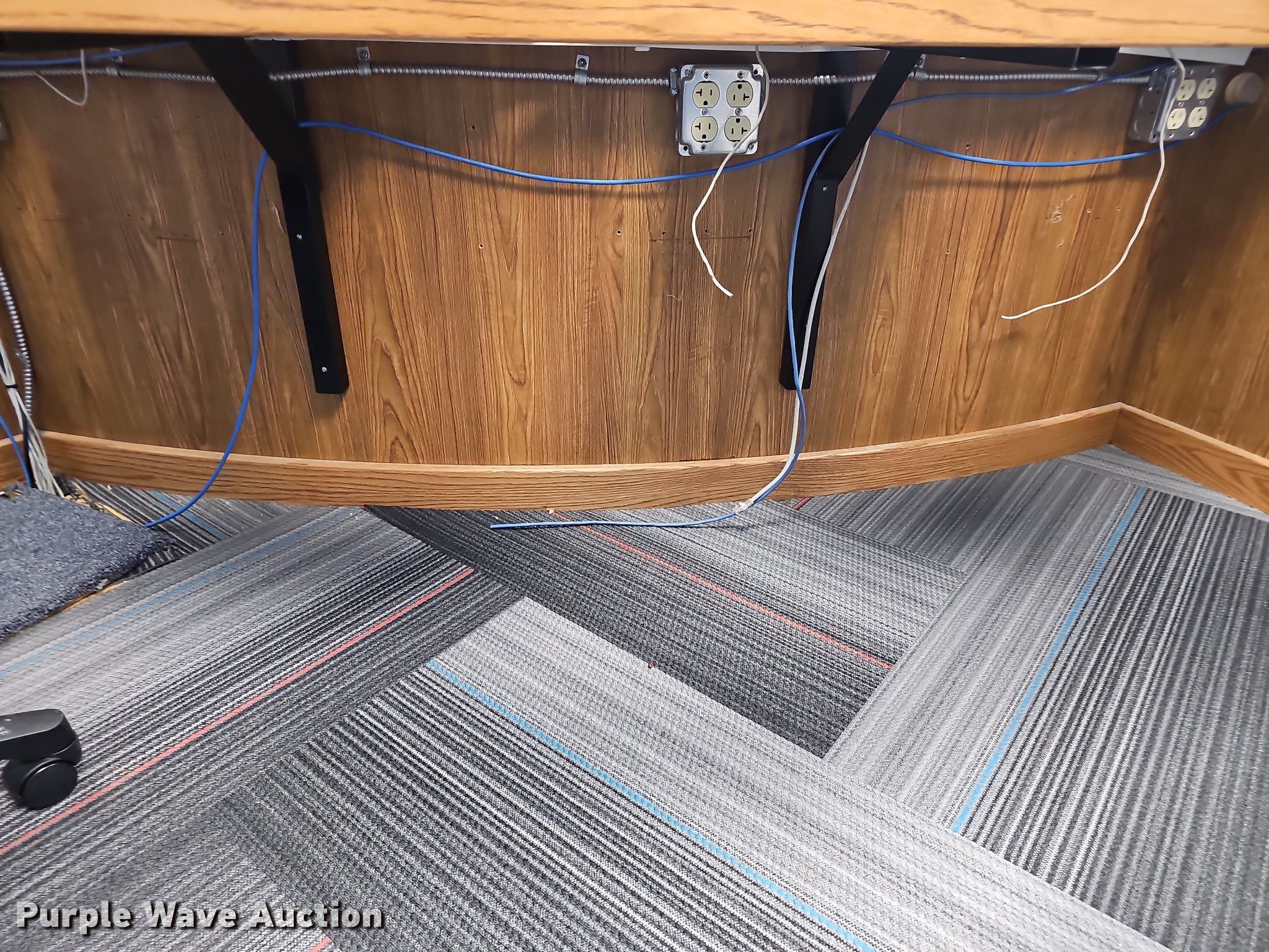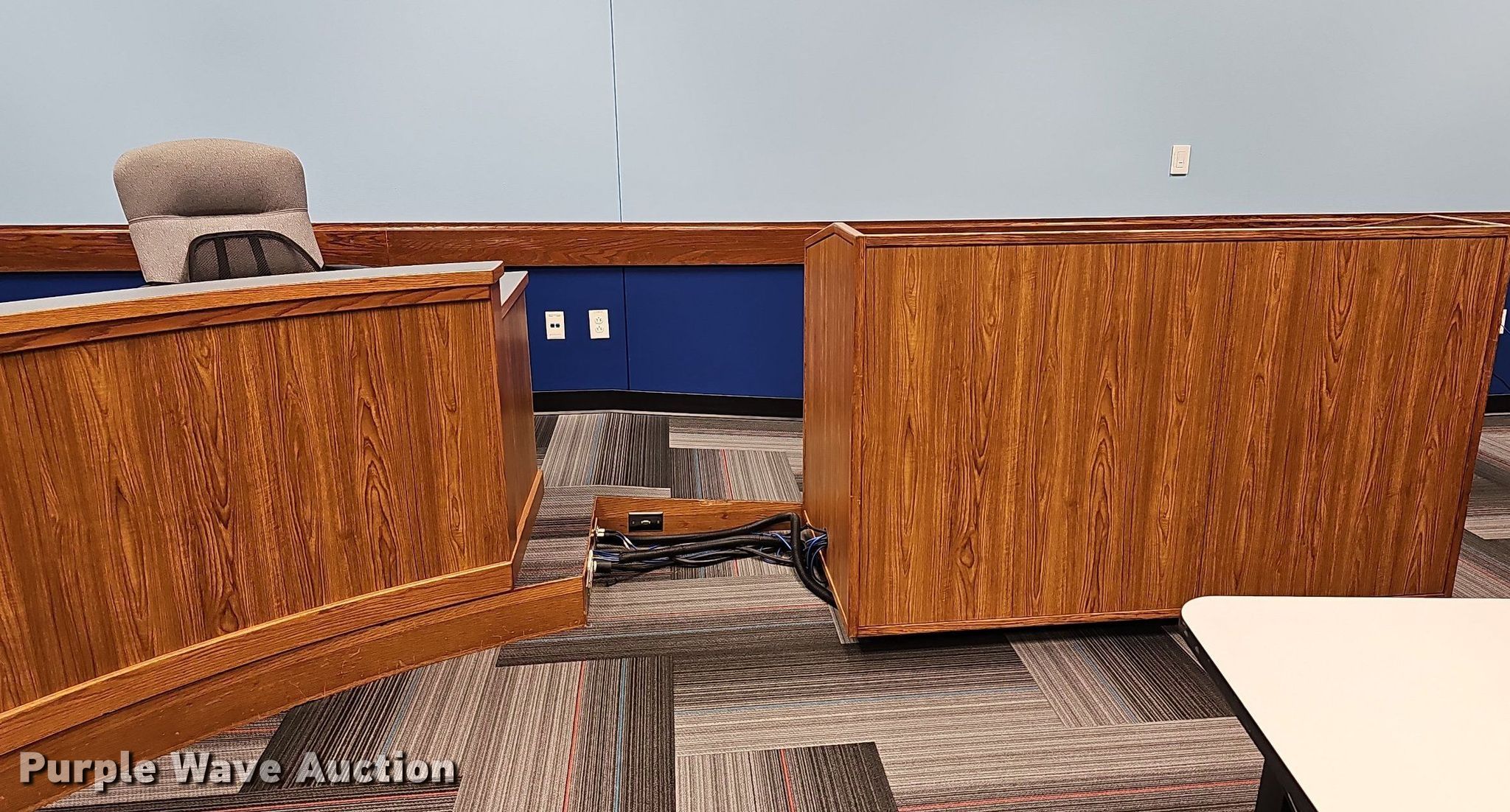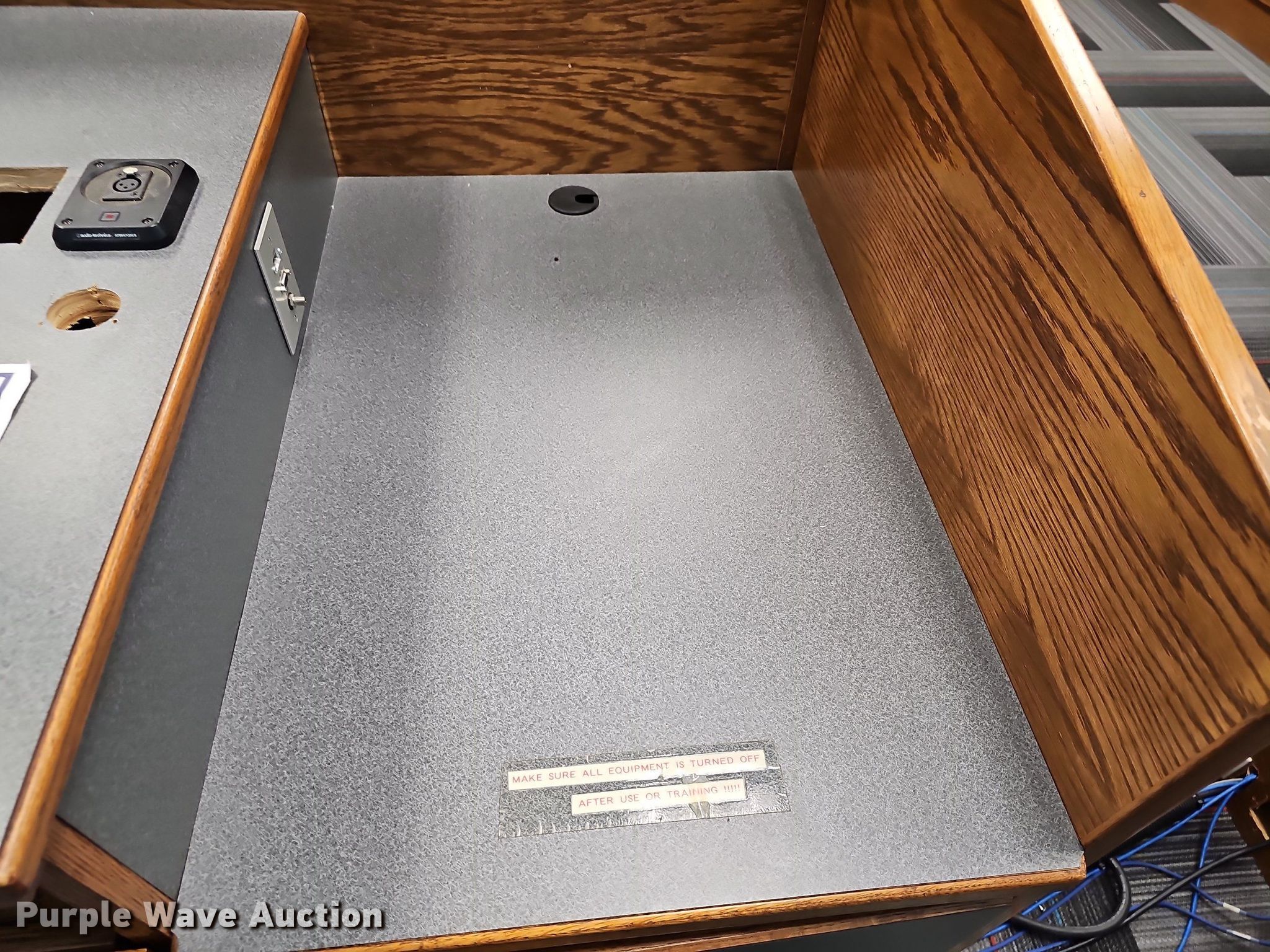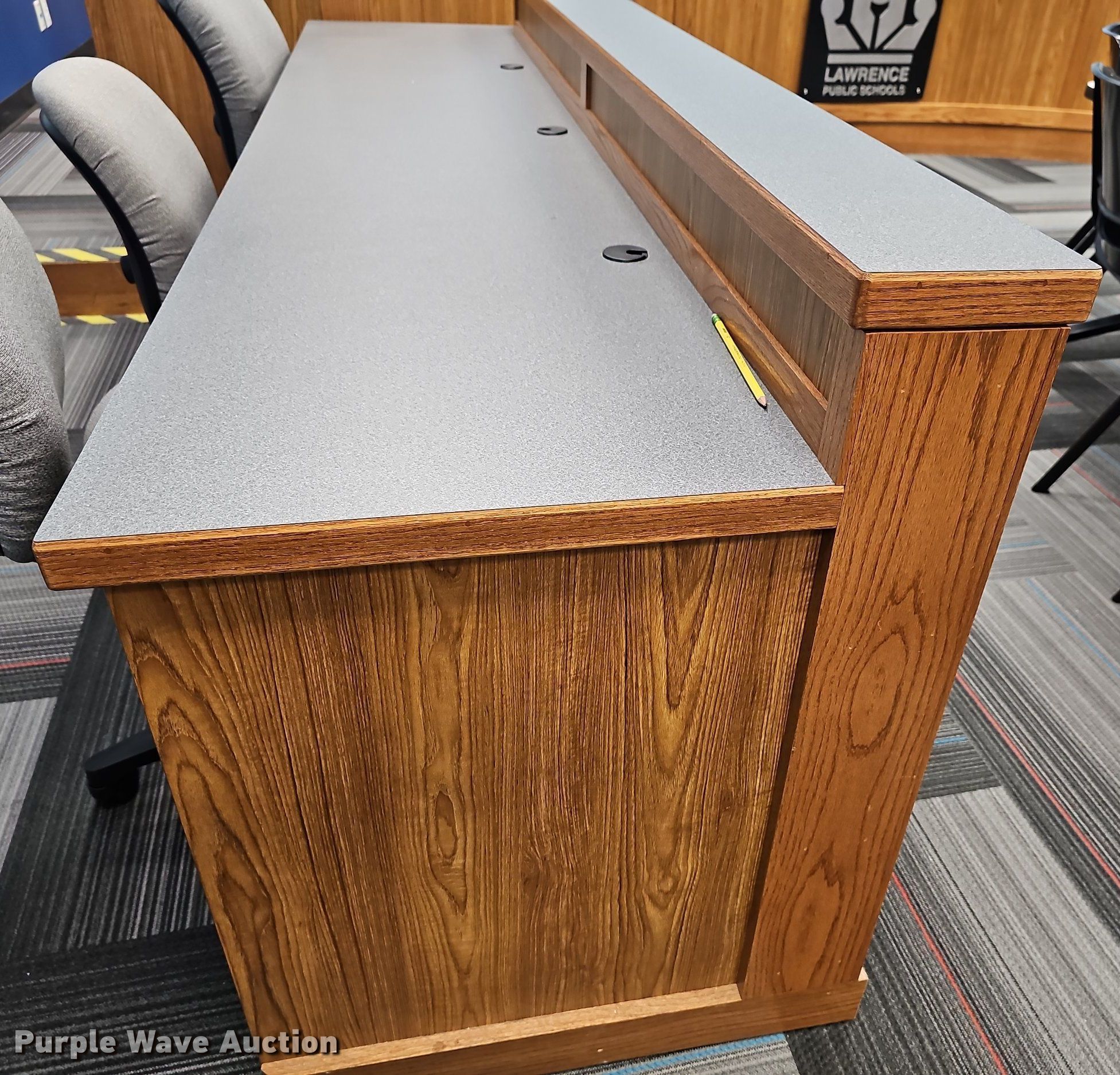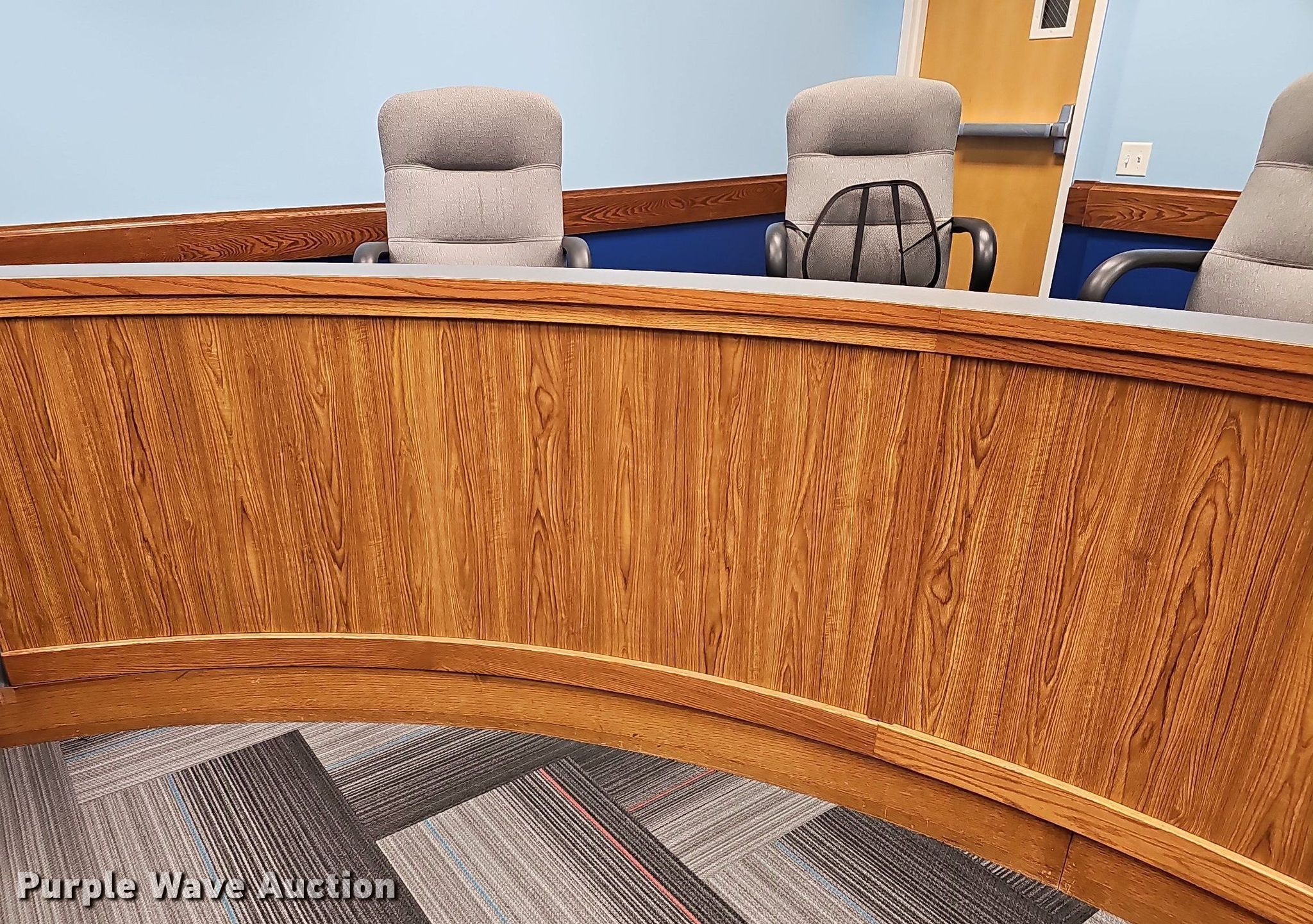 Purple Wave is selling a used Furniture in Kansas. This item is a Boardroom conference furniture with the following: 8'L x 26"W x 35"H table, 68"L x 25"W x 45"H podium, 20'3"L x 31"W x 24"H horseshoe table, Screen displays, Chairs not included, Cables not included, Wiring will be disconnected prior to auction
