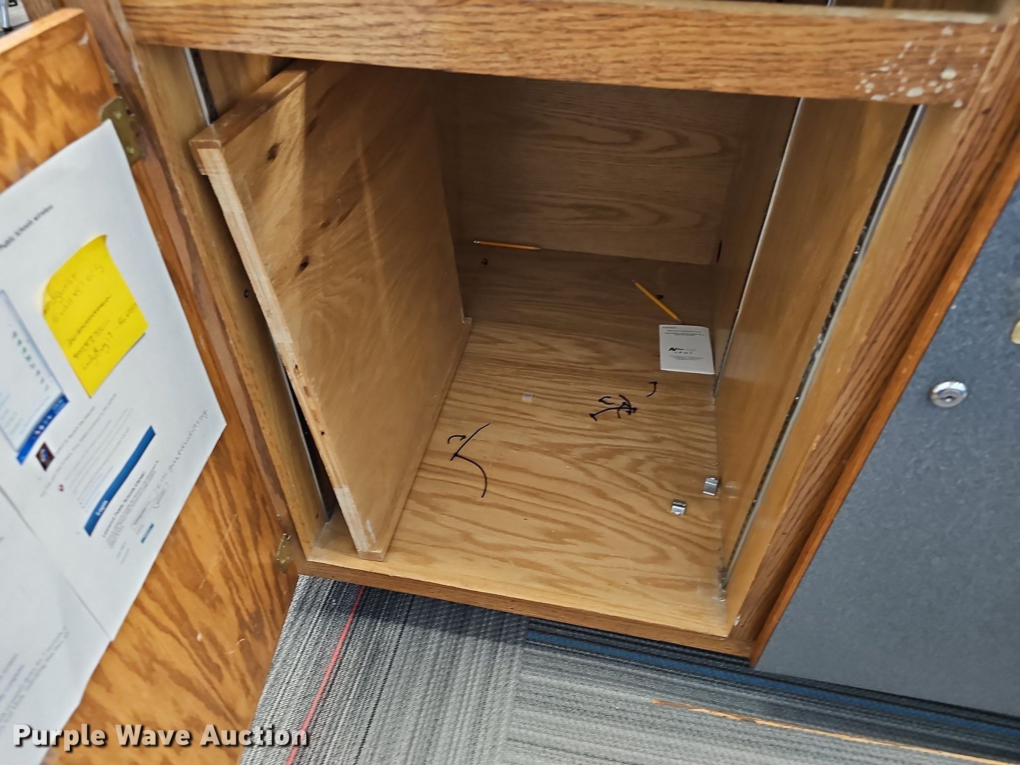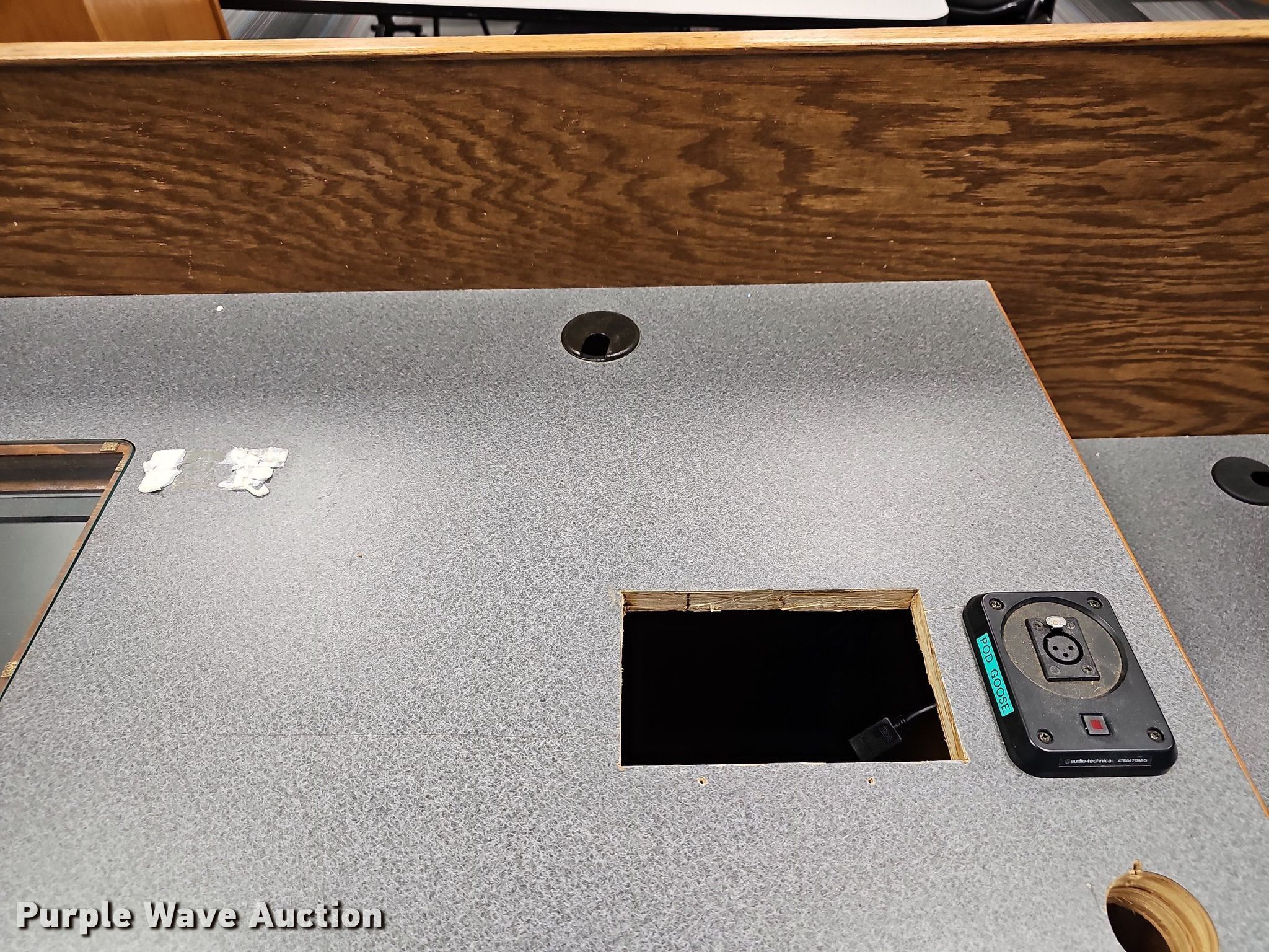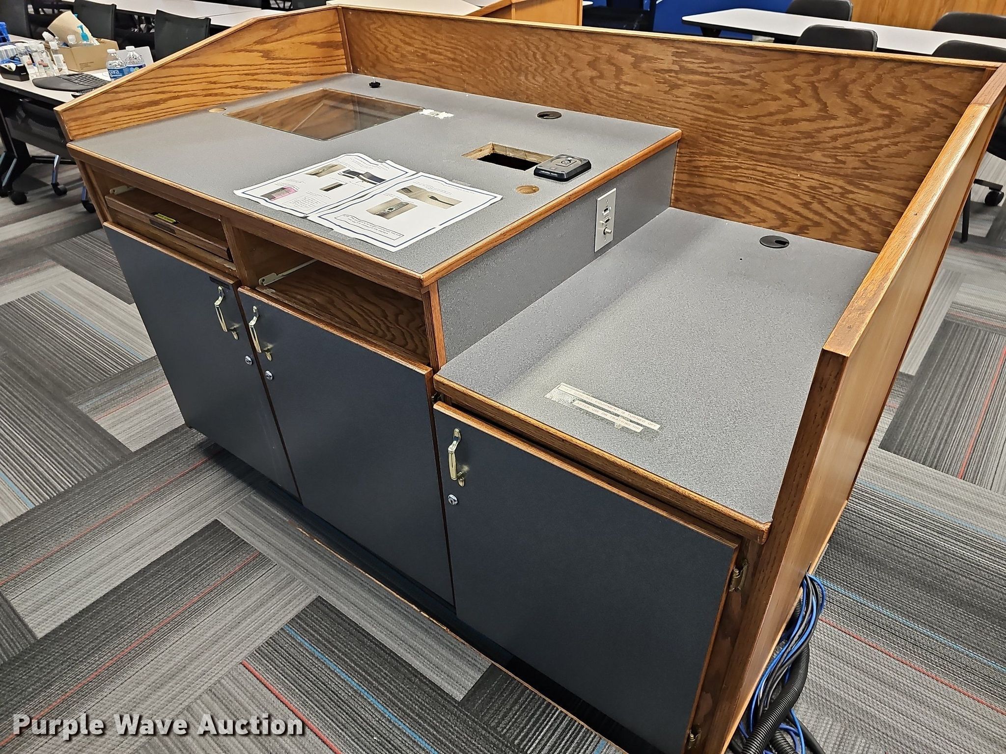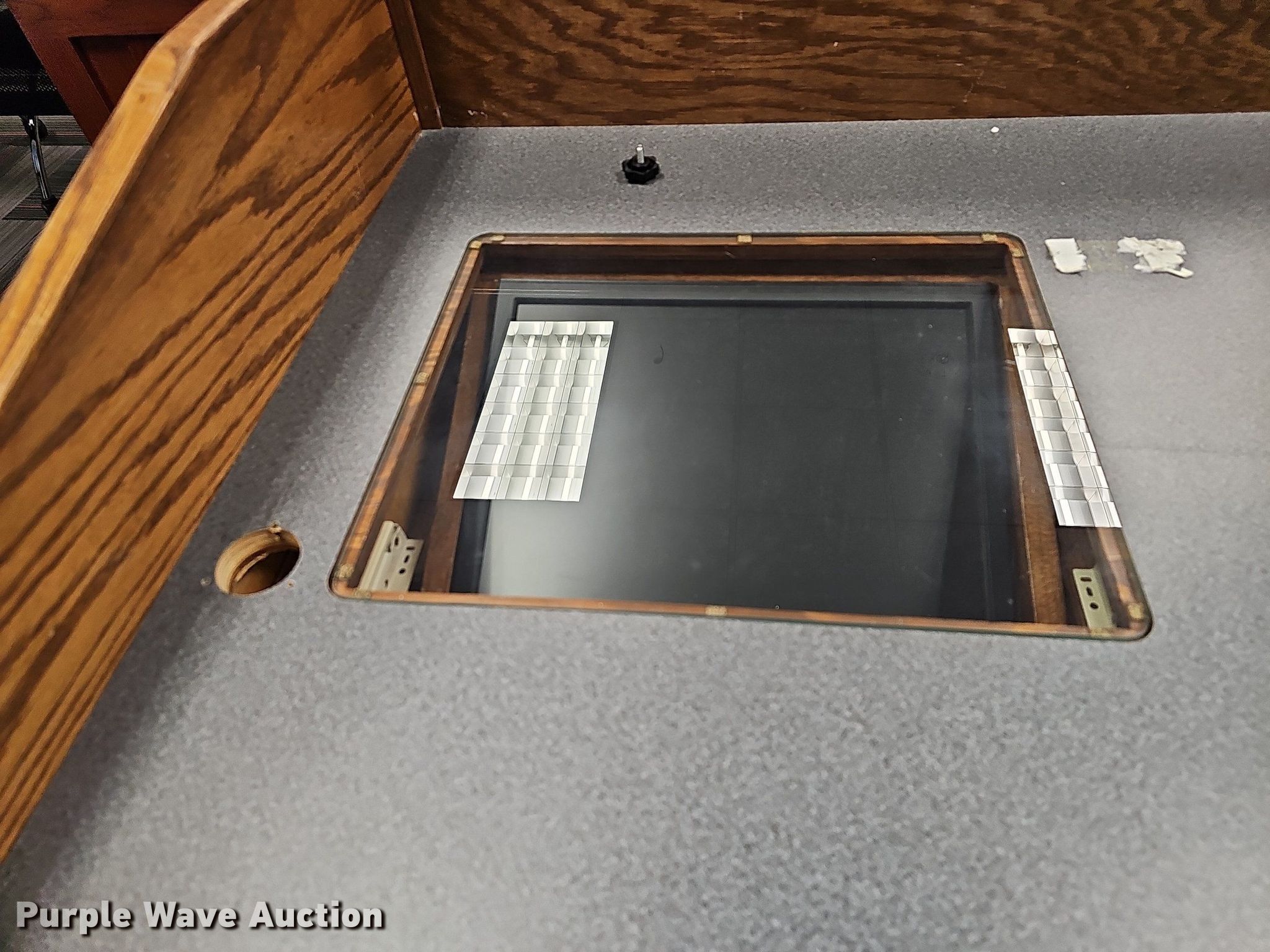 Purple Wave is selling a used Furniture in Kansas. This item is a Boardroom conference furniture with the following: 8'L x 26"W x 35"H table, 68"L x 25"W x 45"H podium, 20'3"L x 31"W x 24"H horseshoe table, Screen displays, Chairs not included, Cables not included, Wiring will be disconnected prior to auction
