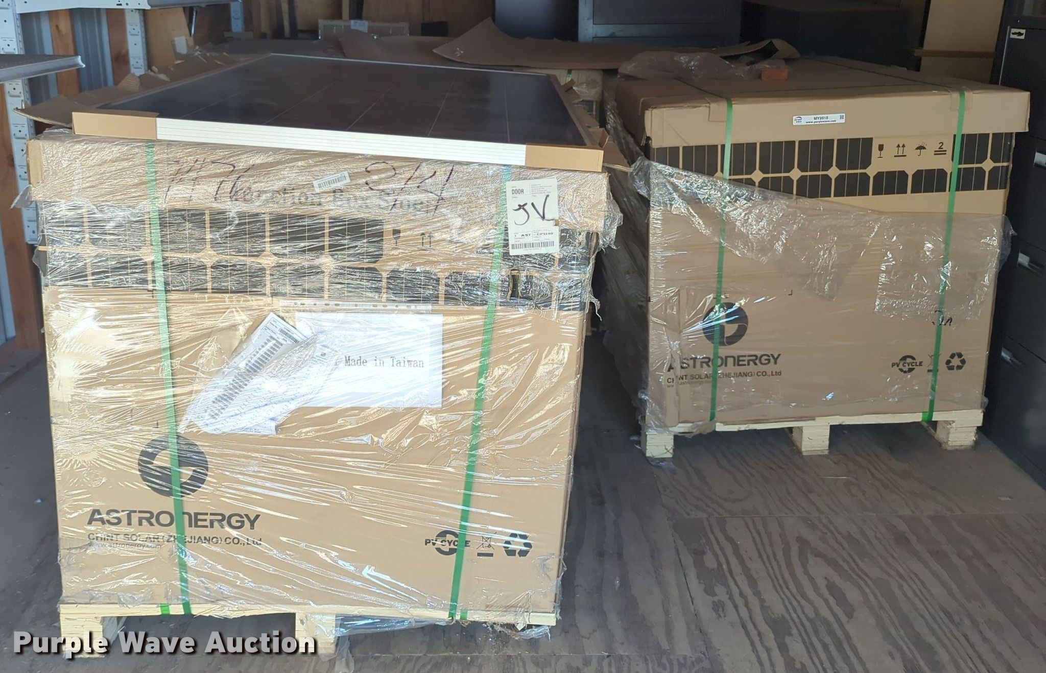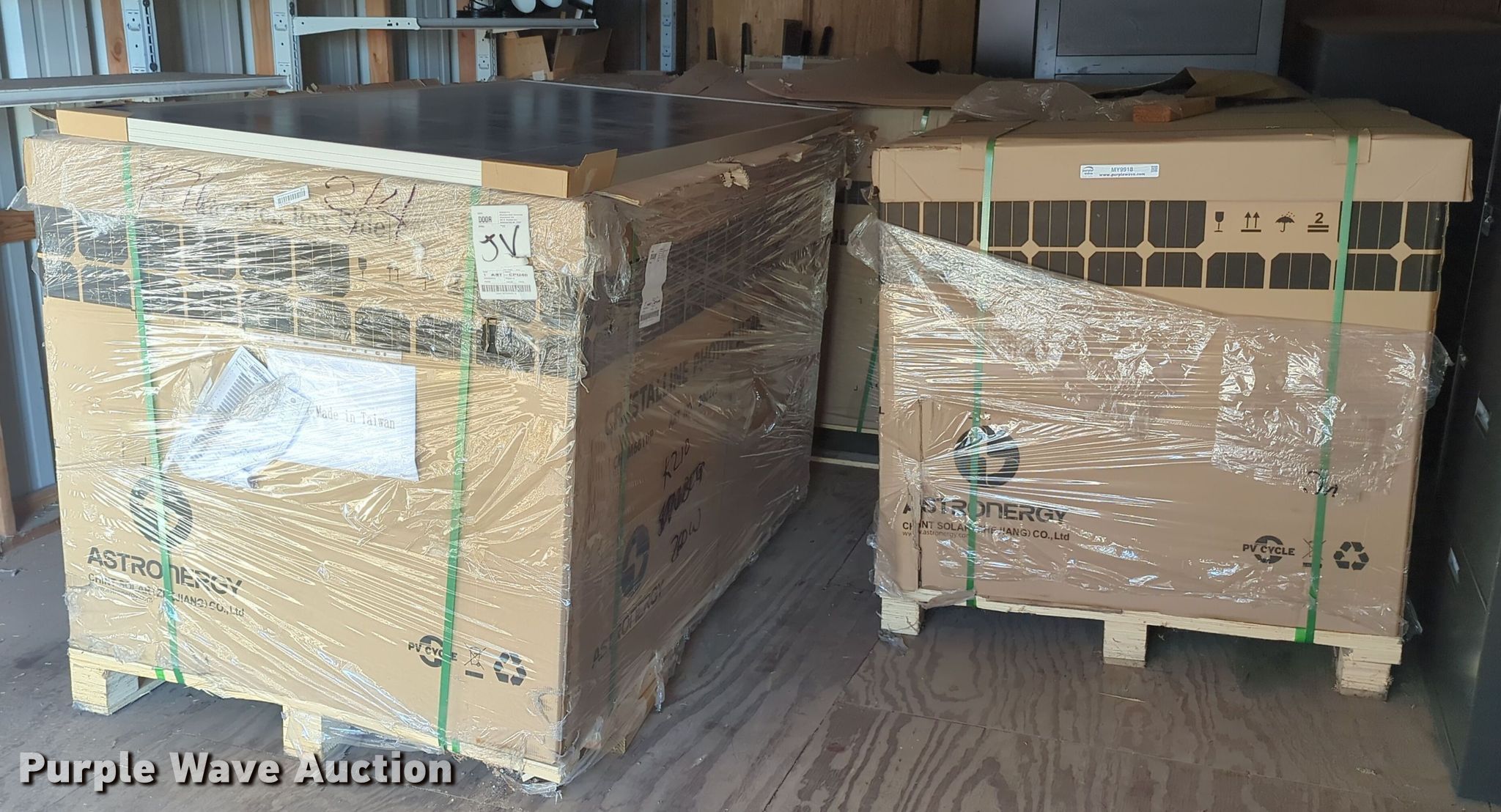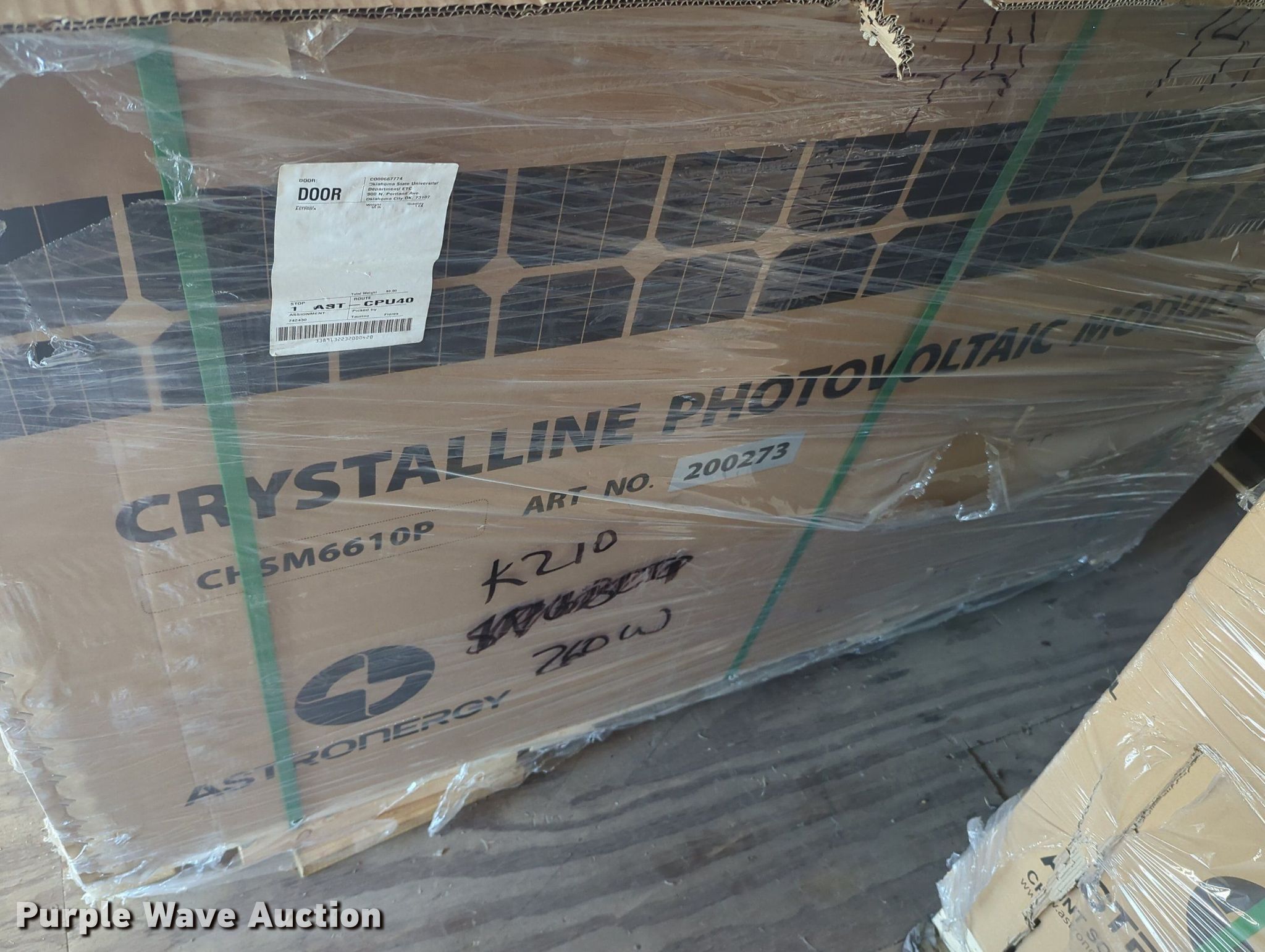 Purple Wave is selling a used Building Materials in Oklahoma. This item is a Approx. 75 Astronergy CHSM6610P solar panels with the following: Unused, Sale #: 2413-KP